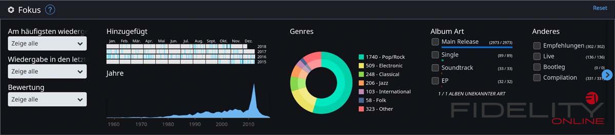Am oberen Bildschirmrand der Programmoberfläche findet man einige intelligente Filter. Am interessantesten ist sicher der „Fokus“, der statistische Daten zur Musiksammlung auflistet: Die Verteilung der Genres, die letzten gespielten Songs, was wurde am häufigsten wiedergegeben, welche Tonformate gibt’s in der Sammlung und vieles mehr. Klickt man hier beispielsweise auf die Jahreszahlen, kann man einen Zeitabschnitt eingrenzen, etwa die Dekade von 1975 bis 1985. Kehrt man anschließend in die Album- oder Interpreten-Übersicht zurück, werden nur noch jene Ergebnisse angezeigt, die innerhalb der gewählten Epoche veröffentlicht wurden. Über das oben geschilderte Zurücksetzen der Ansicht muss man sich dabei keine Sorgen machen: Die Hauptansicht bietet einen alphabetischen Index, über den man sofort zum gewünschten Buchstaben springen kann.