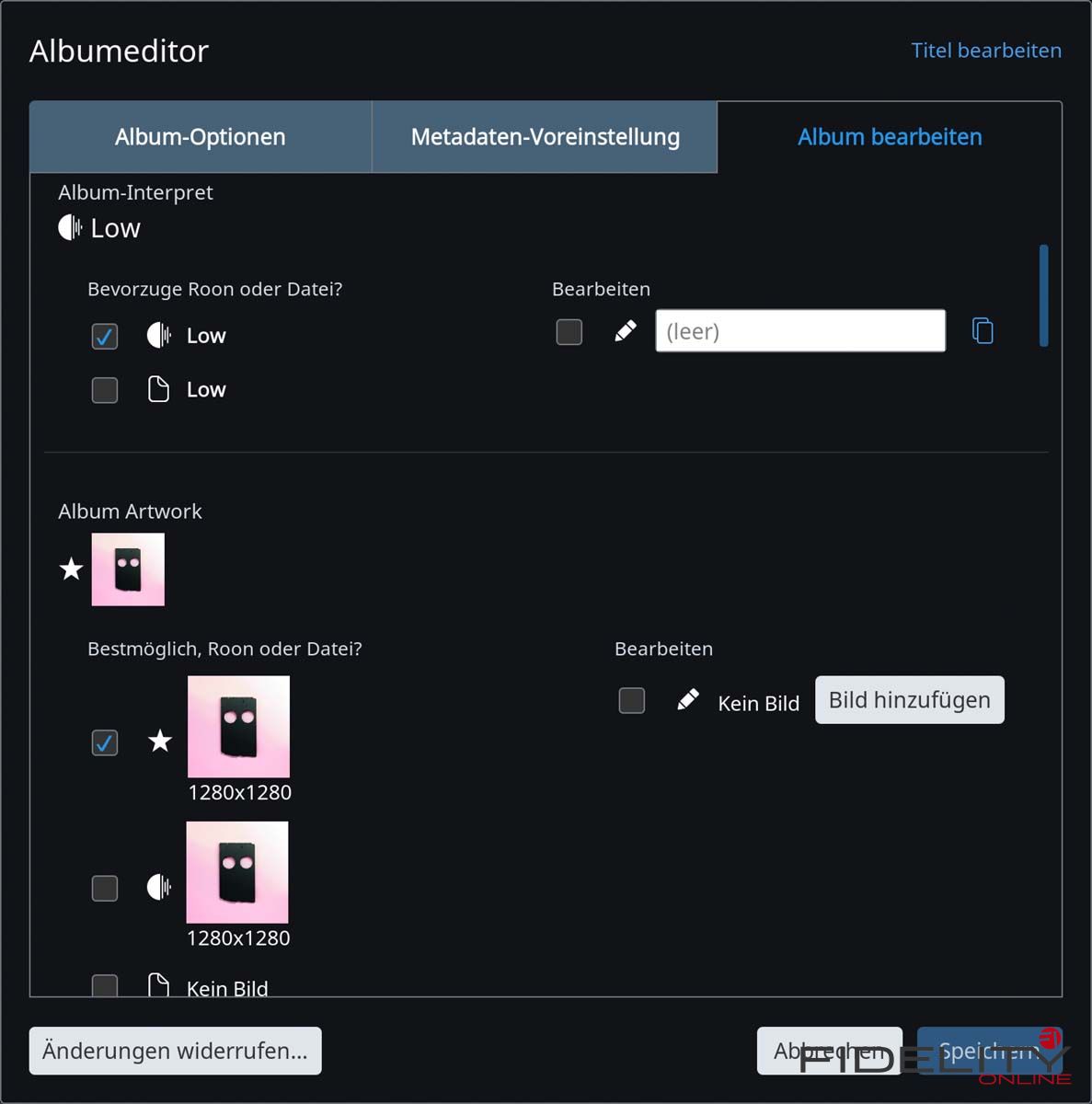 Die Software nagelt ihren Nutzer dabei nicht auf das vorgegebene Tagging-Modell fest. Über einen Rechtsklick (bzw. einen langen Druck auf dem Tablet) ruft man ein reduziertes Optionsmenü auf. Hier kann man Künstler und Album bearbeiten, Namen ändern, Coverbilder hinzufügen oder eigene Tags, Genres und Kategorien definieren. Im selben Fenster findet man eine Reihe hilfreicher Komfort-Features. So lassen sich Alben, sollte es doppelte Versionen geben, gezielt ausblenden. Wurde ein Tonträger beim Rippen in mehrere Alben zergliedert, kann man Roon zwingen, die Werkfragmente wieder zu einem homogenen Album zusammenzulegen.