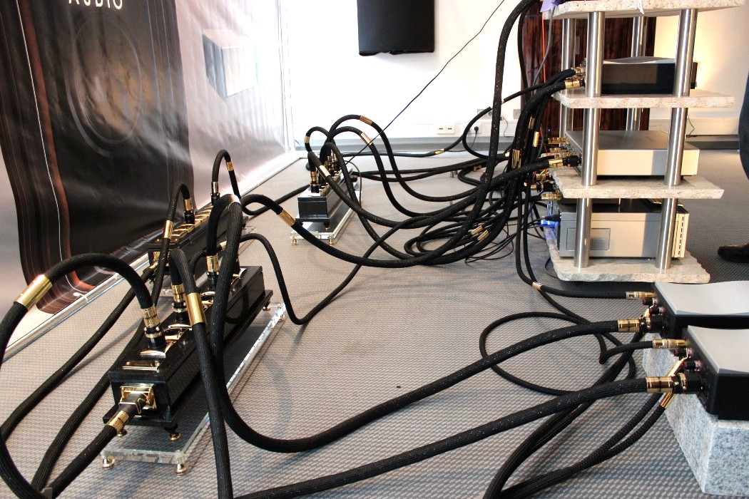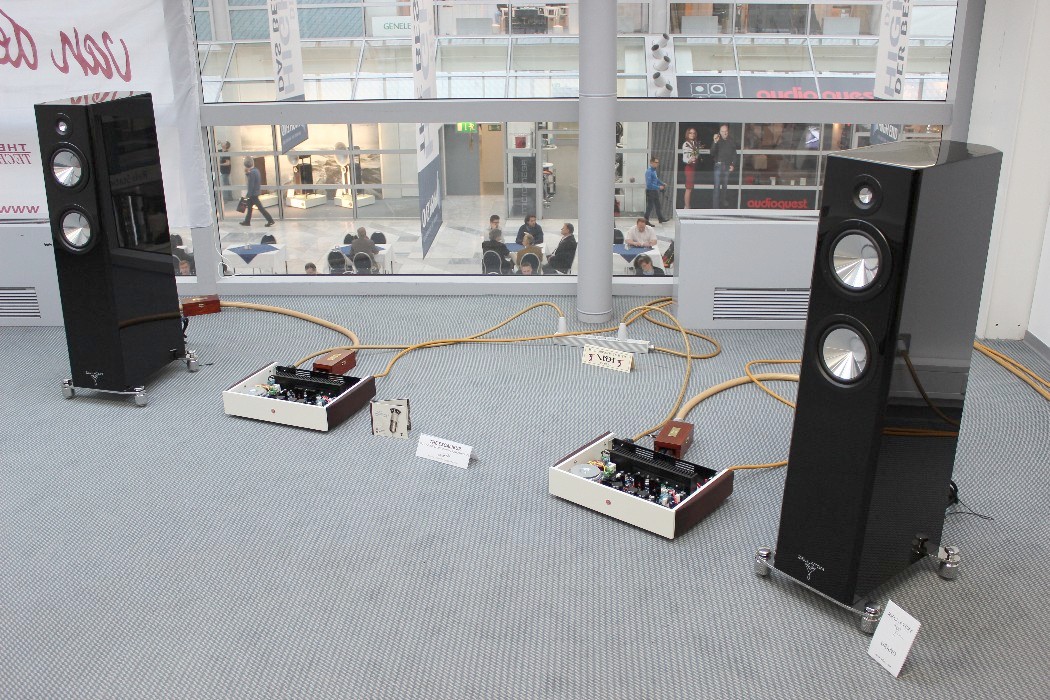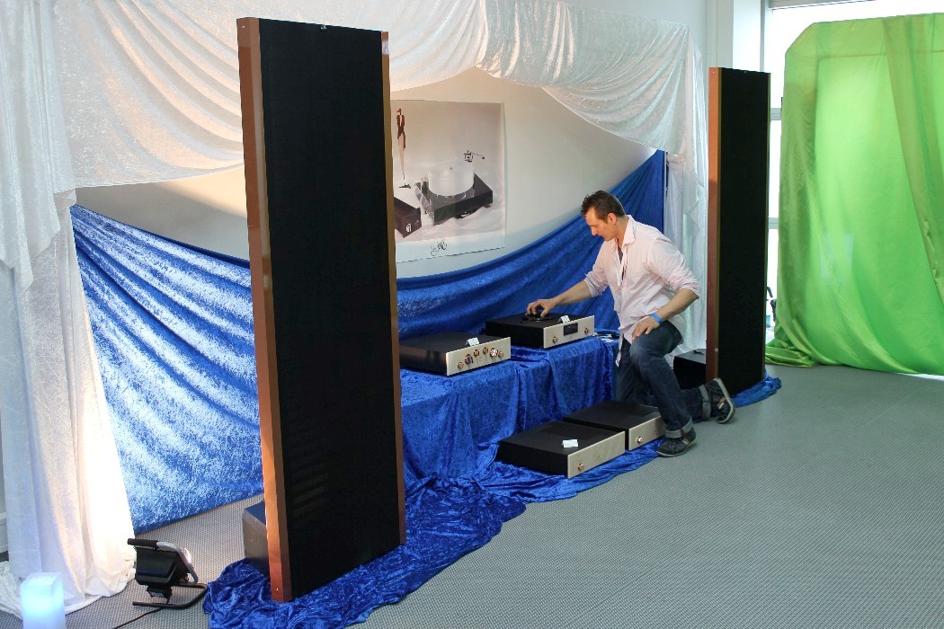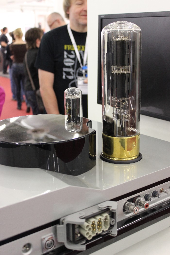 Offensichtlich ging es auf dieser Messe in erster Linie nicht um Musik. Kopfschüttelnd verließ ich zum Beispiel am Ende einen Raum, in dem seltsamerweise nur noch die vorderste Stuhlreihe frei war, als ich ihn betrat. Kaum hatte ich mich dort hingesetzt, forderte mich der Aussteller auf, meinen Platz zu verlassen. Ich sollte warten, bis die – scheinbar sehr wichtigen – Herren hinter mir ungestört fertiggehört hatten. Das fand ich zwar reichlich seltsam, aber da ich ohnehin noch Fotos machen wollte, griff ich zur Kamera und schickte mich an, die imposanten Monoendstufen von Audio Power Labs mit ihren riesigen 833er-Leistungsröhren aus der Nähe zu fotografieren. Aber selbst meine kurze Präsenz zwischen den Lautsprechern von Vivid Audio duldete der Vorführer – beziehungsweise die sehr wichtigen Herren – nicht und schickte mich erneut nach hinten. Mein Tipp: Nächstes Jahr bitte gleich ein „Zutritt verboten“-Schild an der Tür anbringen und den Anlagen in den angrenzenden Zimmern den Strom abdrehen. Ist ja schließlich eine Messe, da will man halt seine Ruhe haben, gell?