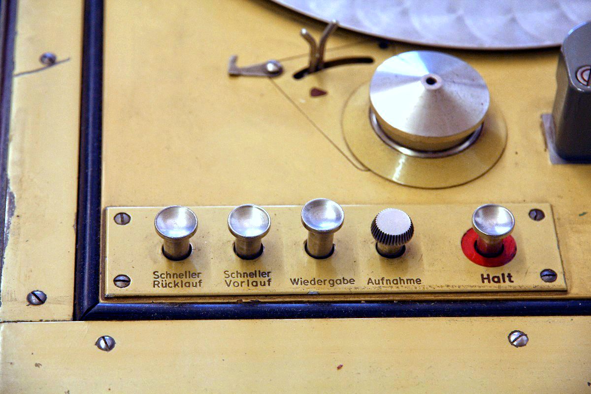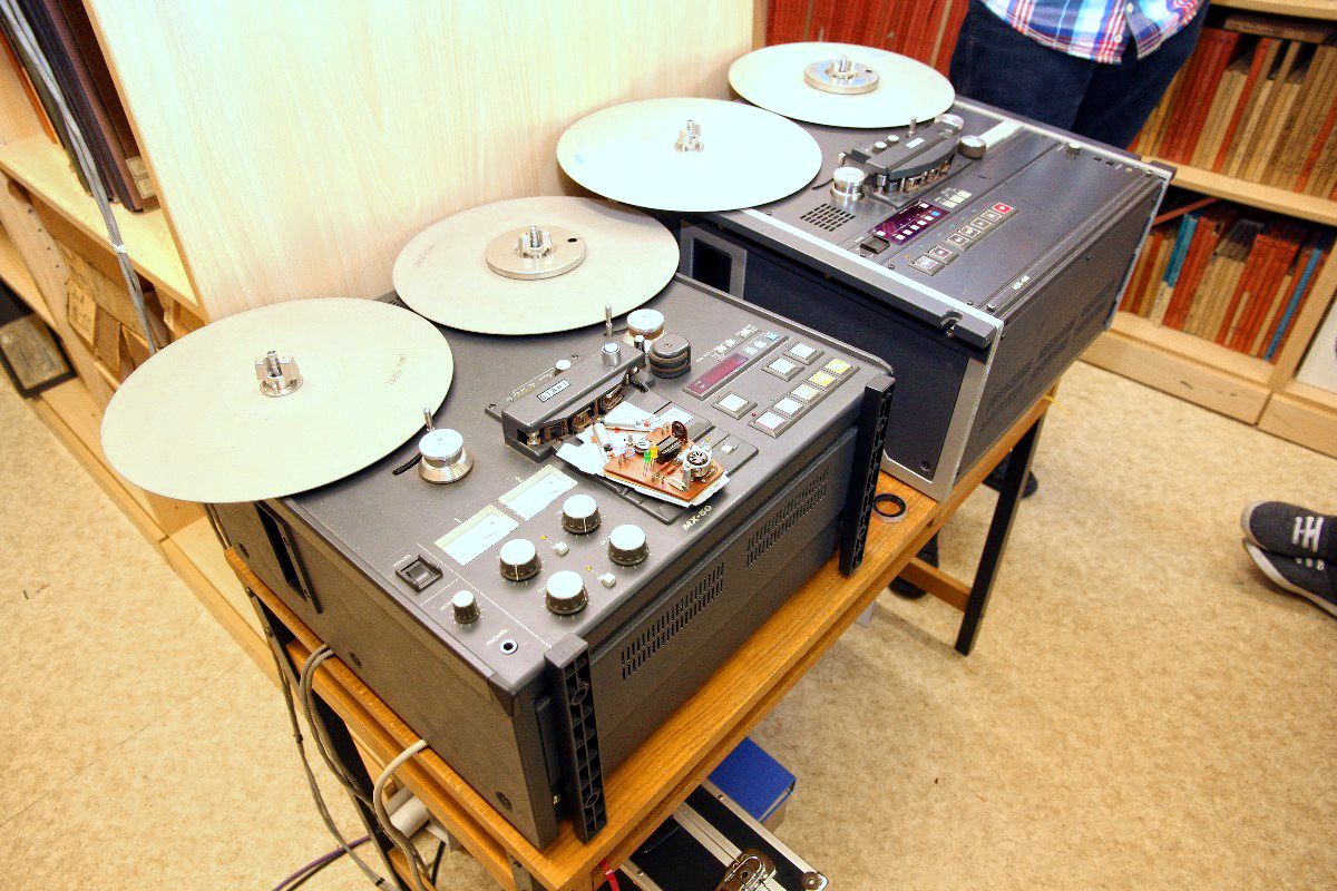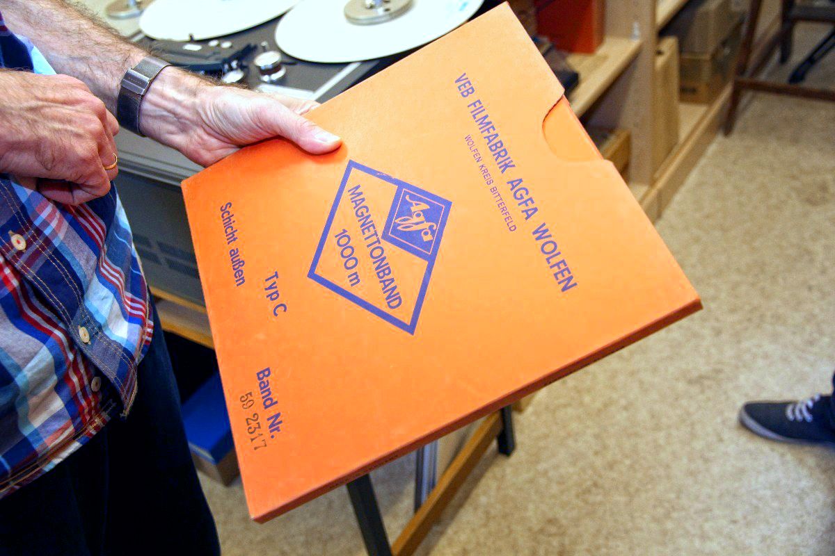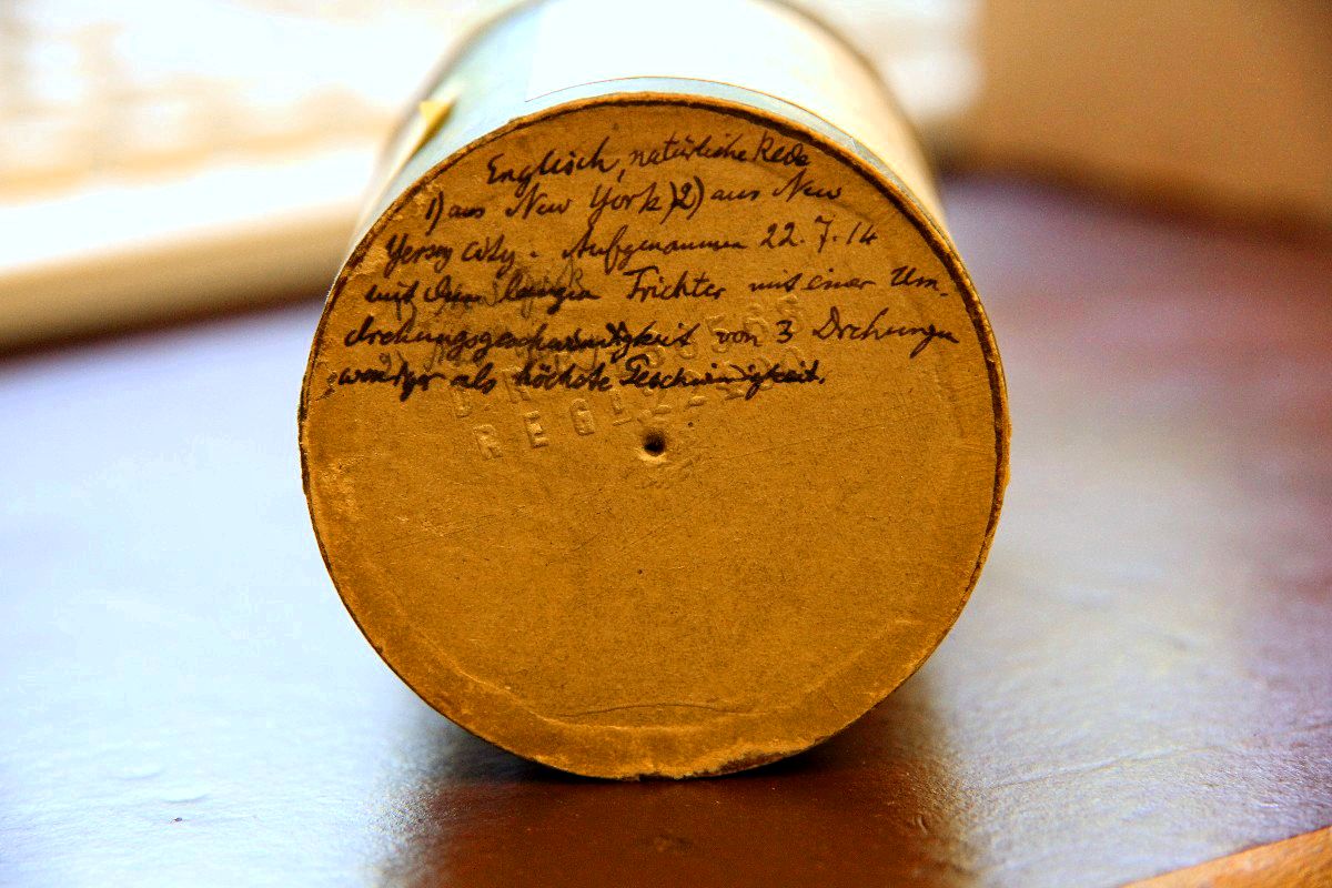 In dem nur knapp 20 Quadratmeter großen Raum versammeln sich wahre Schätze des aufgezeichneten Wortes, von besagten Wachswalzen, die hier nur mit weißen Handschuhen angefasst werden und von teils wunderschönen Verpackungen mit handschriftlichen Notizen umhüllt sind, über Schallplattenraritäten bis hin zu Tonbändern in den markentypisch orangenen Schachteln von AGFA. Etliche davon stammen aus der DDR-Produktion von AGFA Wolfen und sind daher auf der Rückseite in bruderstaatlichem Kyrillisch bedruckt. Zwei Spezialmaschinen erregen hier die Aufmerksamkeit des geneigten Audiomenschen. Erstens ein in den USA modifizierter Technics-Plattenspieler, der jeden DJ neidisch machen sollte, weil er von Faststillstand bis weit über 78 Umdrehungen pro Minute alle Geschwindigkeiten stufenlos beherrscht und exakt anzeigt. Zweitens eine rustikale modifizierte Tonbandmaschine von Otari mit ersten Gehversuchen zum digitalen Samplen kleinerer Sprechpassagen.