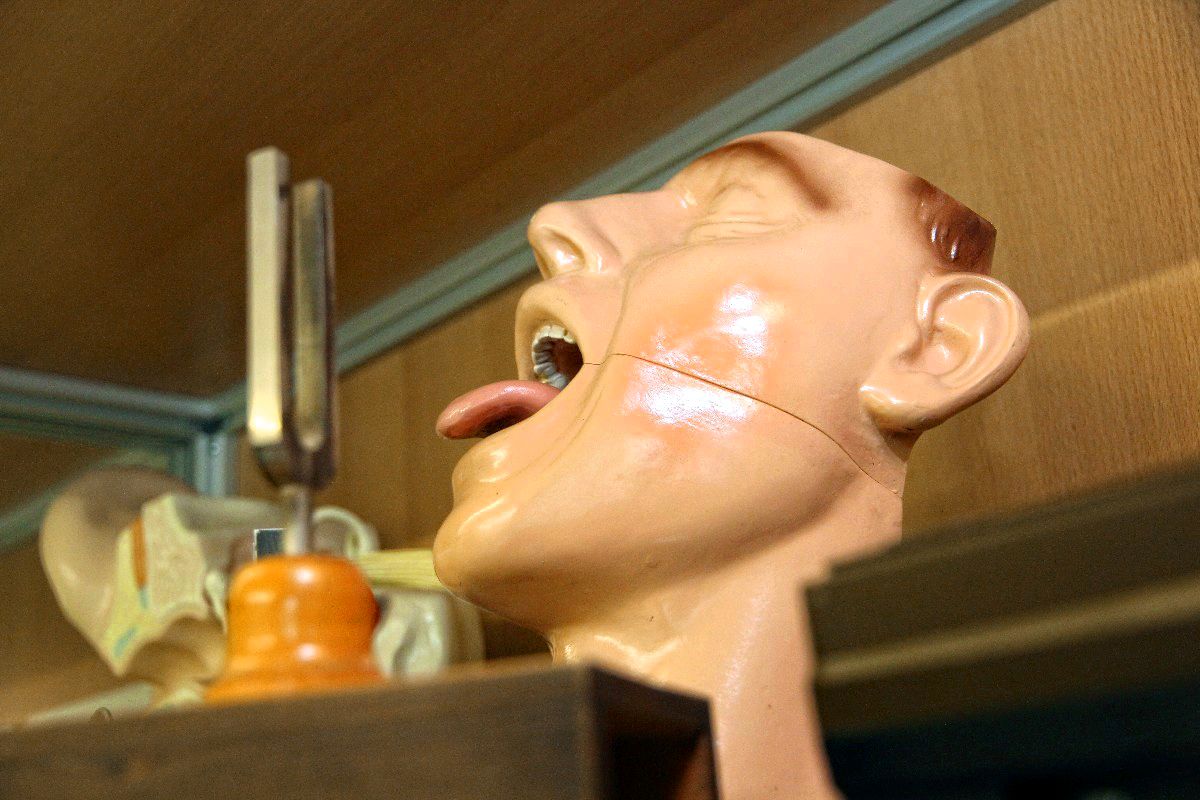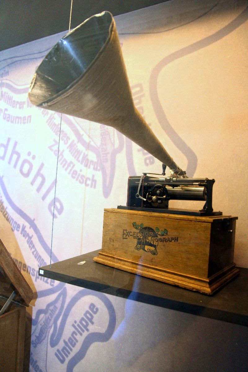 Ein Stockwerk tiefer betreten wir einen etwas größeren Raum, dessen „Computer-Pool“ durch eine ganze Schrankwand mit Vitrinen kontrastiert wird. Ein simpler Horntrichter hängt lässig von links oben in die Szenerie hinein. Ein funktionsfähiges Kymograph(ion) stellt vermutlich das älteste Exponat dar, es geht auf ein Modell des frühen 19. Jahrhunderts zurück. Im Gegensatz zum späteren Phonographen dient ein Kymograph zur grafischen Aufzeichnung von Schallwellen, beherrscht aber nicht deren Wiedergabe. Einige Kuriositäten und Spezialitäten runden die kleine, unstrukturierte Nabelschau hinter Glas ab, etwa eine Schallplatte von 1937, auf der Wangerooger Friesisch zu hören ist, aber auch plastische Modelle von Erkrankungen der Atemwege – zusammen mit teils sehr humorvollen Schautafeln eine klare Erinnerung, dassman sich sich interdisziplinär um phonetische Störungen des Menschen kümmert.