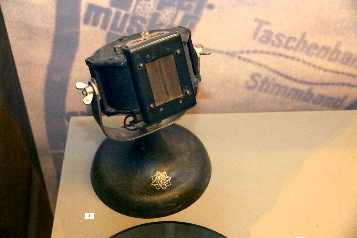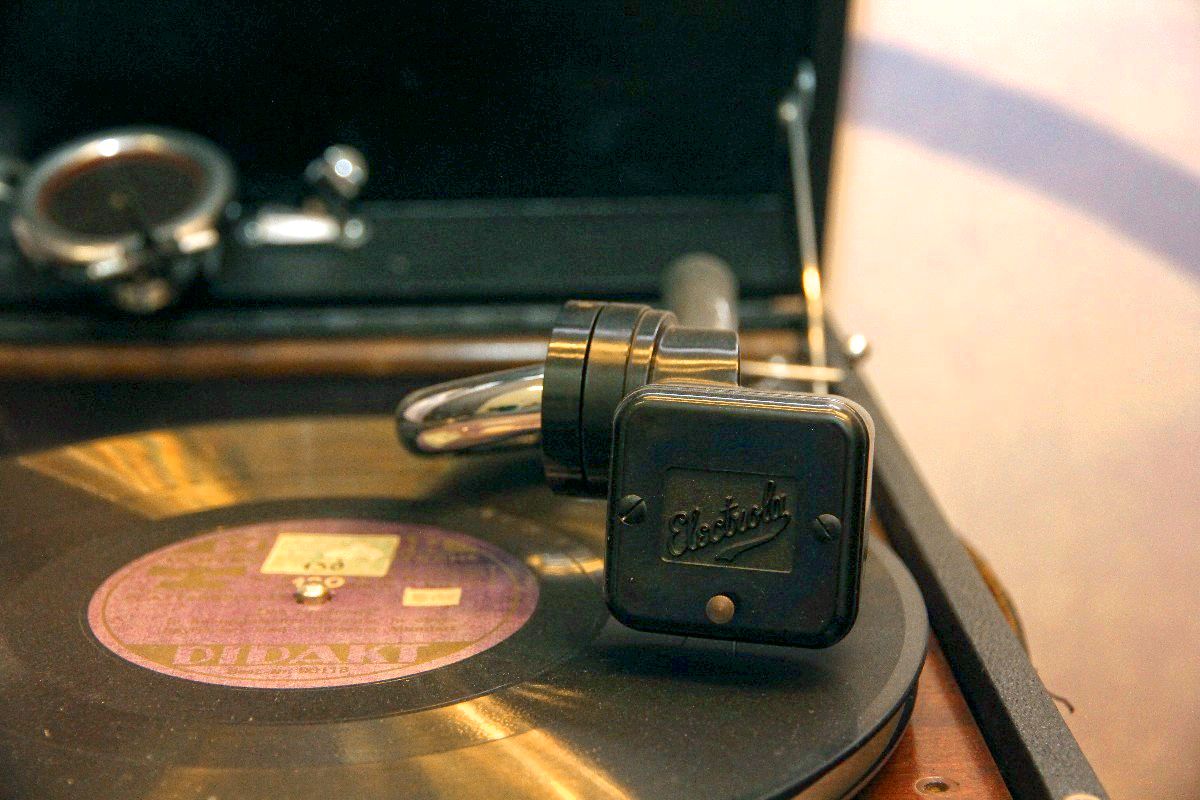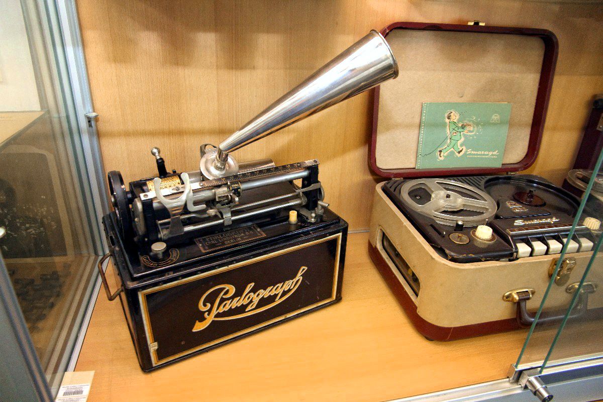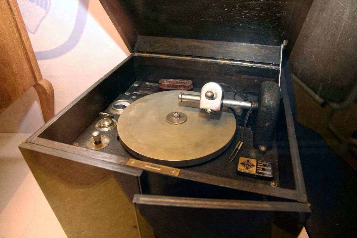 Im erweiterten Eingangsbereich der Villa sind dann tatsächlich ein paar optische Highlights des Instituts hinter schwerem Glas arrangiert: von einem kleinen Abspielgerät der Firma Stollwerk für die nur kurzzeitig erhältlichen Schokoladen-Schallplatten (garantiert ungenießbar) über frühe Freizügigkeiten der Marke Electromophon bis hin zu schwerem Aufnahmegerät samt Zubehör – die ganze Vitrine ist ein echter Hingucker und steht zu Recht an dieser prominenten Stelle.