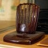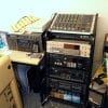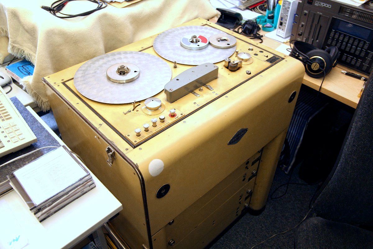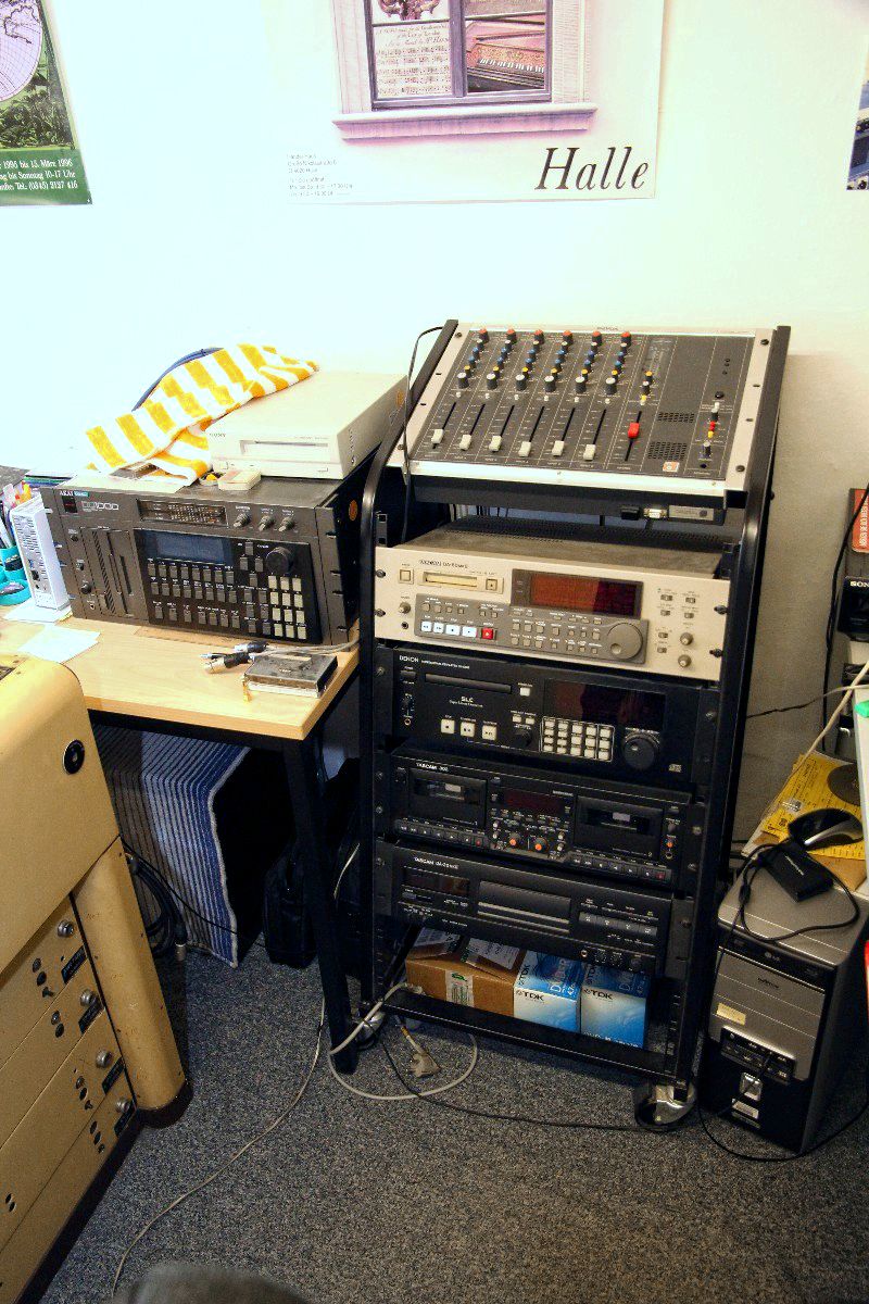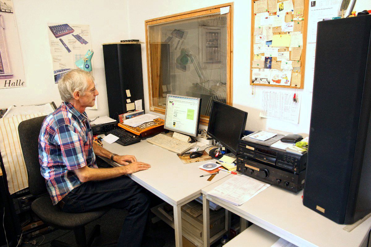 Also sind Technik und Tonträger im ganzen Institut über mehrere Stockwerke verteilt. Die wertvolle Wachswalzensammlung ist derzeit sogar außer Haus, die noch spielfähigen Walzen werden von den Kollegen in Berlin aufwändig digitalisiert. Gleichwohl sind immer noch genug Wachswalzen in Halle (Saale) vorhanden: interessante „Bruchstücke“ oder defekte Exemplare ruhen unten im Archivraum, den wir später besichtigen werden. Peter Müller beginnt den kleinen Rundgang der Einfachheit halber in seinem Büro. Die eine Hälfte des ansonsten höchst unauffälligen Raums ist von überwiegend professionellen Audio-Gerätschaften besetzt, darunter auch ein Vanille-farbenes Tonbandmonster mit „Tonmechanik“-Plakette und gebieterischem „Halt“-Knopf. Mit handfestem Werkzeug entriegelt Peter Müller zwei Einschübe im Unterbau der DDR-Bandmaschine und selbstredend kommen Röhren für die Signalverarbeitung zum Vorschein. Sein zweiter Schreibtisch steht unmittelbar vor einer Doppelscheibe, direkt dahinter befindet sich eine kleine Sprecherkabine, in der das Mikrofon ganz klar das Highlight der Ausstattung darstellt. Als Monitoranlage auf dem Schreibtisch, mit der auch digitale Bearbeitungen anderer Tondokumente vorgenommen werden, fungiert eine nicht mehr ganz taufrische und leicht überdimensionierte HiFi-Anlage aus Pioneer- und Quadral-Komponenten.