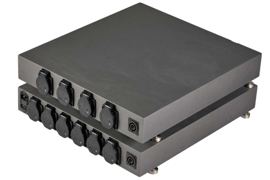 Die beiden Gehäuse des Gondor – der Referenz-Isolator der britisch-griechischen High-End-Schmiede kommt zweiteilig daher – wurden auf einer Hochpräzisions-CNC-Maschine gefräst, inklusive der schön anzuschauenden vertieften Signal-Projects-Schriftzüge. Einer der beiden grauen Quader ist mit „PCU“ beschriftet, der andere mit „HCFU“. Die Idee der beiden per Spezialkabel verbundenen Stromzentralen: In den PCU kommen normale Verbraucher wie Vor- und Endverstärker mit überschaubarem Stromhunger, außerdem digitales Equipment wie CD-Laufwerke, DACs und Streamer. Der HCFU ist echten Stromfressern wie Class-A-Endstufen vorbehalten. Und weil das Gesamtsystem doch recht heftig Strom zieht, empfiehlt Chefentwickler Nick Korakakis, den Gondor im Hausstromnetz mindestens mit einer 36-Ampere-Sicherung zu schützen. Ein kleiner dimensionierter Automat könnte nämlich herausfliegen, warnt Korakakis, der in Sheffield studiert hat und von Technik-Voodoo rein gar nichts hält.