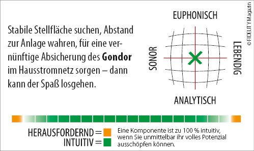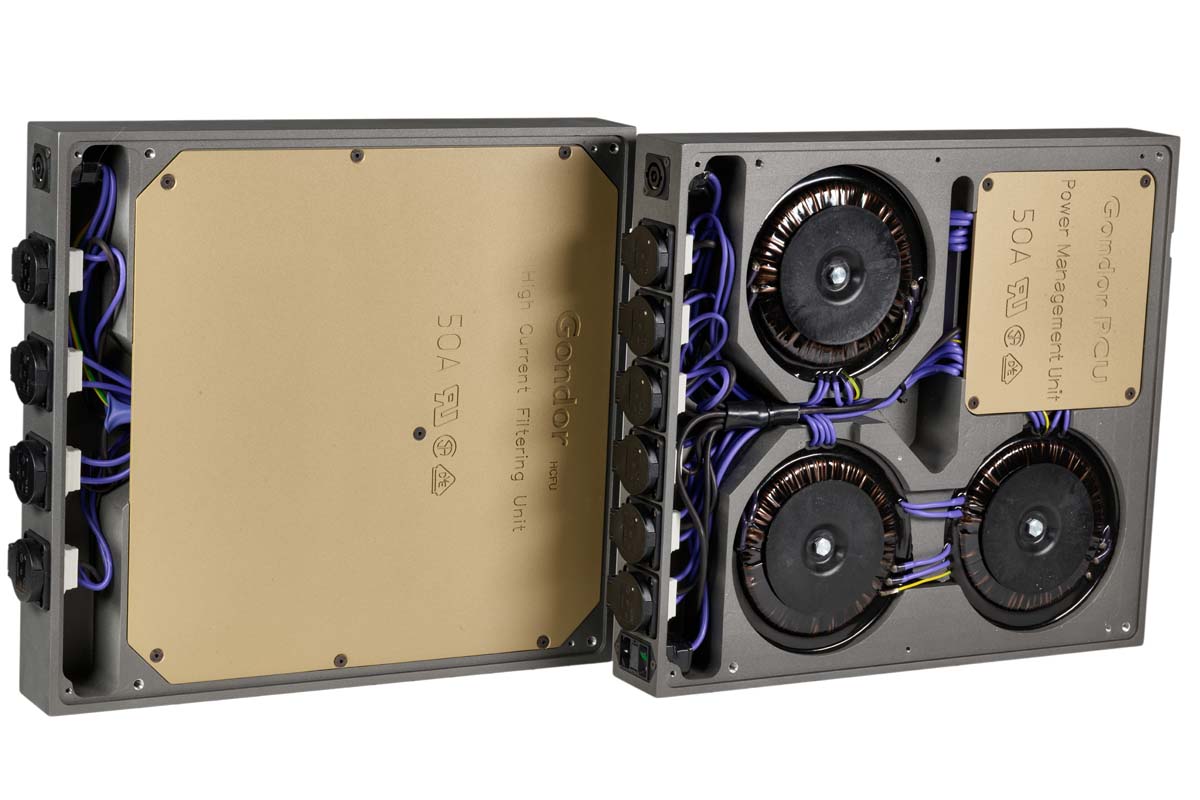 Die Anfassqualität der in noblem Hellgrau hammerschlaglackierten Aluminiumblöcke ist grandios, das Gewicht auch: 37 Kilogramm bringt die „normale“ PCU-Einheit auf die Waage, flankiert von der 35 Kilo schweren HCFU; beim Gondor S sind es 39 beziehungsweise 37 Kilo. Auch die Trafogrößen differieren leicht zwischen Normal- und „S“-Klasse: 800 beziehungsweise 1000 Volt liefern die Ringkern-Boliden. Gleich bleibt der Arbeitsstrom. Die Gondor arbeiten mit 50 Ampere – und zwar ganz egal, ob an der Hauptstromleitung nun die unter anderem in den USA und Japan üblichen 120 Volt/60 Hertz oder die 230 Volt/50 Hertz der europäischen Stromnetze anliegen. Wer einen Gondor besitzt, kann ihn also bei eventuellen Auslandsaufenthalten getrost mitnehmen, denn diese feine Maschine stellt sich selbst auf das Stromnetz vor Ort ein.
