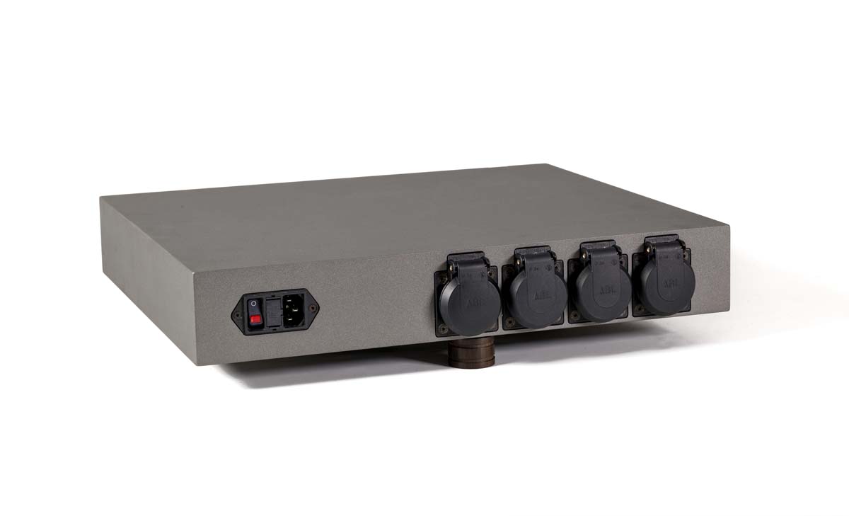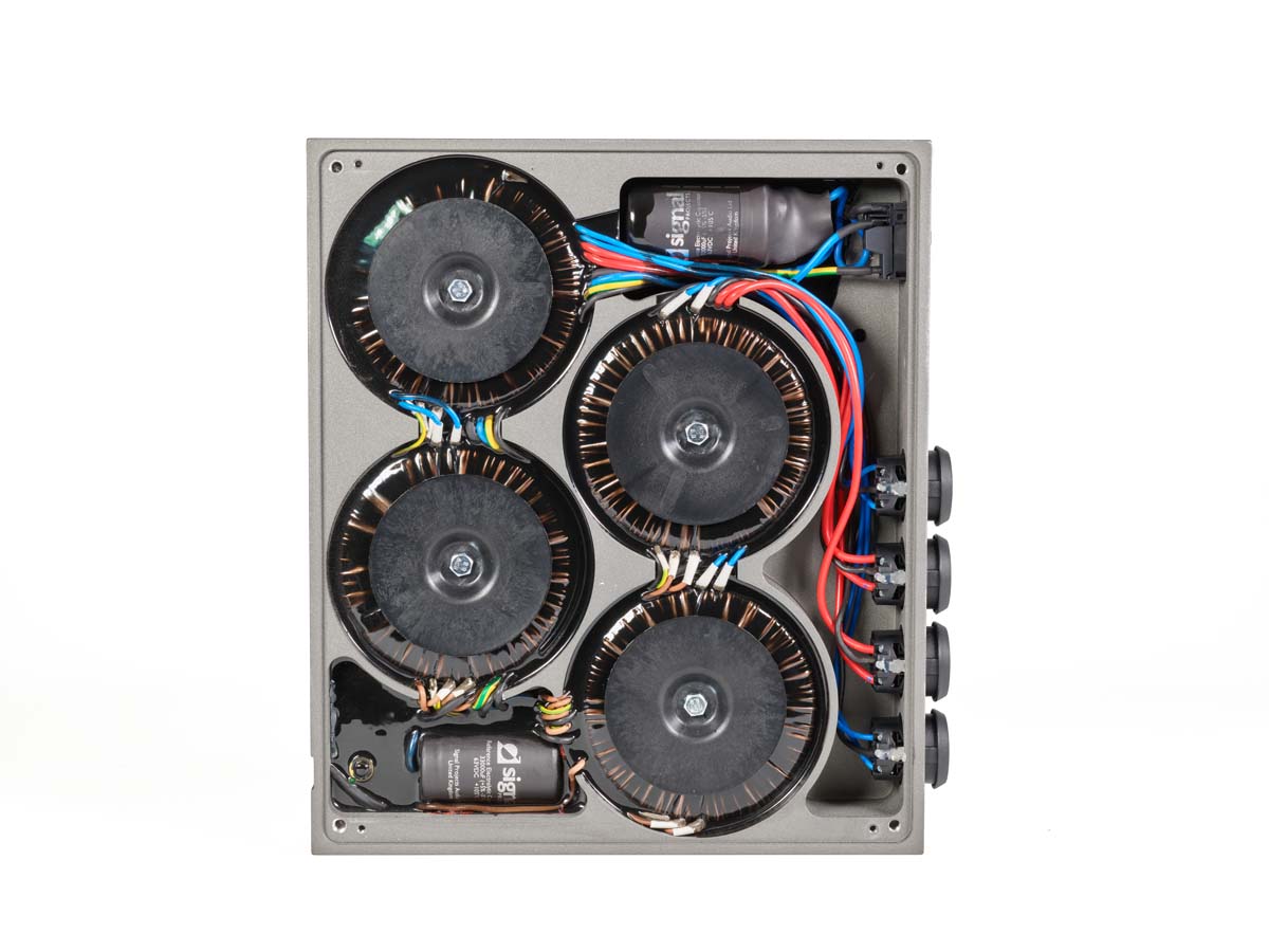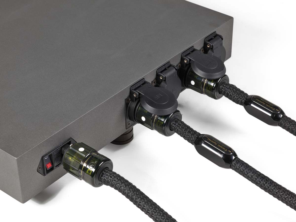 Analog dazu egalisiert der Signal Projects Phoenix Isolator mit seinem relativ simplen Aufbau Stromschwankungen und „Löcher“ im Heimnetz. Von den vier Netzdosen, die sich auf der Rückseite der „virtuellen Erdungseinheit“ (so nennt der Hersteller den Phoenix) finden, sind zwei für stromhungrige Verbraucher wie Endstufen reserviert, zwei andere nehmen weniger fordernde Quellen wie Streamer oder CD-Player beziehungsweise Phonovorverstärker auf. Beim Blick ins Gehäuse lassen sich die Anschlüsse anhand des jeweiligen Kabeldurchmessers leicht auseinanderhalten. „Die Kabel entstammen der Golden-Sequence-Serie von Signal Projects mit Gold-, Silber- und Kupferkomponenten“, weiß Uwe Klose, Chef des deutschen Vertriebs Applied Acoustics in Berlin. Bei Signal Projects setzt man sich breitbandig mit dem Themenkomplex „Strom“ auseinander und hat eine recht umfangreiche selbstentwickelte Kabelfamilie im Portfolio.