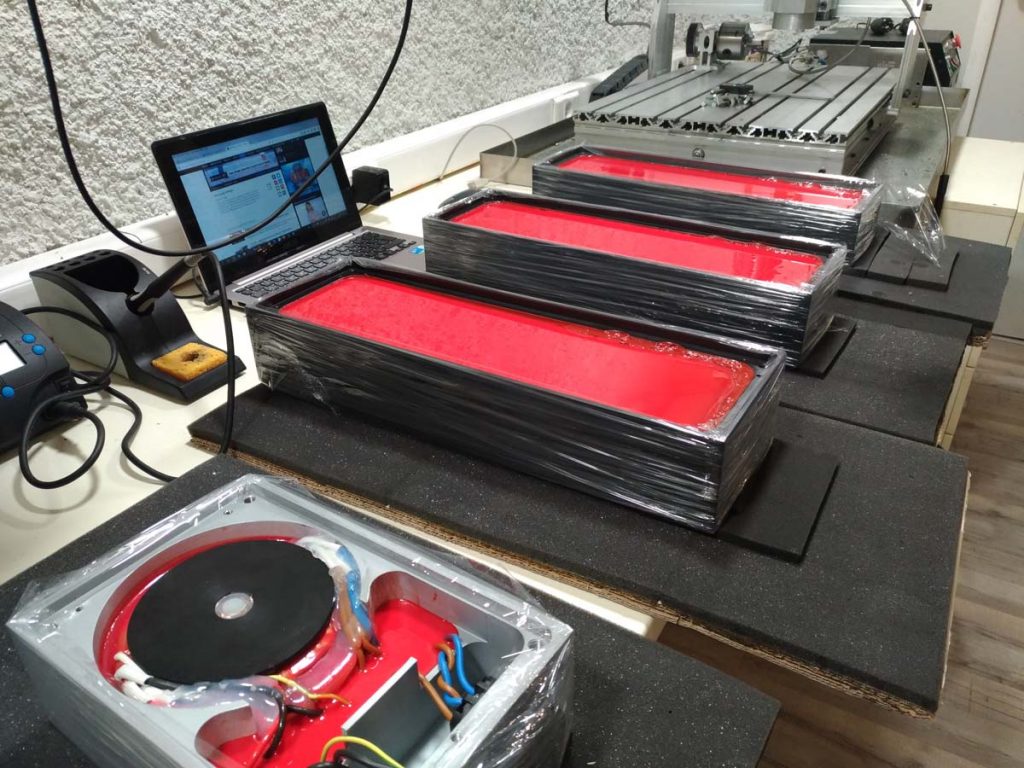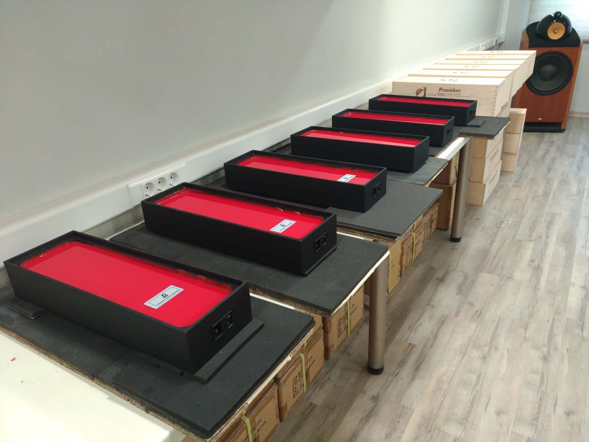 Auf Kundenwunsch kann die Konfiguration der Steckplätze übrigens individuell mit Signal Projects abgestimmt und entsprechend variabel angefertigt werden. Doch ob nun serienmäßig oder nach Wunsch bestückt: Um jegliches Brummen oder mechanische Vibrationen auszuschließen, wird das Innenleben jeder Poseidon mit einem roten Kunstharz ausgegossen.