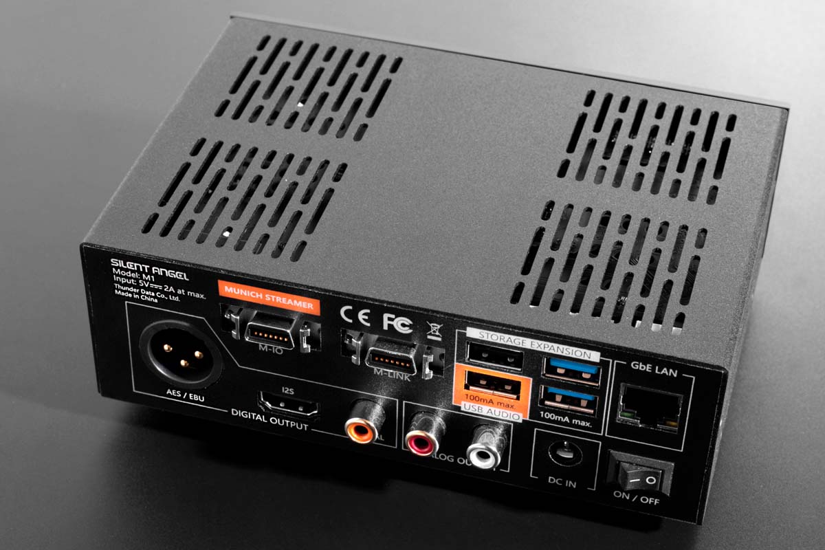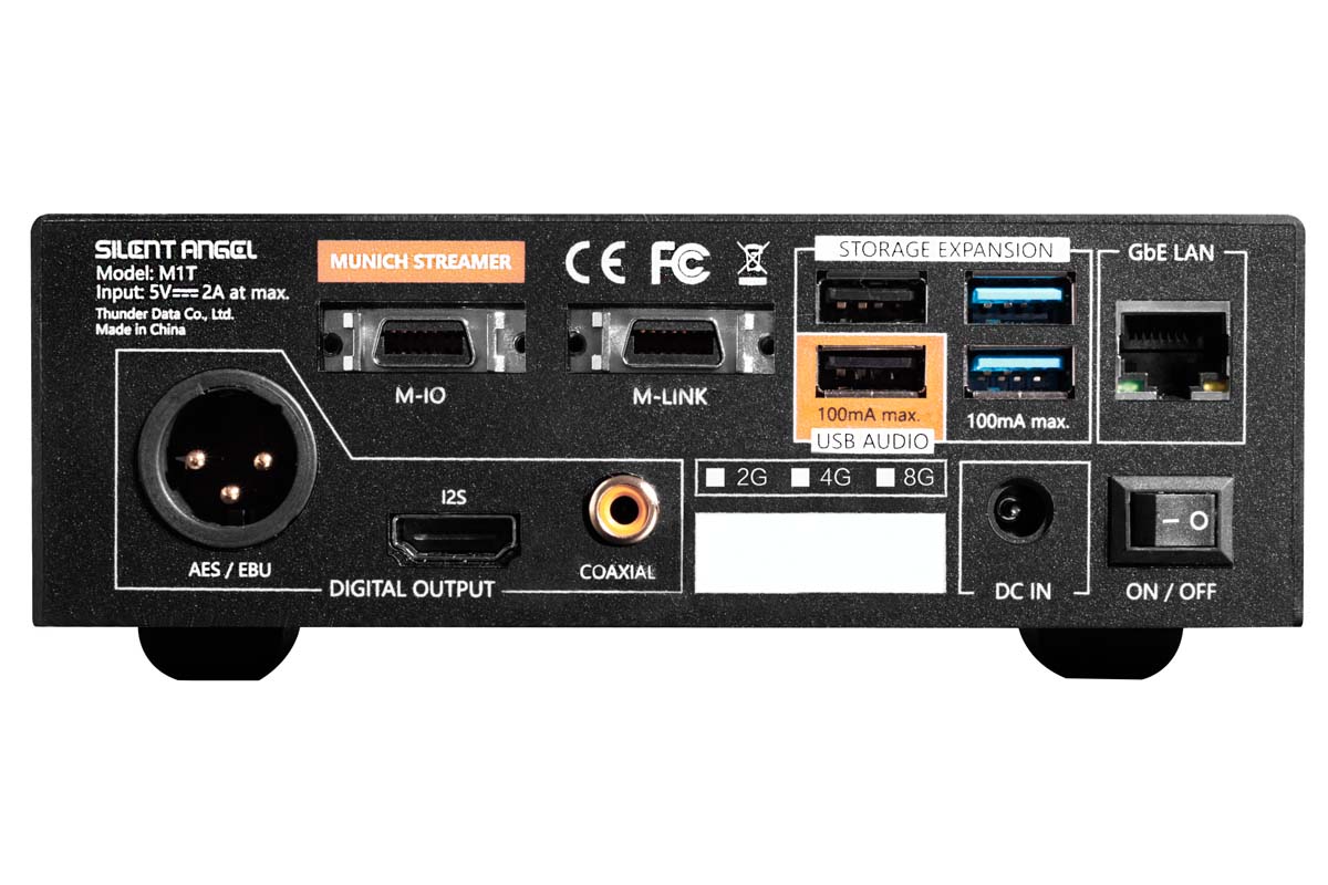 Mit ihrer umfangreichen Schnittstellen-Ausstattung integrieren sich die Streamer Silent Angel Munich M1 und M1T nahtlos in anspruchsvolle Audioanlagen aller Größen. Die digitalen Ausgänge im AES/EBU, I2S und S/PDIF-Format unterstützen Sampleraten von bis zu 384 kHz sowie DSD128 während die USB-Schnittstelle sogar Files von 768 kHz PCM sowie DSD 256 übertragen kann. Ein weiterer USB-Port steht für externe Speichermedien bereit, gleichzeitig stellt der 1000 Mbps Ethernet Port eine zuverlässige Verbindung mit High-Performance NAS-Laufwerken sowie Routern und Audio Switches sicher. Zudem sind die bieden Streamer mit den M-IO und M-LINK-Anschlüssen für zukünftige Erweiterungs-möglichkeiten bestens gerüstet. Während Munich M1T speziell für die Verwendung mit hochwertigen externen DACs ausgelegt ist, verfügt der Munich M1 zusätzlich über einen kraftvollen Kopfhörerverstärker sowie hochwertige analoge Ausgänge und lässt sich auch mit analogen Verstärkern oder Aktivlautsprechern betreiben.