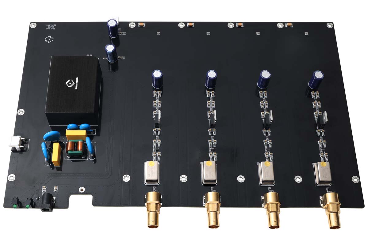 Dass die Qualität einer digitalen Übertragung von Audiodaten mit der Präzision der Wordclock steht und fällt ist inzwischen allgemein Konsens, aber kaum ein Hersteller bietet ein akkurateres Taktgefühl als Silent Angel mit der Genesis GX: Während bisherige Konzepte auf einer 10 Megahertz Taktung beruhten, die ursprünglich für GPS-Systeme entwickelt worden war, fußt Genesis GX auf TXCO-Chips mit einer Taktung von überragenden 10- und 25 Megahertz, wie sie auch für anspruchsvollste wissenschaftliche Mess-Aufgaben zum Einsatz kommt. Dabei bietet Genesis GX nicht weniger als vier unabhängige Wordclock-Ausgänge, von denen zwei als 25 Megahertz-Varianten ideal zum Zusammenspiel mit High End Geräten wie dem Bonn NX Switch geeignet sind. Außerdem lassen sich an den beiden anderen Ausgängen 10-Megahertz-kompatible Geräte anschließen.