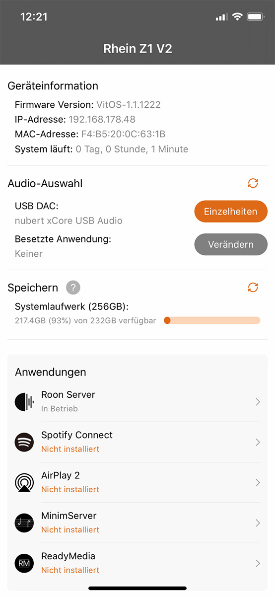 Das jüngste Update auf VitOS 1.1.1222 bescherte dem stillen Engelchen neue Möglichkeiten. So ist der Rechner nun auch Spotify Connect-Endpunkt, der den beliebten Web-Dienst (gesteuert über ein Smart-Device) ohne Umwege anzapfen kann. Neben Airplay2 fügte Thunder Data den MinimServer und ReadyMedia hinzu. Beides verwandelt den kompakten Medien-Rechner in einen UPnP-/DLNA-Server. Um das schlanke System mit den neuen Funktionen nicht unnötig zu belasten, stehen die Erweiterungen als Installations-Optionen zur Verfügung. Über die Smartphone-App des Herstellers aktiviert man sie separat und kann sie später rückstandslos entfernen. Das hält das System flink und geschmeidig.