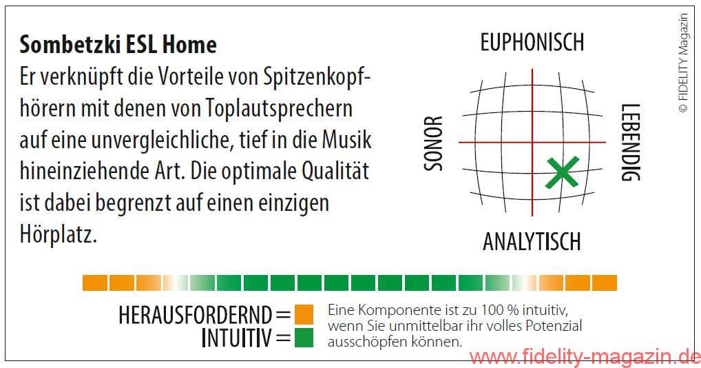 Mit seiner superben, vollkommen homogenen Über-alles-Qualität spielt der Sombetzki ESL Home in einer Liga, die normalerweise Superboxen mit sehr deutlich fünfstelligem Preisschild vorbehalten ist. Und er nimmt von Kopfhörer-Verächtern wie mir jeden Druck. Im wahrsten Sinne des Wortes!