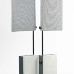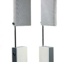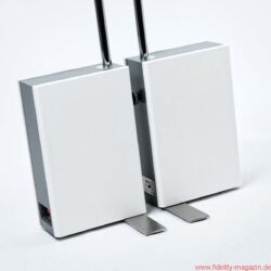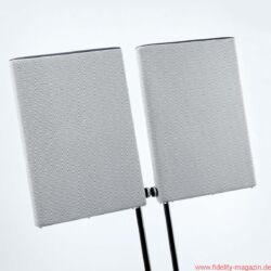 Ja, ich weiß, das hört sich alles etwas paradox an, und ich war anfangs auch ziemlich skeptisch, ob dieses ungewöhnliche Prinzip überhaupt funktionieren kann. Diese rechteckigen Kissen an Aluminiumstangen, die drehbar in kleinen, schweren Sockeln mit Lautsprecher-Anschlussfeldern befestigt sind, sollen gleichauf mit teuren Kopfhörern spielen? Mit Mühe konnte ich es vermeiden, dem Chefredakteur den Vogel zu zeigen. War der Kollege doch von der Konstruktion nicht nur überzeugt, sondern sogar sichtlich begeistert. Ich tendiere dagegen eher zur sogenannten Thomas-Philosophie und glaube an manche Dinge erst, wenn ich meine Hand selber in die Wunde beziehungsweise an die mit einer Gradmarkierung versehene Trägerstange gelegt habe.