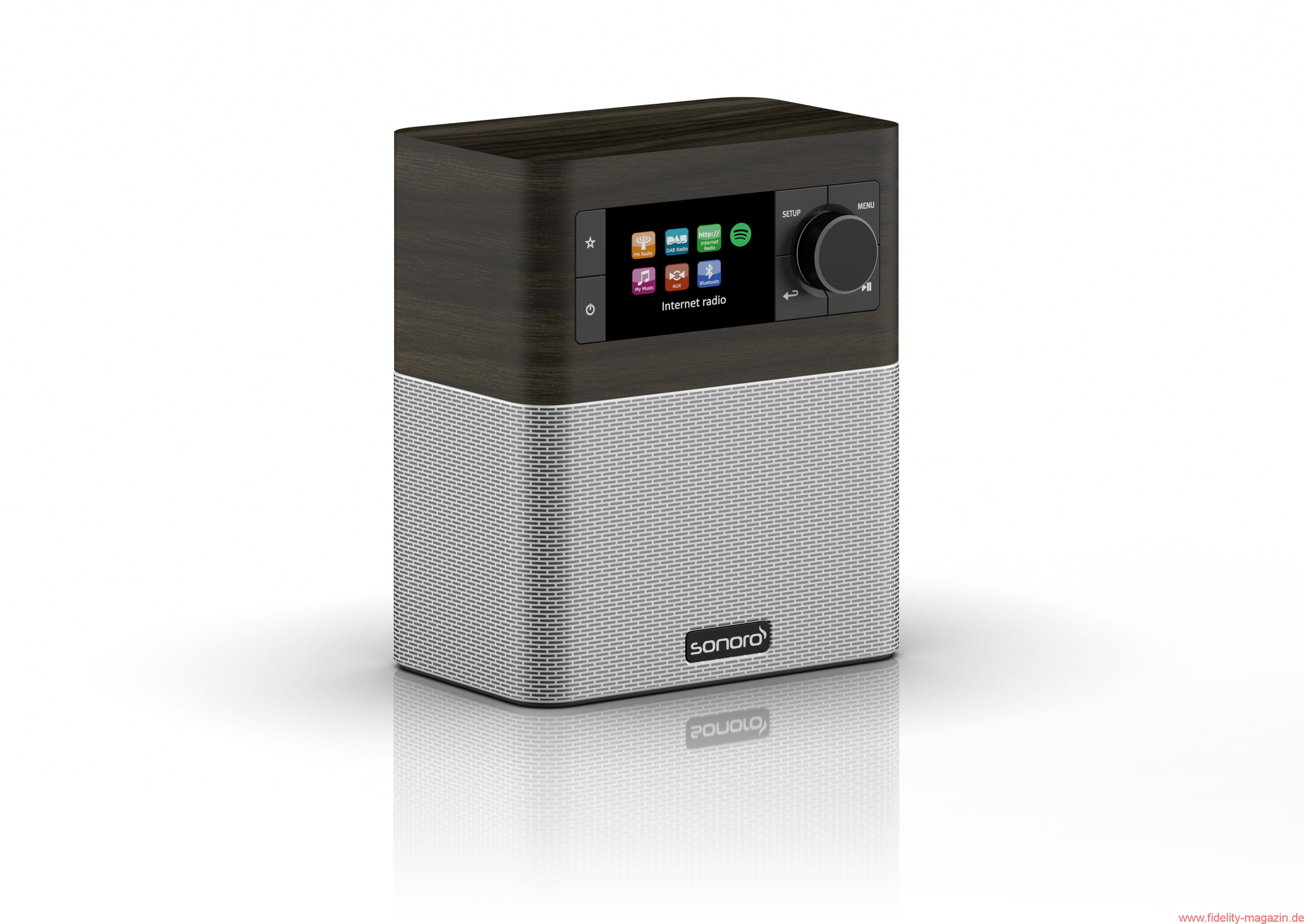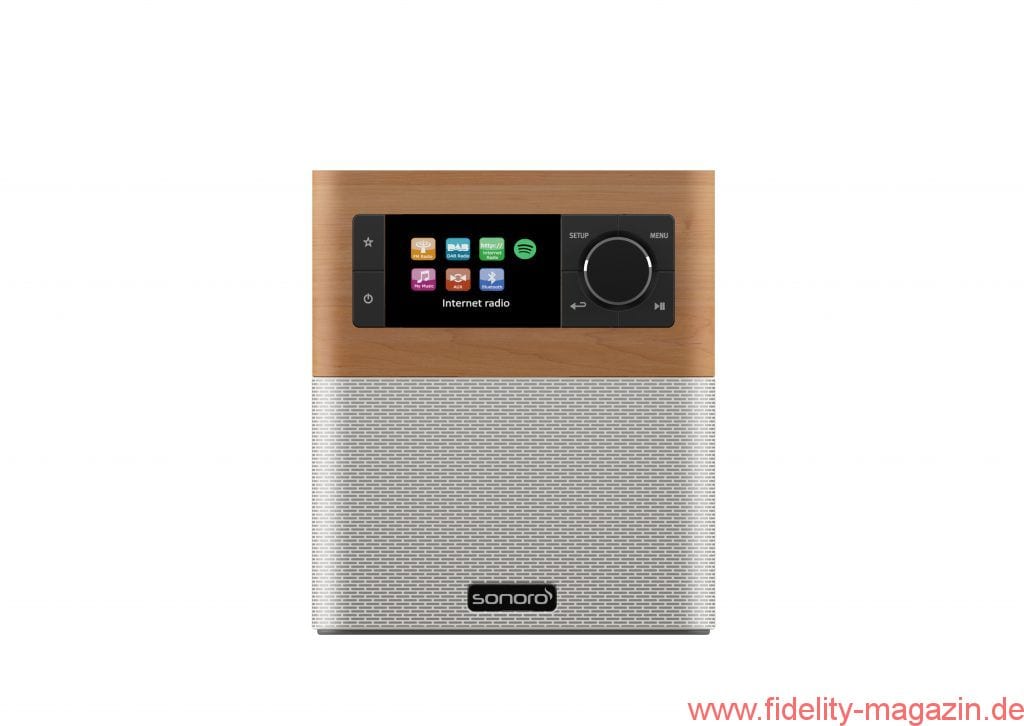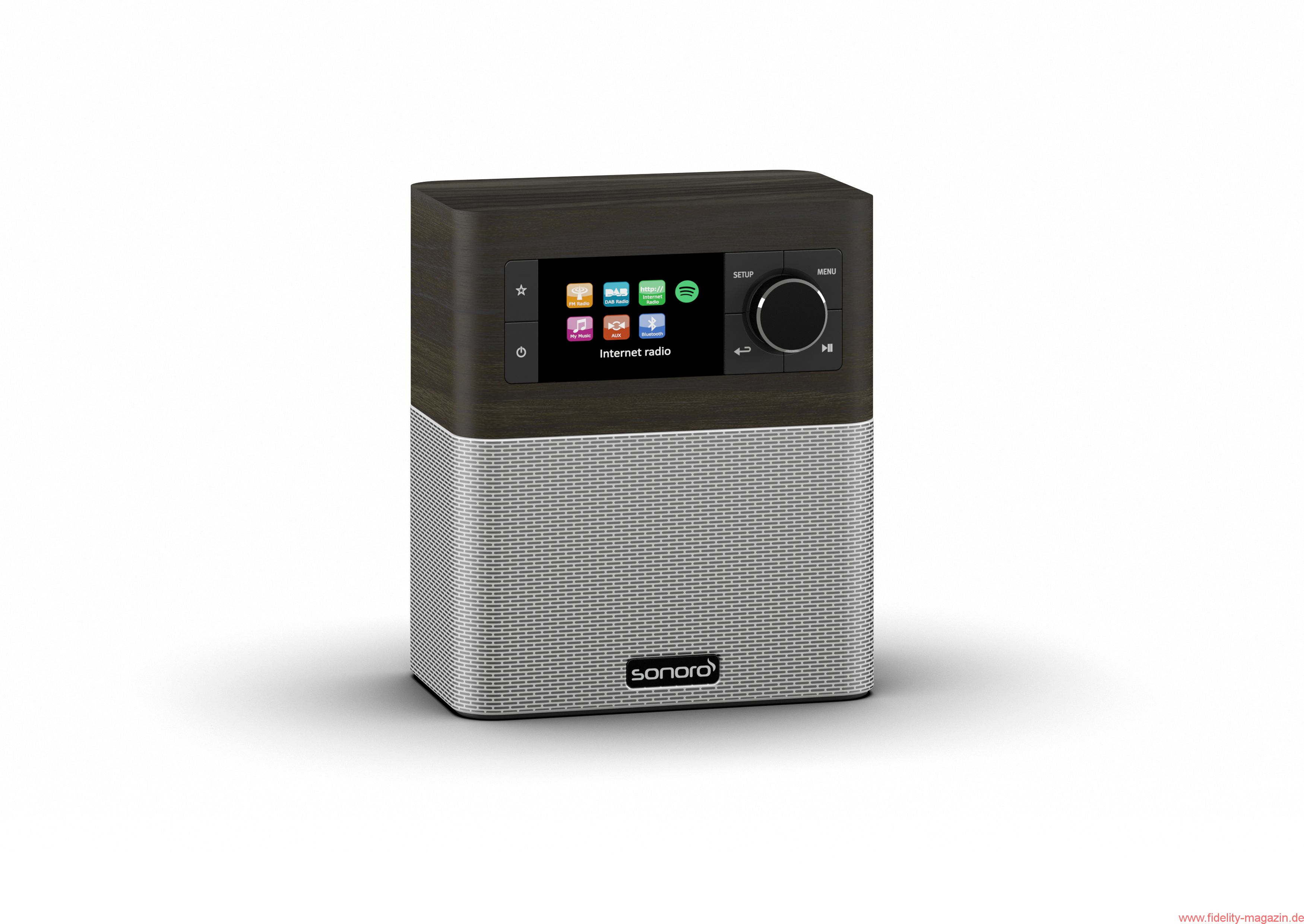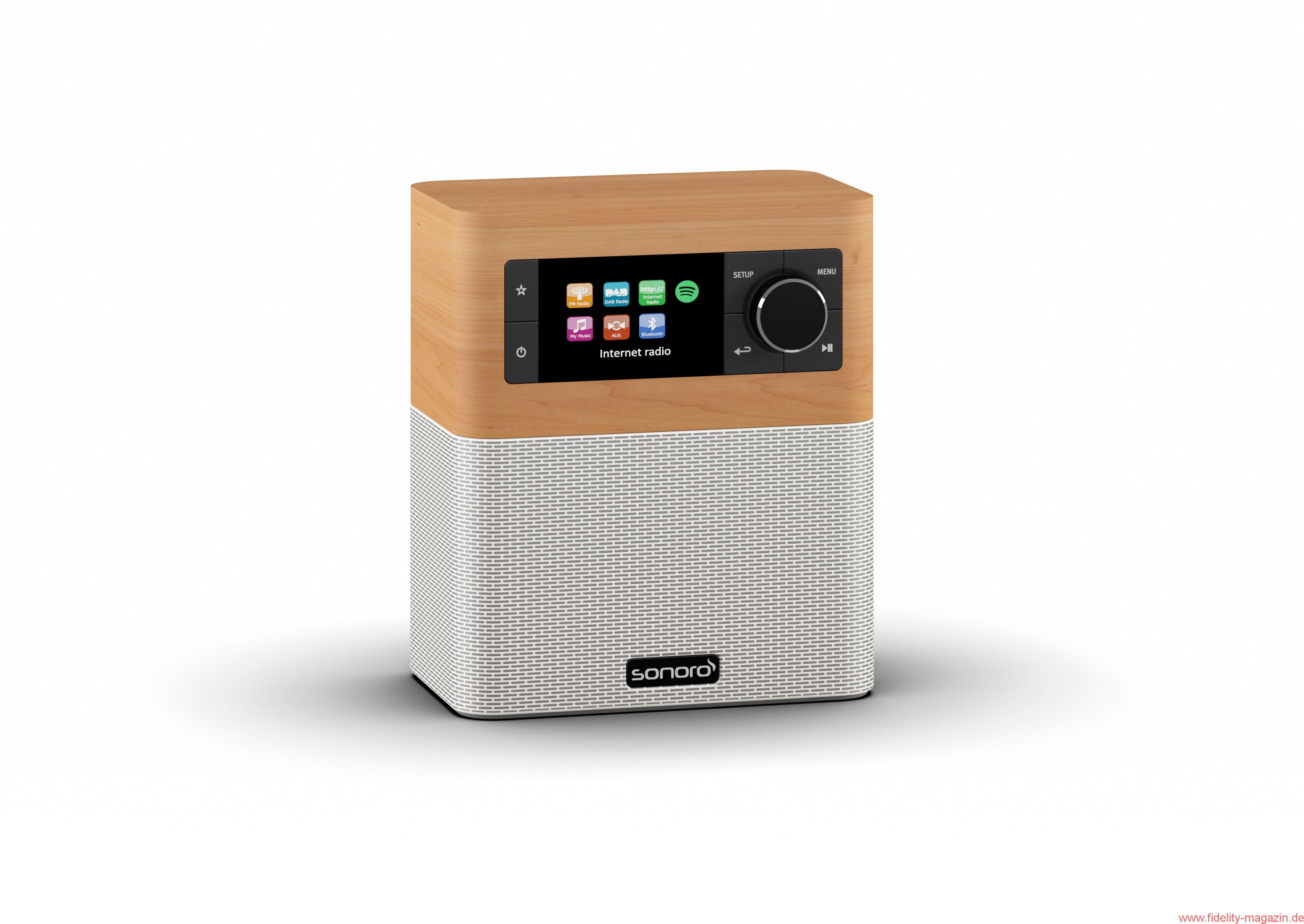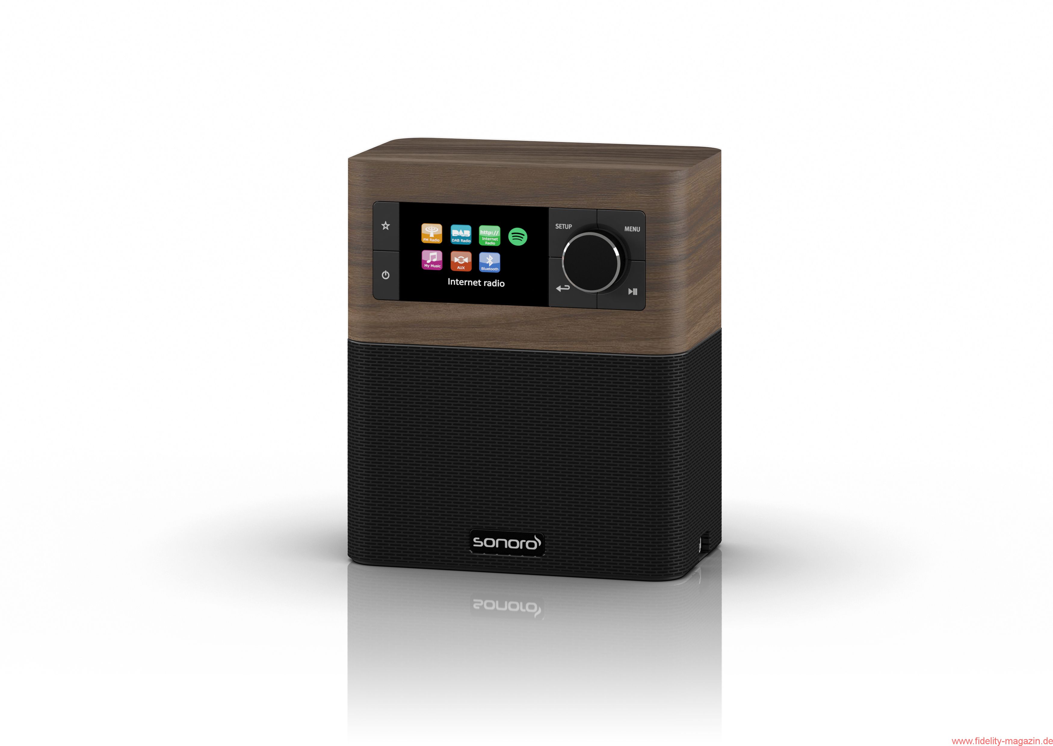 Schon beim Auspacken des in Deutschland entwickelten und designten Radios bietet der STREAM eine sehr ansprechende Verarbeitungsqualität. Der Materialmix aus Mesh und einer oberen Hälfte in Holzoptik – wahlweise sind die Kombinationen Ahorn/Weiß, Mooreiche/Silber oder Walnuss/Schwarz lieferbar – wirkt schlicht-elegant und modern. Die Vorderseite des Sonoro STREAM ist übersichtlich: Neben dem automatisch dimmbaren 2,4″-TFT-Display finden sich sechs beschriftete Knöpfe und ein Rad, das zur Steuerung durch die Menüs sowie zur Lautstärkeregelung verwendet wird. Auf der Rückseite finden sich, neben dem Stromanschluss, zwei Antennen: eine für „klassischen“ Radio-Empfang (UKW und DAB+), die andere für die Einbindung ins heimische WLAN. Im Praxistest stellt der STREAM ohne Ausklappen der Antennen schon eine nutzbare Netzwerkverbindung her.