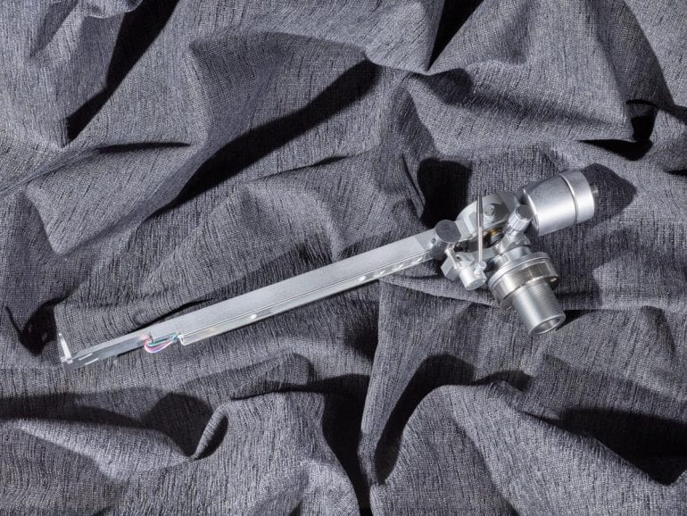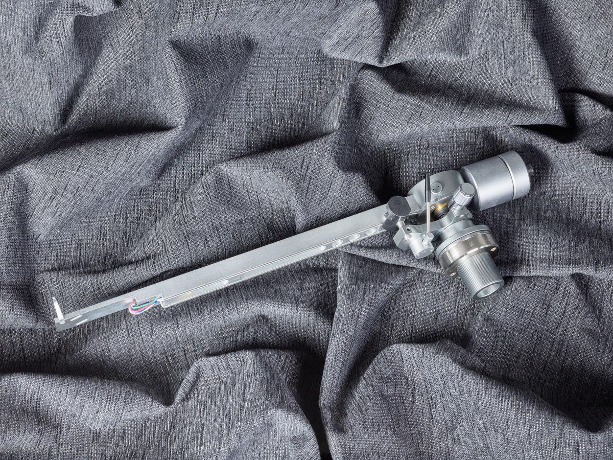 Auffälligstes Designmerkmal ist der Tonarmstrang − von einem Rohr kann man beim besten Willen nicht reden −, der aus einem quaderförmigen Stück Aluminium besteht. Dieses wird zur Headshell hin in zwei Stufen flacher. Der notwendige Kröpfungswinkel wird durch die „schräge“ Anordnung der Halbzoll-Langlöcher verwirklicht. Auf der Unterseite sind mehrere kreisförmige und ovale Aussparungen eingefräst, deren Hauptzweck wahrscheinlich in einer Gewichtsreduktion besteht.