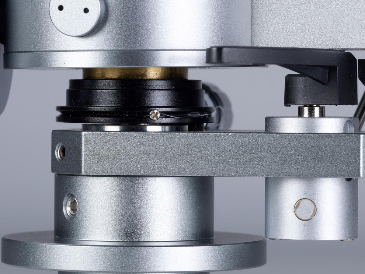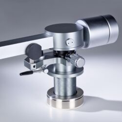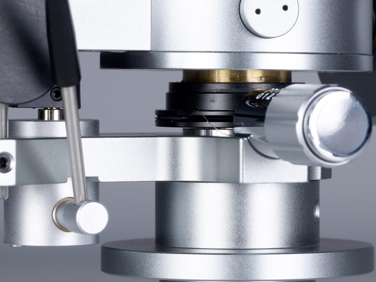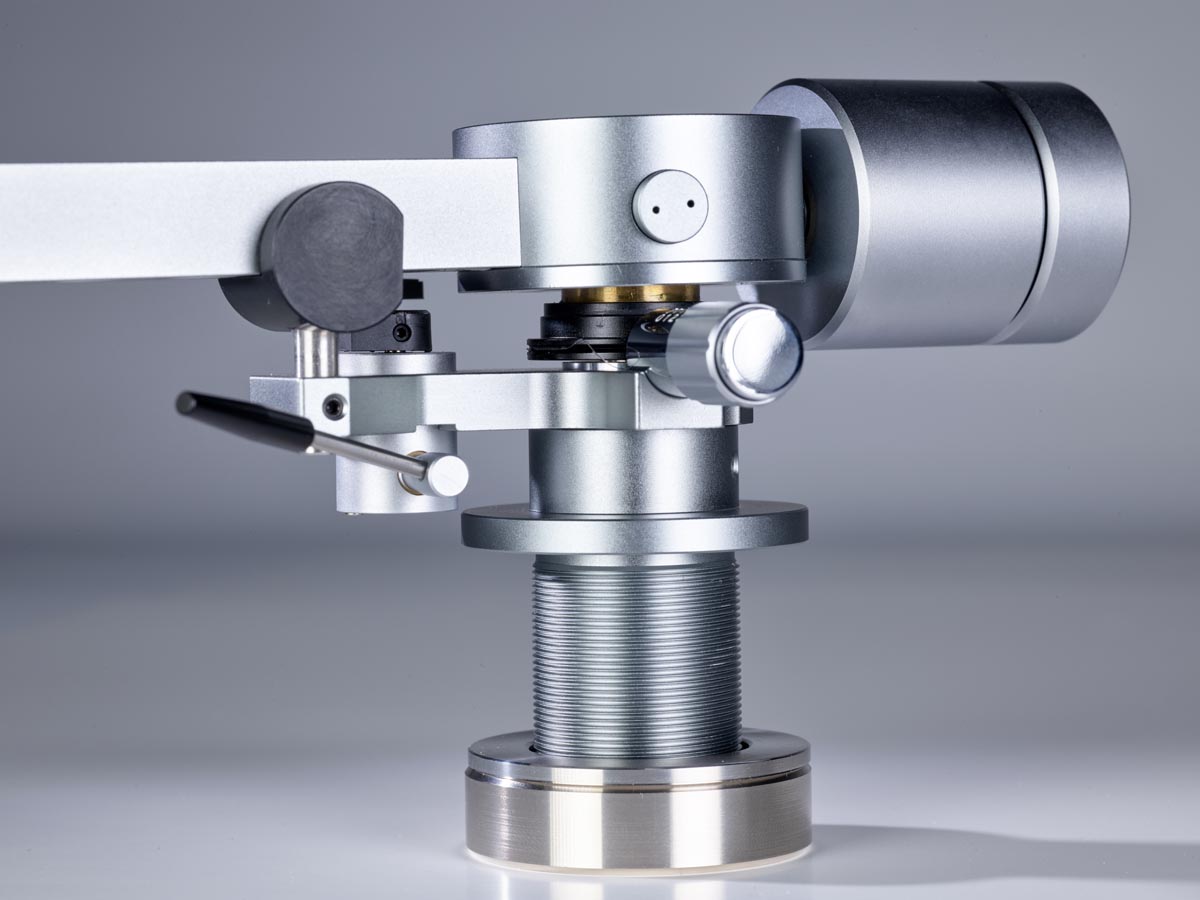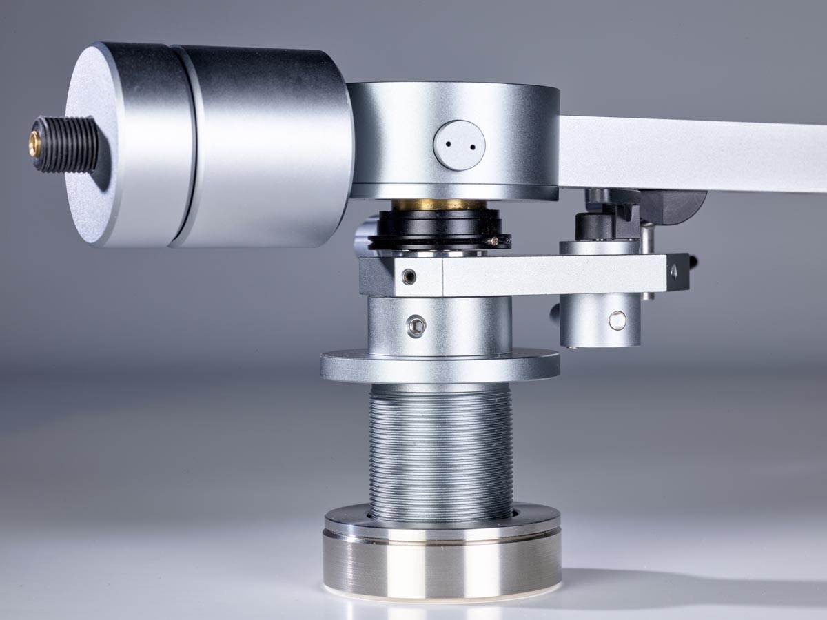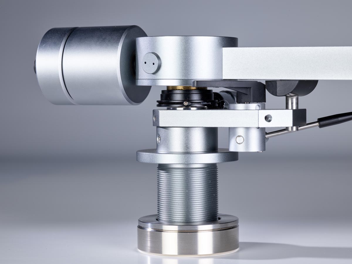Links und rechts neben diesen Aussparungen verläuft je eine Nut, in der die Tonarmkabel verlegt sind. Unter dem großen, kreisförmigen Gehäuse oberhalb des Drehpunkts verbirgt sich für die vertikale Bewegung eine laut Hersteller einzigartige Kombination aus Spitzen- und Kugellager. Für die laterale Bewegung ist dagegen ein klassisches Kugellager im Tonarmschaft verborgen. Die Antiskatingkraft erzeugt eine Feder, die mittels eines Drehknopfes vorgespannt wird, der auch einen kleinen Zeiger an der dazugehörigen Skala vorbeischiebt.