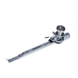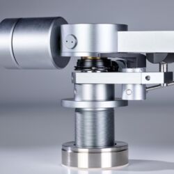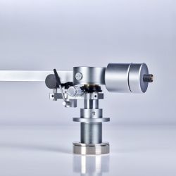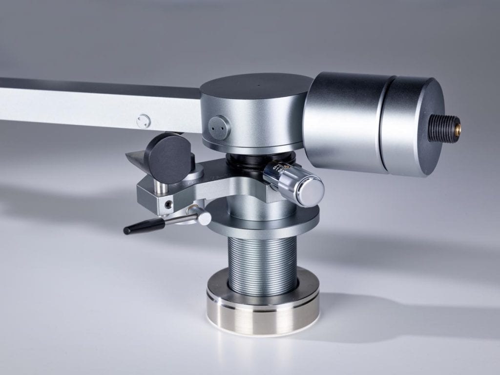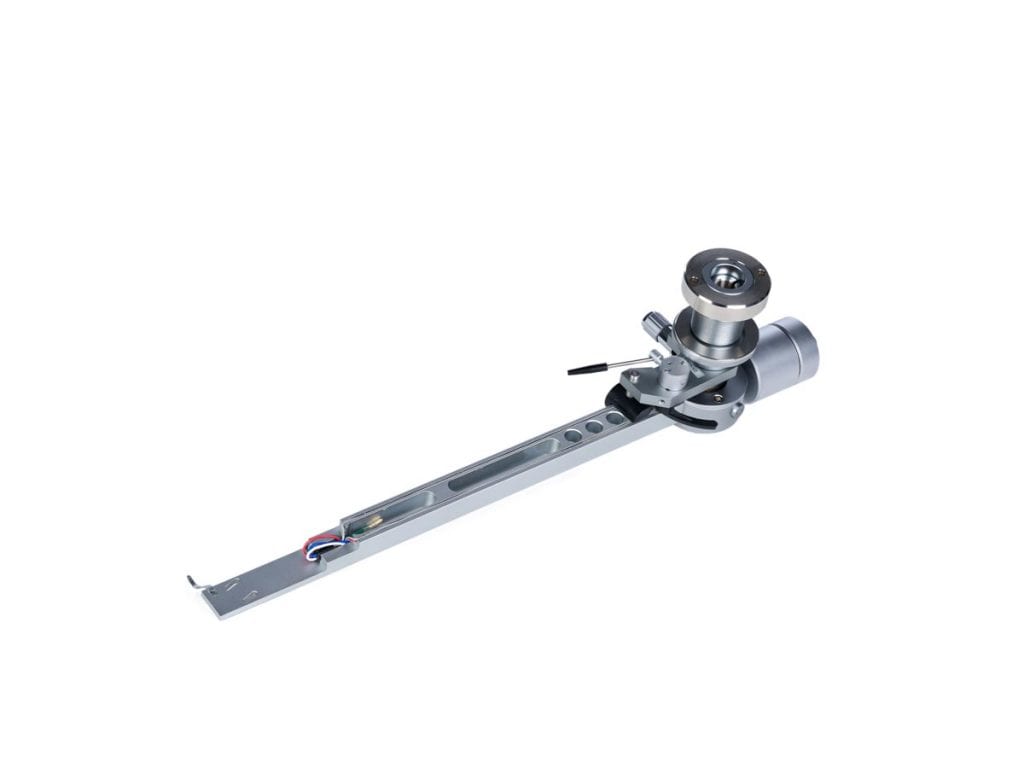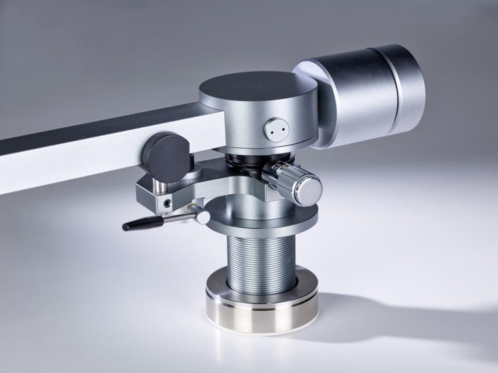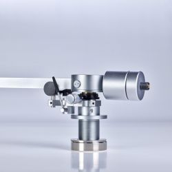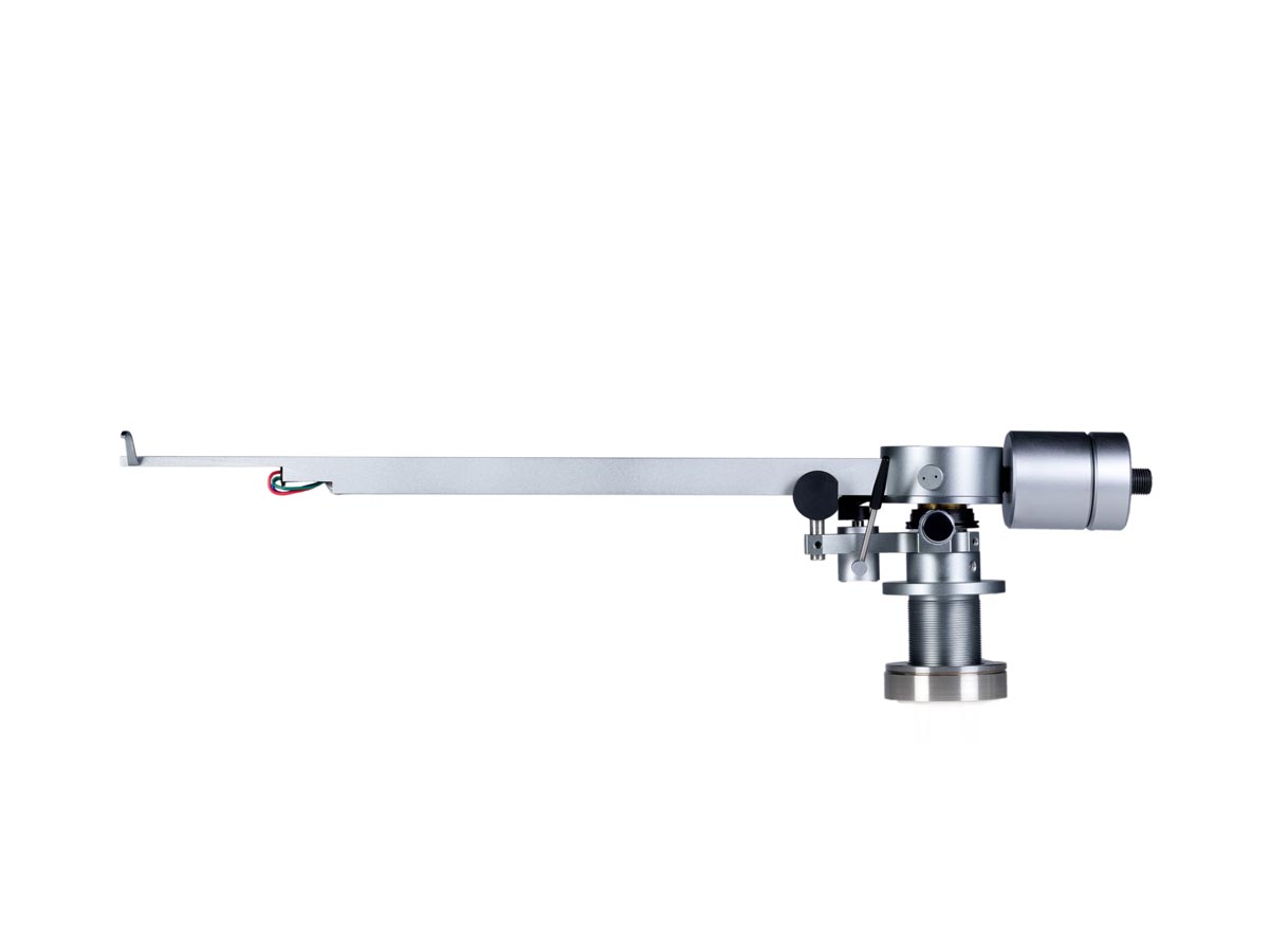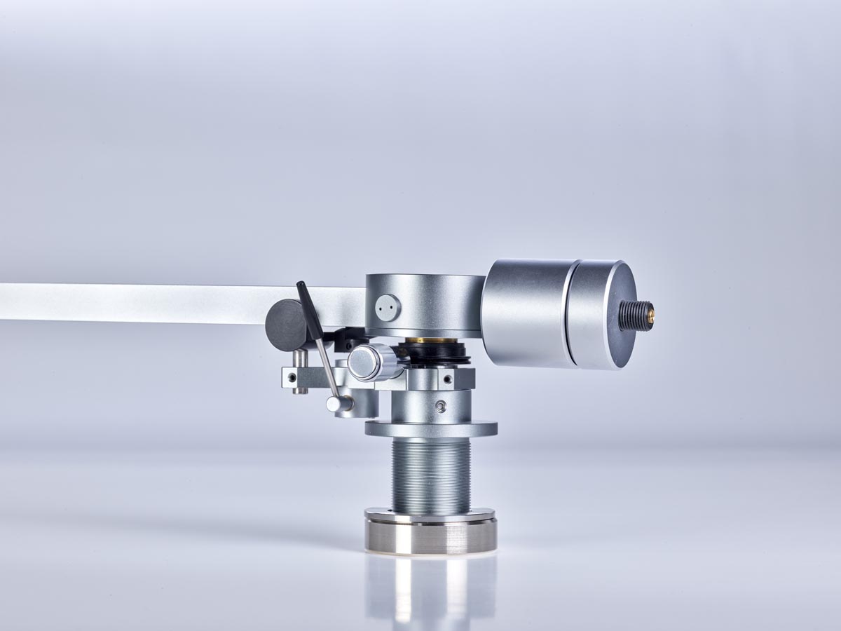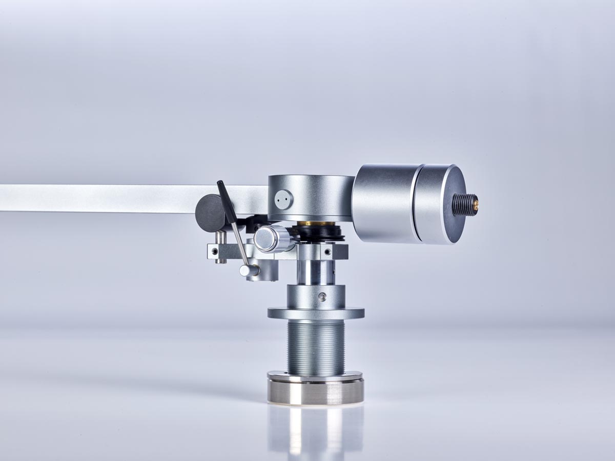 Links und rechts neben diesen Aussparungen verläuft je eine Nut, in der die Tonarmkabel verlegt sind. Unter dem großen, kreisförmigen Gehäuse oberhalb des Drehpunkts verbirgt sich für die vertikale Bewegung eine laut Hersteller einzigartige Kombination aus Spitzen- und Kugellager. Für die laterale Bewegung ist dagegen ein klassisches Kugellager im Tonarmschaft verborgen. Die Antiskatingkraft erzeugt eine Feder, die mittels eines Drehknopfes vorgespannt wird, der auch einen kleinen Zeiger an der dazugehörigen Skala vorbeischiebt.