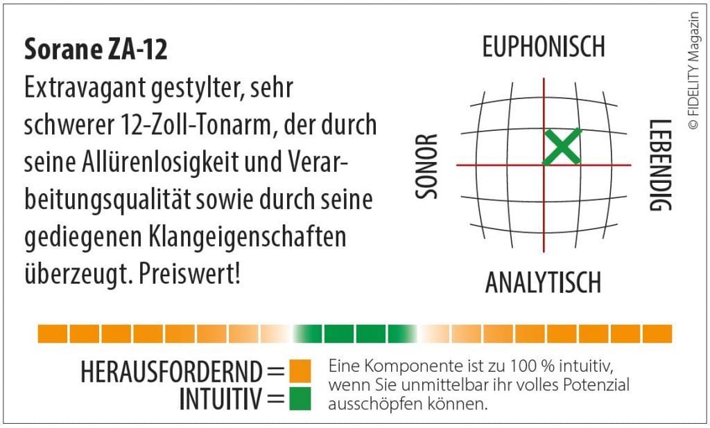 Sorane ZA-12: Extravagant gestylter, sehr schwerer 12-Zoll-Tonarm, der durch seine Allürenlosigkeit und Verarbeitungsqualität sowie durch seine gediegenen Klangeigenschaften überzeugt. Preiswert!