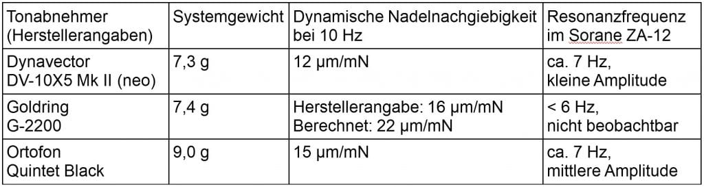 Leider wird kein konkreter Wert für die effektive Masse angegeben. Mittels Resonanzfrequenzmessungen mit den drei von mir verwendeten Tonabnehmern lässt sich grob abschätzen, dass sie im Bereich um 25 Gramm (±3 g) liegen muss und dass der ZA-12 damit eindeutig zu den sehr schweren Tonarmen zählt. Deshalb sollte man bei der Tonabnehmerwahl Systeme mit einer Nadelnachgiebigkeit kleiner 15 µm/mN bevorzugt ins Auge fassen.