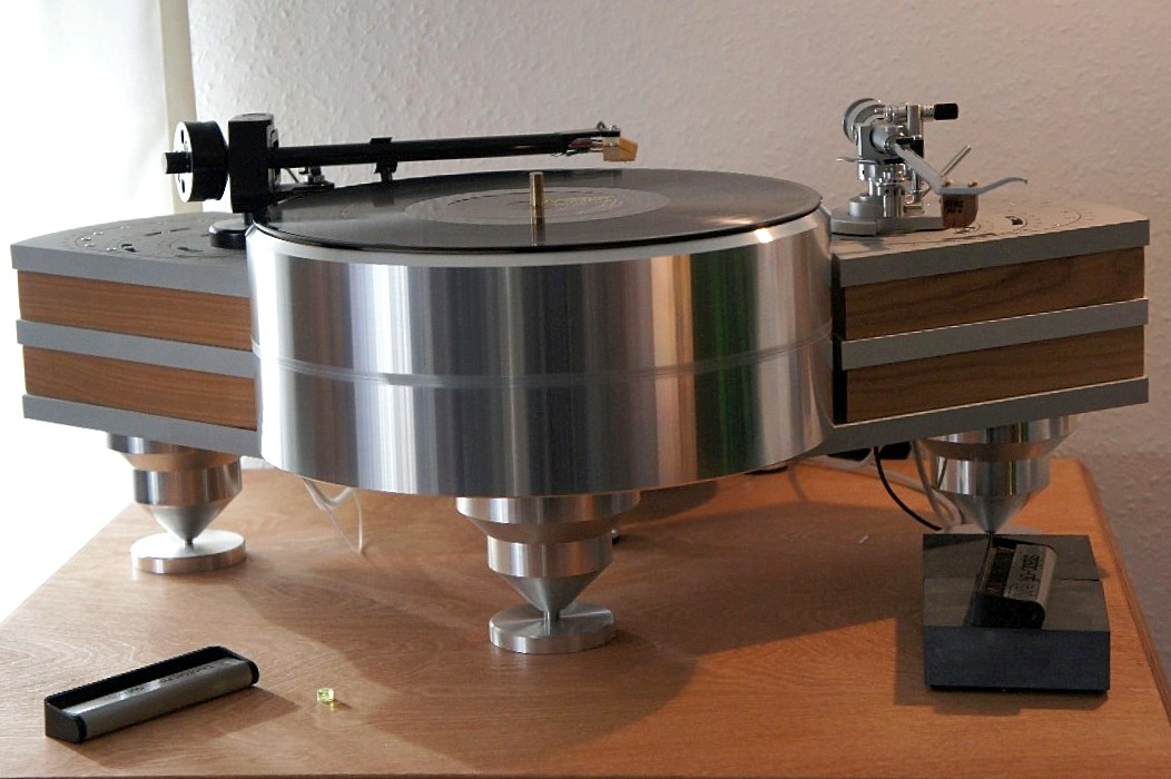 Wie schon beschrieben, hat das Material an diesen Stellen Einfluß auf die Tonalität. So kann man das Laufwerk nicht nur seinem subjektiven Klangempfinden anpassen, sondern kann z.B. auch bei der Verwendung zweier Tonarme für verschiedene Musik-Genres jeden einzeln darauf Abstimmen. Und auch die Kopplung der Platte zum Teller nimmt Einfluß auf die Tonalität, so daß hier der Phantasie und den Möglichkeiten fast keine Grenzen gesetzt sind. So wird jedes Laufwerk nicht nur zu einem Einzelstück, es bleibt auch flexibel und kann jederzeit verändert werden.