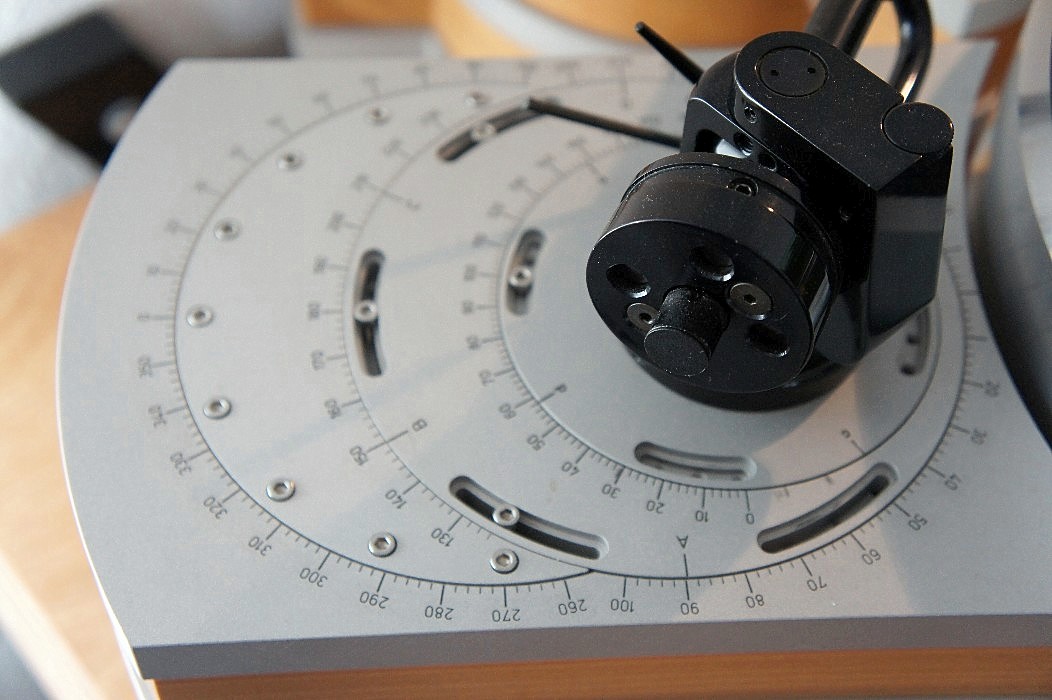 Unser Masselaufwerk vereint eine ganze Reihe Innovationen. Da ist z. B. die sehr massiv ausgeführte Tonarmbasis, die den Tonarm einerseits sehr fest und verwindungsfrei mit dem Chassis verbindet, andererseits aber die Möglichkeit bietet, jeden marktüblichen Tonarm zwischen 9″ und 12″ zu befestigen. Aufgrund der patentrechtlich geschützten Ausführung der Basis mit Drehtellern und den Nonius-Skalen ist es möglich, jeden einmal eingestellten Tonarm innerhalb weniger Minuten aus- und einzubauen, ohne an Präzision der Einstellung zu verlieren. Auch der Wechsel zwischen den beiden Basen eines Laufwerks und auch der Wechsel zu einem anderen L-1 ist problemlos möglich. Weiterhin etwas Besonderes ist die Ausführung der Kopplung zwischen Platte und Plattenteller mittels acht Einlegern. Diese Einleger können in verschiedensten Materialien geliefert werden, um so die Tonalität abstimmen zu können. Die gleiche Abstimmbarkeit ist auch durch die Wahl des Materials in den Zwischenlagen der Tonarmbasen möglich. Eine weitere Besonderheit stellt die Motordose M-2 dar, die zu jedem L-1 gehört. Diese Motordose bietet die Möglichkeit, die Spannung des Antriebsriemens während des Abspielens der Platte zu verändern und so den Punkt des tonalen Optimums zu finden.