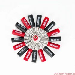 Kühn experimentierte viele Monate lang mit verschiedensten Materialien, Oberflächenbeschichtungen und auch mit der Mechanik. Besonderes Augenmerk legte er dabei auf das Material der Griffhülsen. Dass hiermit ebenfalls positive Ergebnisse zu erzielen waren, erstaunte zunächst auch ihn, hatte er doch bisher auf Hülsen ganz bewusst verzichtet, da er zuvor immer einen negativen Einfluss auf den Klang festgestellt hatte. Die bei BFAs neuen Steckern eingesetzten Kunststoff-Griffhülsen jedoch verhalten sich nicht nur klanglich völlig „neutral“, sondern bieten in vielen Fällen sogar noch eine kleine Unterstützung des jeweiligen Klangcharakters der eingesetzten Kabel. Und: Statt üblicher Löt- oder Quetschverbindungen zwischen Stecker und Kabel gab der Black-Forest-Audio-Chef zudem recht schnell einer Schraubverbindung den klanglichen Vorrang. Für die Kontaktfläche kam nur Rhodium in Frage. Zu weiteren Details schweigt Kühn geflissentlich – es wäre nicht das erste Mal, dass seine Ideen und Konzepte erst belächelt und später nachgeahmt werden.