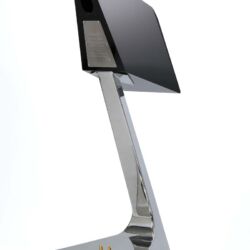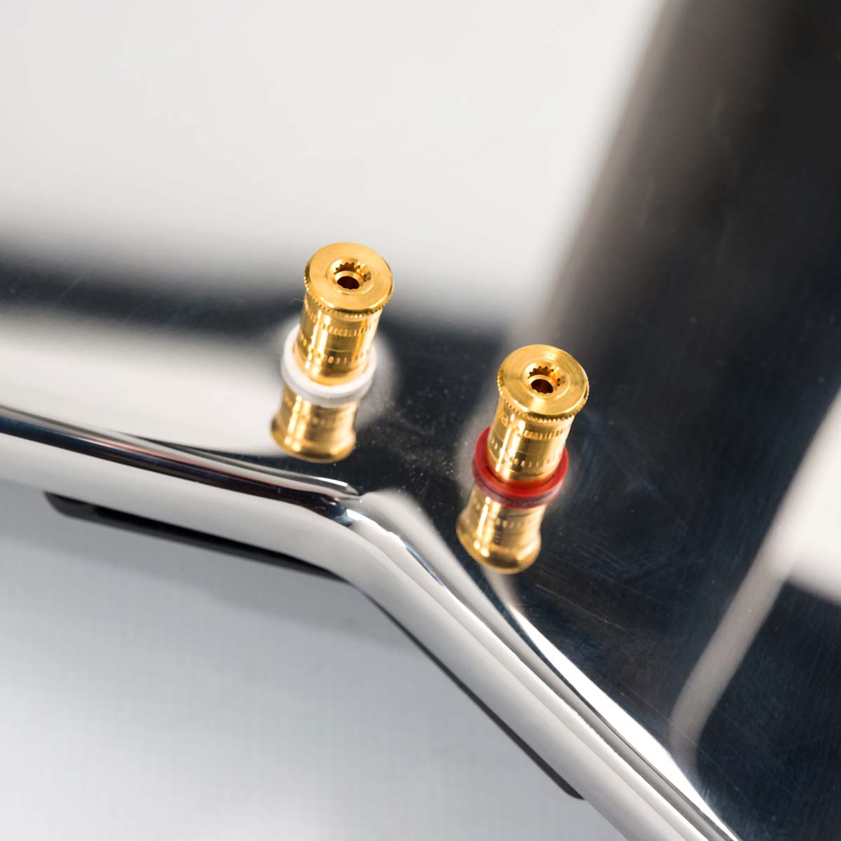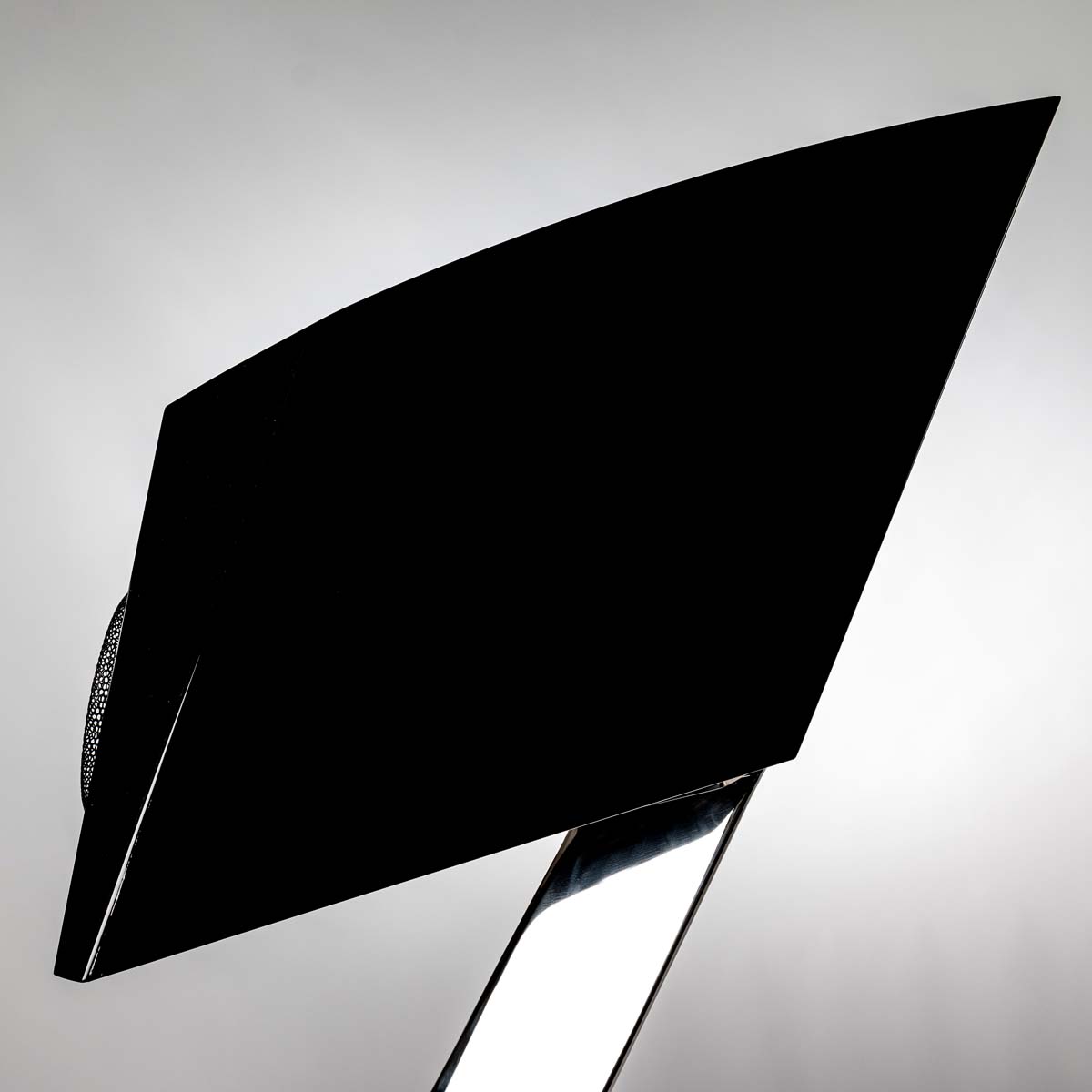 Die nötigen Bauteile der im Sockel integrierten Frequenzweiche stammen aus Mundorfs höchster Selektionsstufe und halten den Kontakt zur Außenwelt über Terminals von WBT. Der ausladende Fuß der Elite ist somit fixer Bestandteil des Konzepts, nicht nur optischer Schnickschnack. Auch das Gehäuse ist nicht allein Designstudie, sondern dient dem Zweck, eventuell im Inneren entstehende Reflexionen wie auch Kantenbrechungen der Schallwand zu unterbinden. Das Gehäuse verjüngt sich, einem Tropfen im freien Fall nicht unähnlich, in die Tiefe. Ergebnis des radikalen Designs ist ein Gehäuse ohne parallele Flächen, massiv wie ein Panzerschrank – Eigenresonanzen adieu!