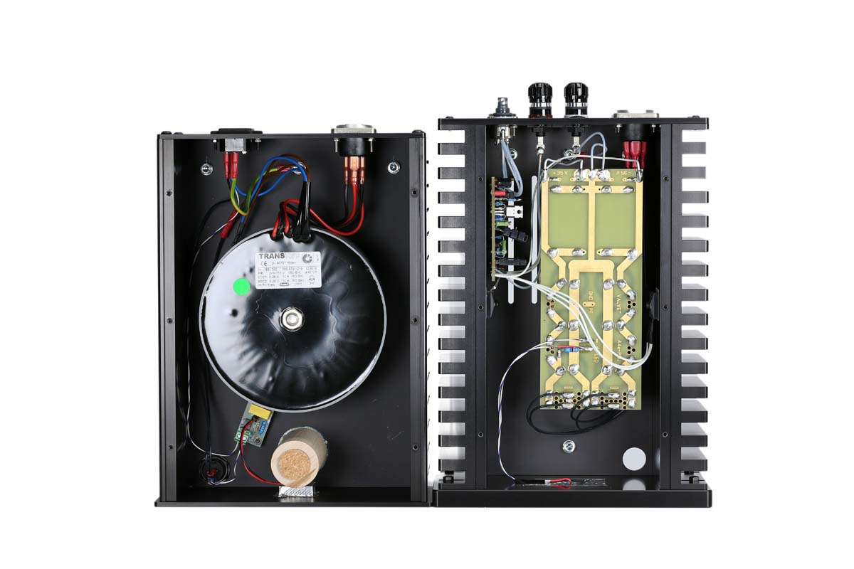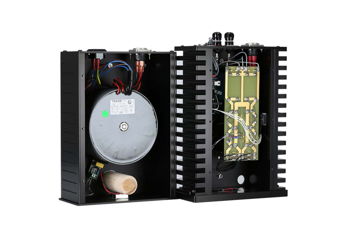 Zunächst einmal heißen die Endstufen jetzt A4e – das kleine „e“ steht für „externes Netzteil“. Somit hebt der geneigte Musikhörer beim Auspacken nun ächzend zwei schwere Kisten statt einer pro Kanal aus dem Karton: Die Netzteile wurden in externe Gehäuse ausgelagert und warten nun mit jeweils einem eigenen 500-VA-Ringkerntrafo auf. Sowohl Verstärker als auch Netzteile sind mit edlen Füßen von bFly-audio versehen und stehen somit nicht nur bombenfest, sondern auch bestens entkoppelt auf ihrem Untergrund. Gegenüber dem Vorgängermodell konnte überdies die Sinusleistung von 55 Watt auf 65 an 8 Ohm hochgeschraubt werden. Ebenfalls hochgeschraubt wurde auch der Preis: von seinerzeit 4750 Euro für die A4 auf nun 6900 Euro – wobei es sich laut Valvet wohlgemerkt um einen Einführungspreis handelt.