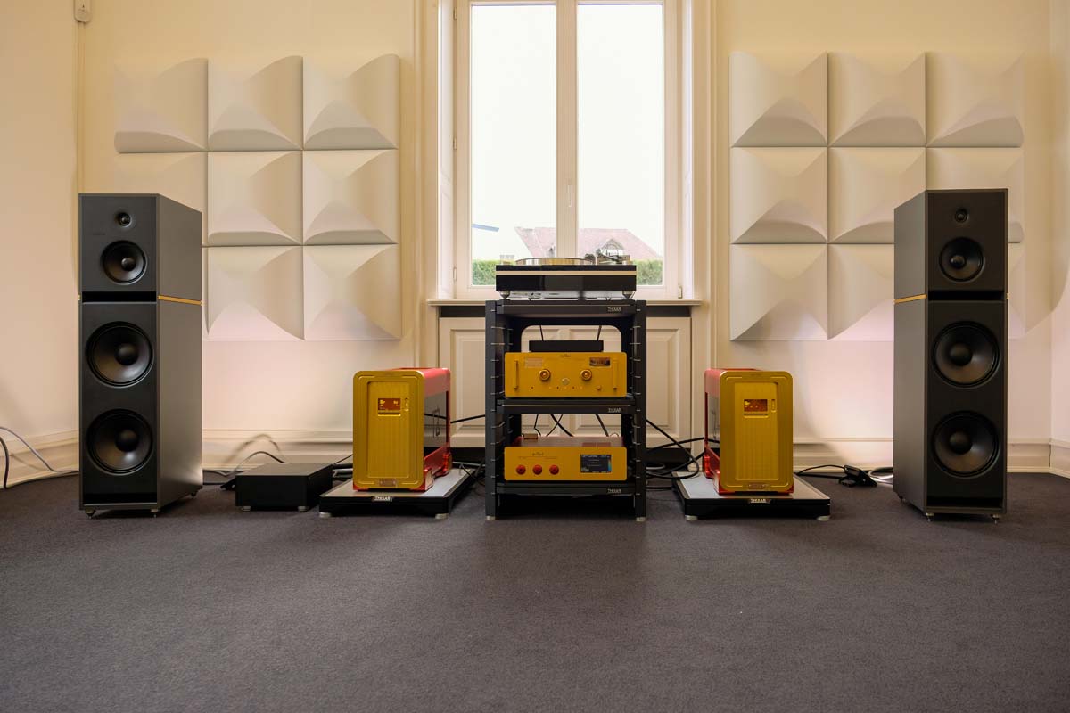 Während wir, am Ziel angekommen, in einem Besprechungsraum noch auf unsere (Spoiler: negativen) Schnelltestergebnisse warten, erklärt uns Markolf Heimann zum einen, was wir alles vorhaben würden, und ebenso, dass die passenden Antriebsquellen für die Stars der Show, ein Paar Stenheim Alumine FIVE, immer noch auf sich warten ließen – drei Tage nach dem geplanten Liefertermin. Aufgeschmissen ist man deswegen freilich keineswegs – die Anlage in der großen Halle im ersten Stock ist aufgestellt und spielt laut Heimann bereits auf den Punkt. Befeuert werden die Stenheims für den Augenblick nur eben nicht von der überfälligen Dartzeel-Elektronik, sondern „behelfsmäßig“ von einer ATC-Vorstufe und zwei Musical-Fidelity-Monoblöcken – wahrlich keine Kinder von Traurigkeit!