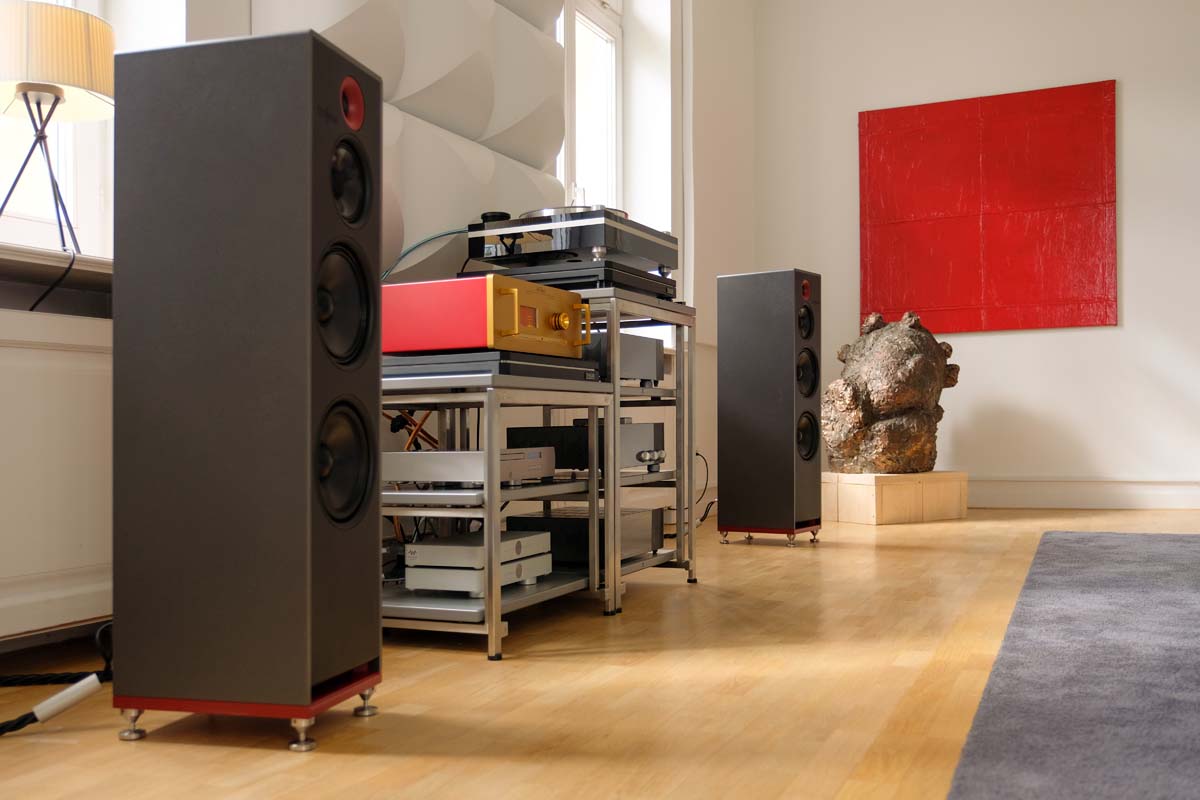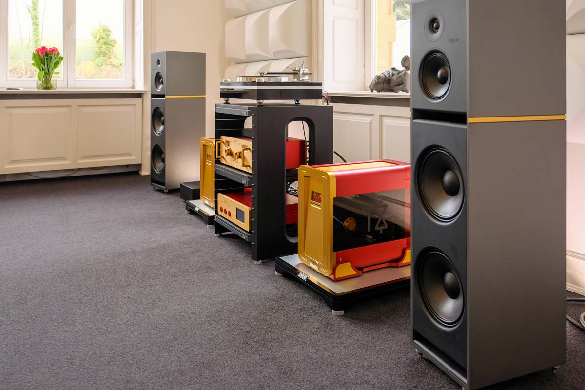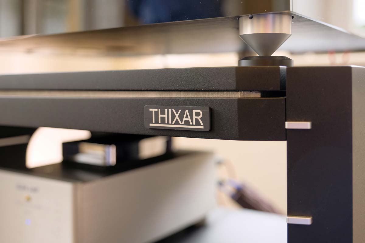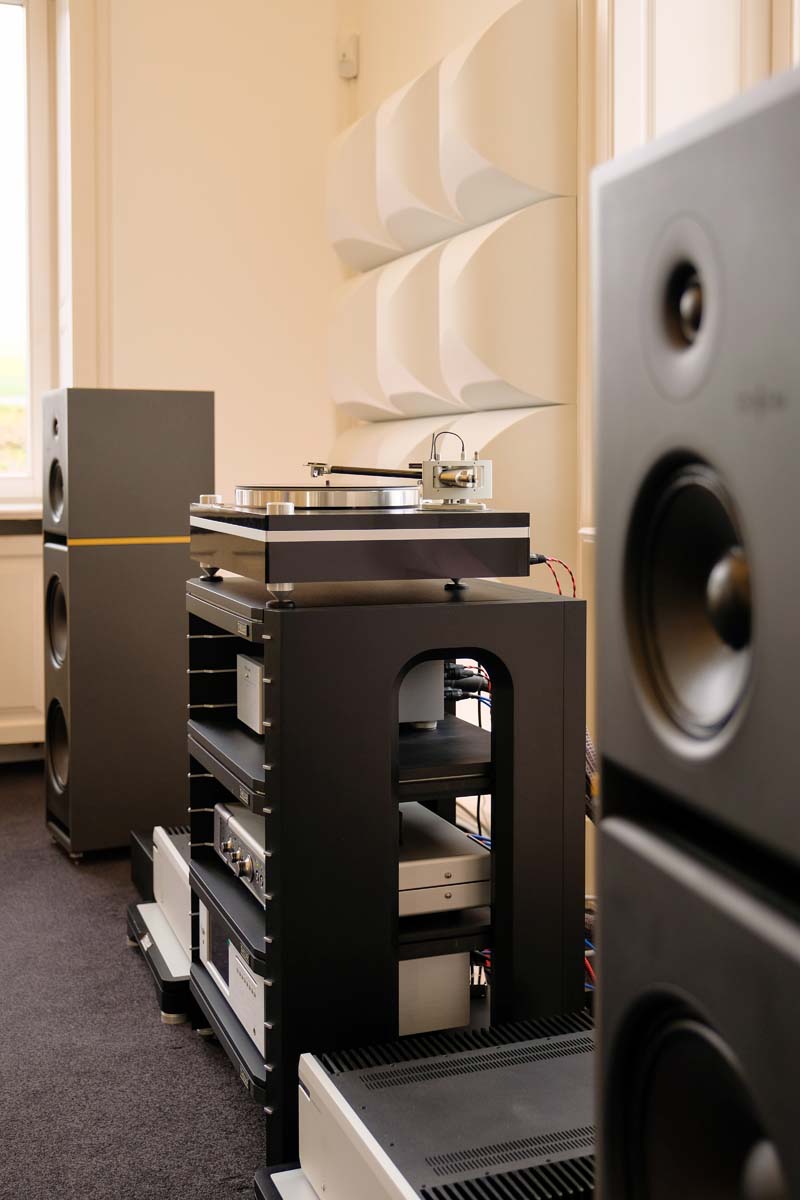 Wieder im großen Saal in der ersten Etage haben wir Gelegenheit, die Bekanntschaft des illustren Reigens geladener Gäste zu machen – alle wesentlichen Komponenten des zentralen HiFi-Setups werden hier höchstpersönlich durch ihre jeweiligen Schöpfer repräsentiert: Helmut Thiele steuert den Plattenspieler TT01 mit dem brillanten Tonarm TA01 bei, der das Beste der Welten der Radial- und Tangentialtonarme in sich vereint. Ebenso lernen wir Dirk Rüdell kennen, den Mann hinter der noch jungen Marke Thixar, deren Racksysteme und Verstärkerbasen sich die dämpfenden Eigenschaften eines speziellen thixotropen Gels zunutze machen. Besonders gefällt uns an dem Rack seine Flexibilität: In einem stabilen Hauptrahmen lassen sich ohne viel Aufwand beliebig viele Rackböden in beliebigen Abständen zueinander einsetzen. Und dann ist da natürlich Stenheim-Geschäftsführer Jean-Pascal Panchard, dessen Standlautsprecher Alumine FIVE die zentrale Rolle bei der Vorführung spielen. Mit ihm am Tisch sitzt Dartzeel-Gründer Hervé Delétraz, der seine Anspannung gekonnt mit seiner gemütlich-freundlichen Art in den Hintergrund drängt.