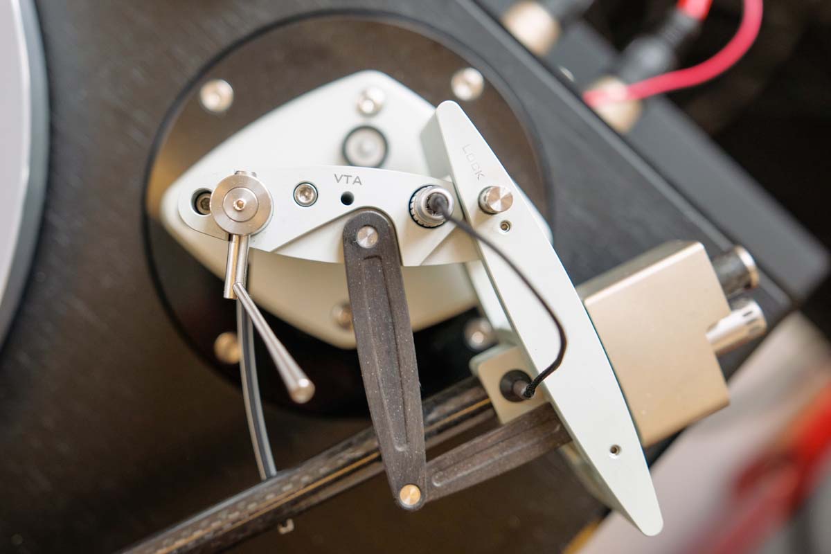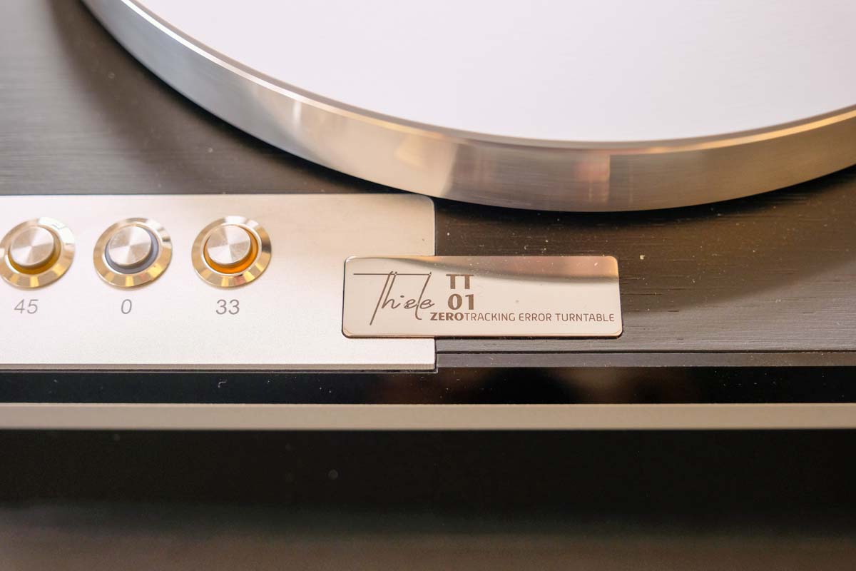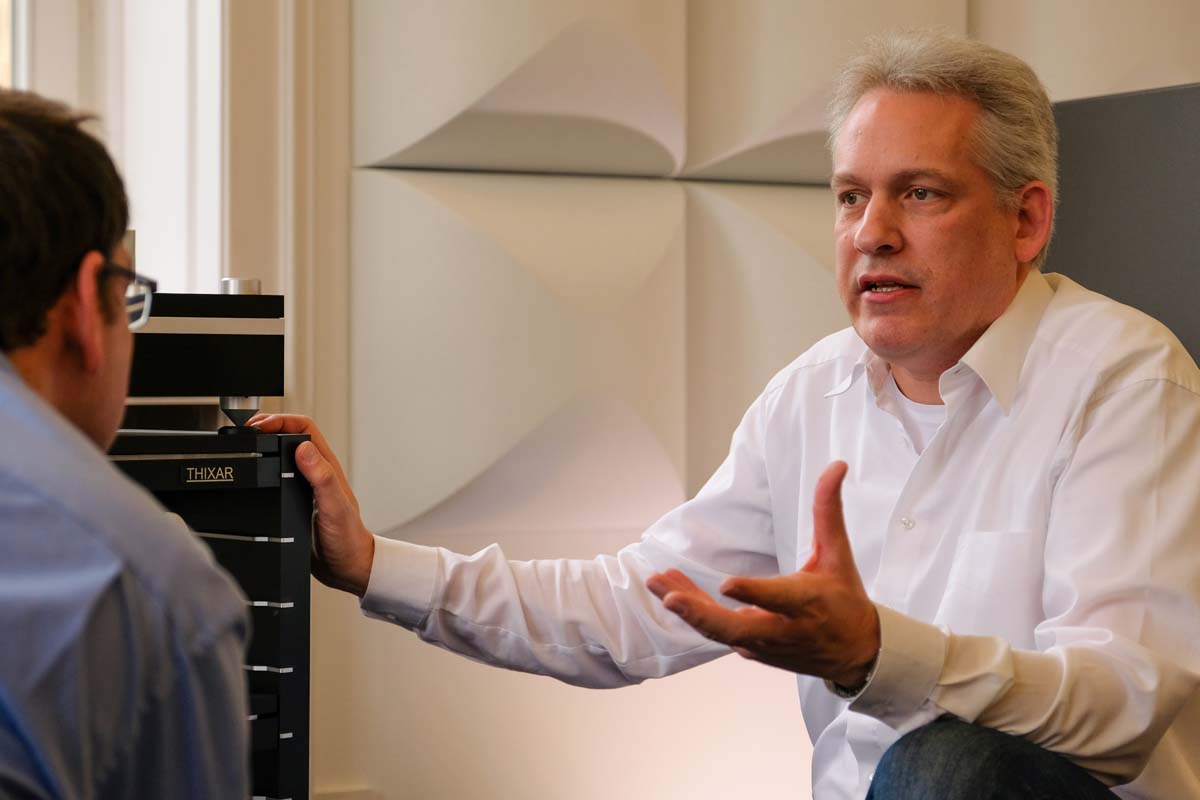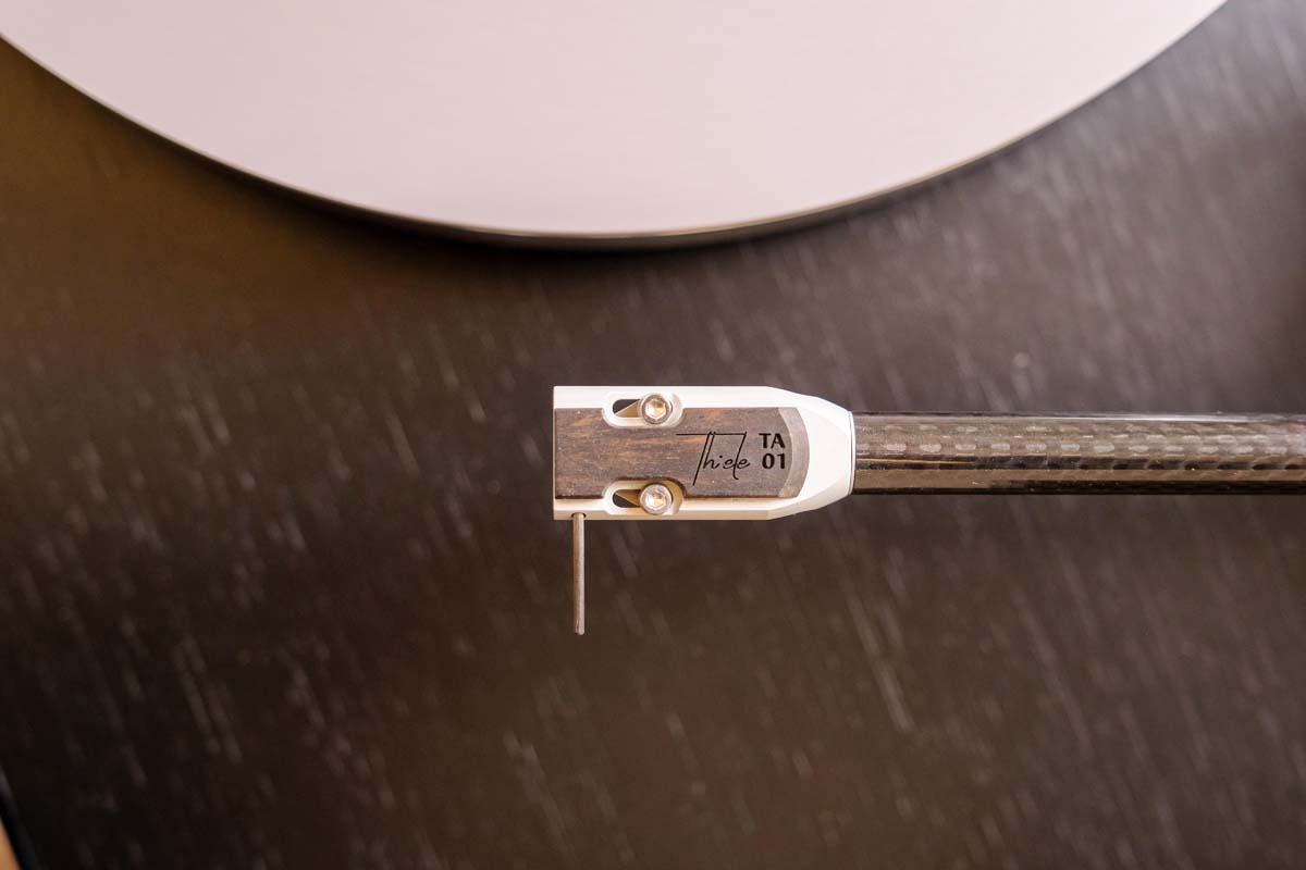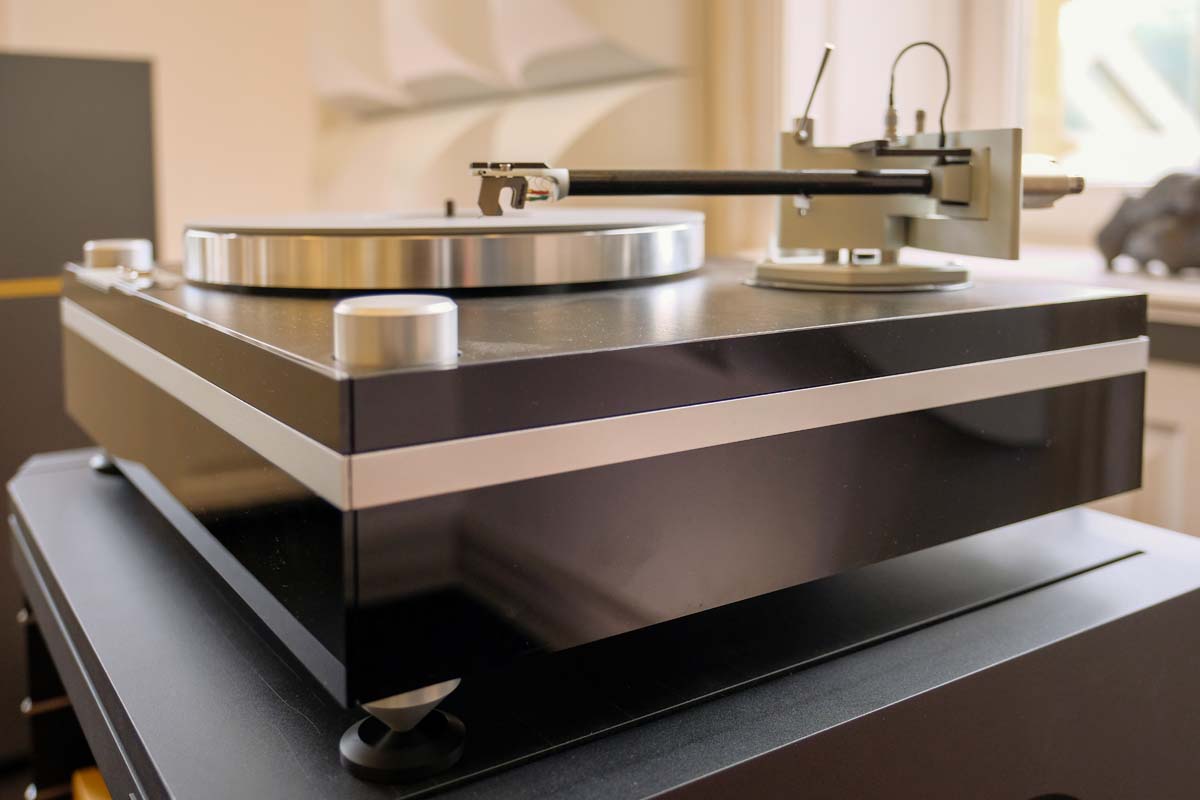 Wieder im großen Saal in der ersten Etage haben wir Gelegenheit, die Bekanntschaft des illustren Reigens geladener Gäste zu machen – alle wesentlichen Komponenten des zentralen HiFi-Setups werden hier höchstpersönlich durch ihre jeweiligen Schöpfer repräsentiert: Helmut Thiele steuert den Plattenspieler TT01 mit dem brillanten Tonarm TA01 bei, der das Beste der Welten der Radial- und Tangentialtonarme in sich vereint. Ebenso lernen wir Dirk Rüdell kennen, den Mann hinter der noch jungen Marke Thixar, deren Racksysteme und Verstärkerbasen sich die dämpfenden Eigenschaften eines speziellen thixotropen Gels zunutze machen. Besonders gefällt uns an dem Rack seine Flexibilität: In einem stabilen Hauptrahmen lassen sich ohne viel Aufwand beliebig viele Rackböden in beliebigen Abständen zueinander einsetzen. Und dann ist da natürlich Stenheim-Geschäftsführer Jean-Pascal Panchard, dessen Standlautsprecher Alumine FIVE die zentrale Rolle bei der Vorführung spielen. Mit ihm am Tisch sitzt Dartzeel-Gründer Hervé Delétraz, der seine Anspannung gekonnt mit seiner gemütlich-freundlichen Art in den Hintergrund drängt.