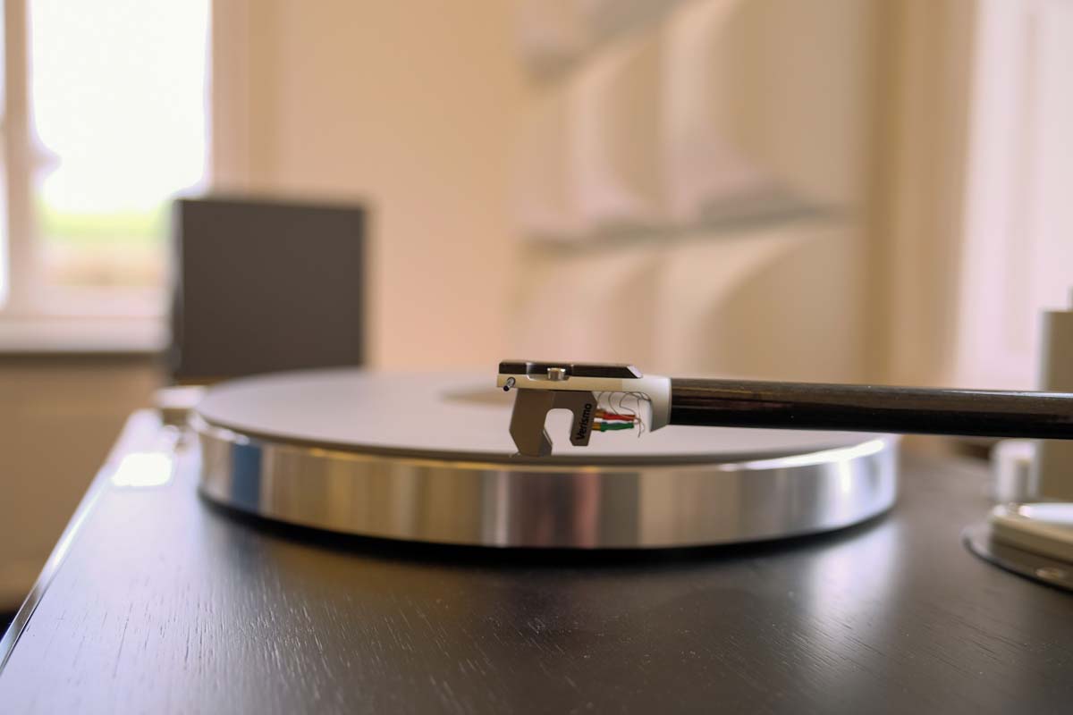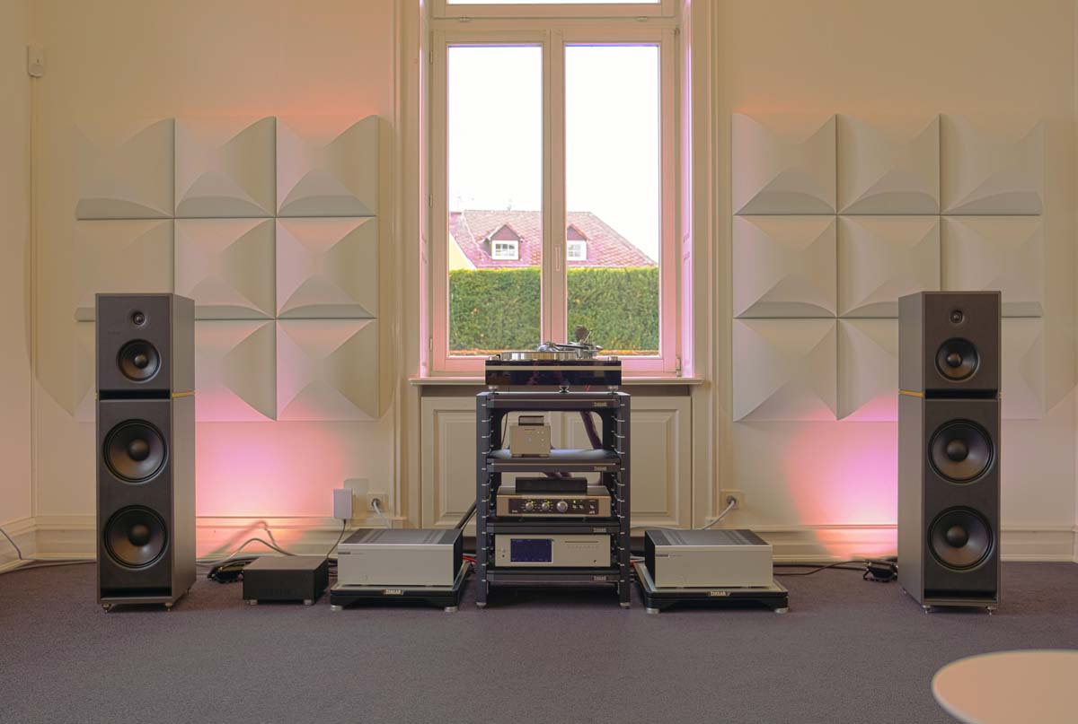 Meinen Kollegen Ralf Wolff-Boenisch und mich komplimentiert man in der Zwischenzeit eine Etage höher in das Hör-Wohnzimmer, wo uns ein Paar Stenheim Alumine THREE erwartet, das bereits an einem CTH-8550-Vollverstärker von Dartzeel hängt. Auch hier dient ein Thiele TT01 mit TA01 als Quelle. Verblüffenderweise hat man es hier tatsächlich geschafft, dem annähernd quadratischen Raum akustisch Manieren beizubringen. Die Alumine THREE von Stenheim, die in ihren Aluminiumgehäusen immerhin je zwei 20er-Bässe beherbergen, lassen sich hier keinerlei Oberbassdröhnen entlocken. Nach den ersten paar Stücken erheben sich einige der Hörer von ihren Sitzen und beginnen, mit kundigem Ohr den Raum auf der Suche nach stehenden Wellen, Auslöschungen und ähnlichem Unbill abzuschreiten, finden jedoch nichts Unbotmäßiges. Um uns noch mehr zu verwirren, sind die Alumine THREE auch noch recht wandnah aufgestellt, was der gängigen Lehrmeinung zufolge Bassprobleme ja nur noch verschärfen sollte. Allerdings – und hier vermuten wir des Rätsels Lösung, stehen die Lautsprecher direkt vor den beiden Fenstern. Eingenommen von unserem akustischen Forschungsdrang ignorieren wir den Ausblick zum Rhein und machen den Fingerkuppentest. In der Tat kann man spüren, wie die Glaspaneele mit den Bassanteilen mitvibrieren – nicht dramatisch, aber merklich. Wie ich von ATR-Mann Thomas Müller erzählt bekomme, hat man hier durchaus ein wenig experimentieren müssen, bevor man für die Lautsprecher exakt die richtige Position gefunden hat, in der sich zwei klassische raumakustische Probleme gewissermaßen gegenseitig aufheben.