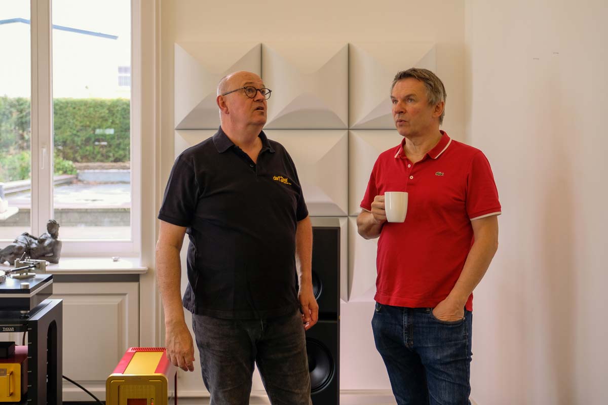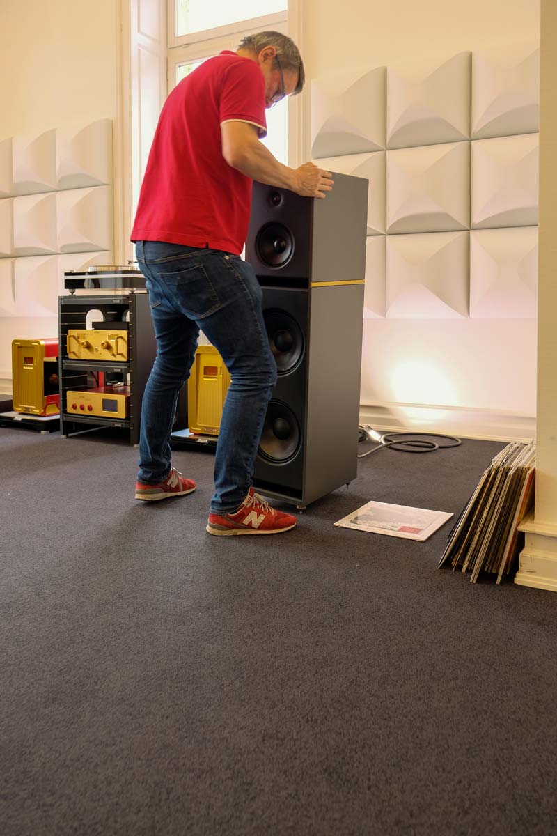 Zurück im ersten Stock. An Dartzeels NHB-468-Monoblöcken können die Stenheim Alumine FIVE nun zeigen, was sie wirklich können, während Armin Kern uns als DJ und Master of Ceremonies in Personalunion durch seine Schallplattensammlung führt. Allerdings stellen wir bald fest, dass die Aufstellungsarbeit noch nicht ganz abgeschlossen ist. Mit dem Stück „Midnight Sugar“ vom gleichnamigen Album zeigt uns das Tsuyoshi Yamamoto Trio eine Raummode auf, die genau auf einem immer wieder angerissenen Kontrabasston liegt. Mit Zollstock und Laser-Entfernungsmesser bewaffnet machen sich Jean-Pascal Panchard und Hervé Delétraz sogleich ans Werk: In mehreren, von Hörproben unterbrochenen Durchgängen werden die Lautsprecher zentimeterweise verrückt und es wird mit der Einwinkelung gespielt, bis die stehende Welle gebändigt ist. In der Tat fällt der klangliche Zugewinn schon nach den ersten Takten auf – die Bühne greift zu den Seiten viel weiter über die Lautsprecher hinaus, dazu gesellt sich eine Dynamik, bei der einem forsch gespielte Klavierakkorde auch schon mal einen leichten Schrecken einjagen können. Jetzt erst kann sich Armin Kerns herrlich eklektisches Musikprogramm, das sich von Jazz über Schtschedrins Carmen-Arrangement bis hin zu Nina Hagen erstreckt, voll entfalten.