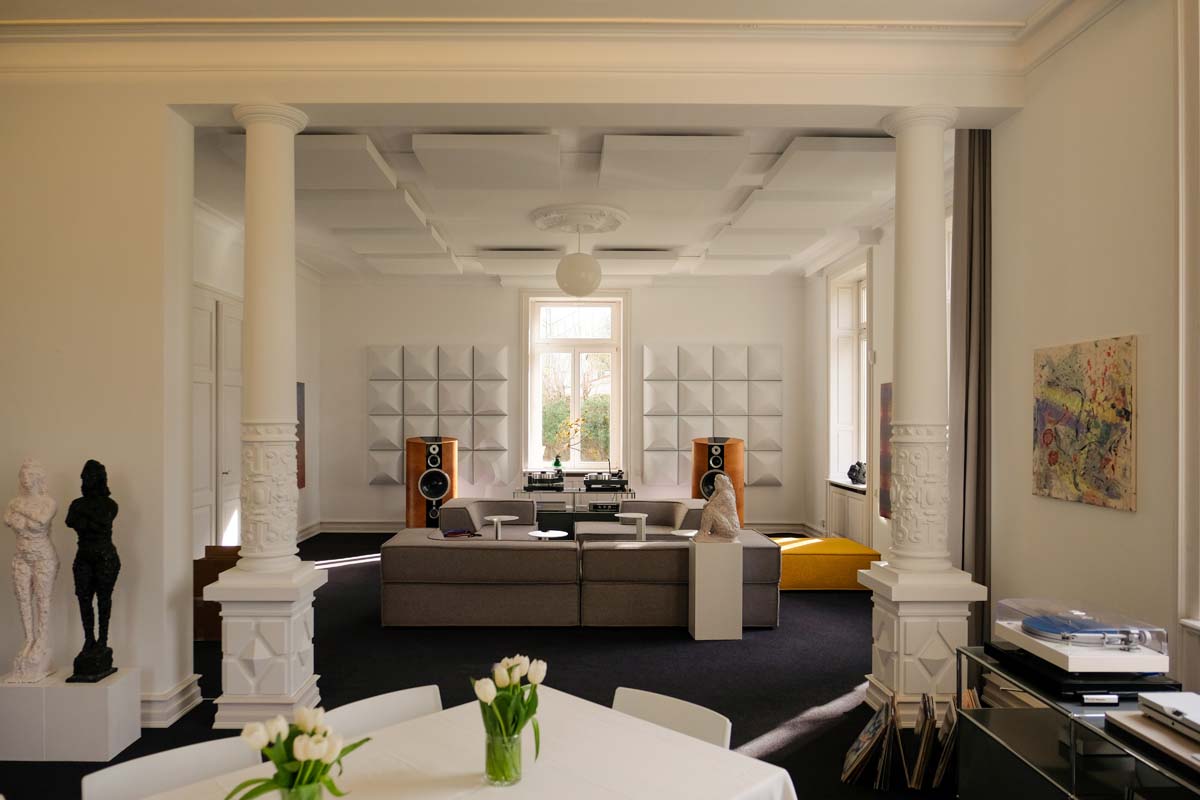 Studiotauglich? Natürlich nicht – auch ohne Messungen durchzuführen wissen wir, dass Glasflächen Bassenergie über ein deutlich breiteres Frequenzband hinweg absaugen als die Dröhnspitzen, die sich aus angeregten Raummoden ergeben. Doch auch hier zeigt sich wieder die ATR-Philosophie von ihrer besten Seite: Statt messtechnischer Perfektion haben wir ein lebensnahes Aufstellungsszenario vor uns, das eindrucksvoll belegt, wie gut sich die Raumakustik in einem suboptimalen Zimmer beherrschen lässt, wenn Fachleute, die wissen, was sie tun, für die Aufstellung verantwortlich sind. Das Klangbild ist absolut ausgewogen, der Bass ist vollständig und präsent und bleibt dabei jederzeit bestens durchhörbar. Nur, um es einmal wirklich klar auszudrücken: Die Akustik haut hier nicht nur so einigermaßen hin – vier erfahrene Hörer, die aktiv nach Problemen suchten, konnten nichts Nennenswertes finden. Doch genug geforscht, bald setzt sich alles wieder, und bei One Night In San Francisco von Al Di Meola, John McLaughlin und Paco de Lucía überzeugen wir uns von den Meriten des Thiele-Dartzeel-Stenheim-Gespanns. Das Klangbild gerät offenbar so stimmig, dass nun endlich die Sonne hinter den Wolken hervorbricht und sowohl den Rhein als auch die stilvollen Räumlichkeiten so in Szene setzt, wie es ihnen gebührt.
