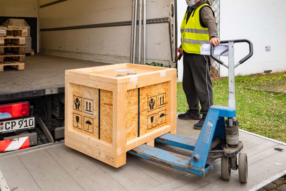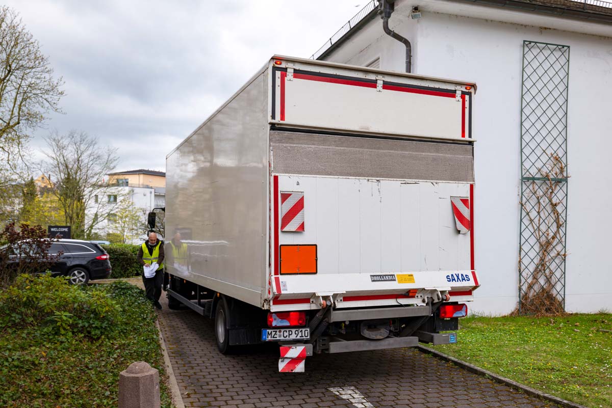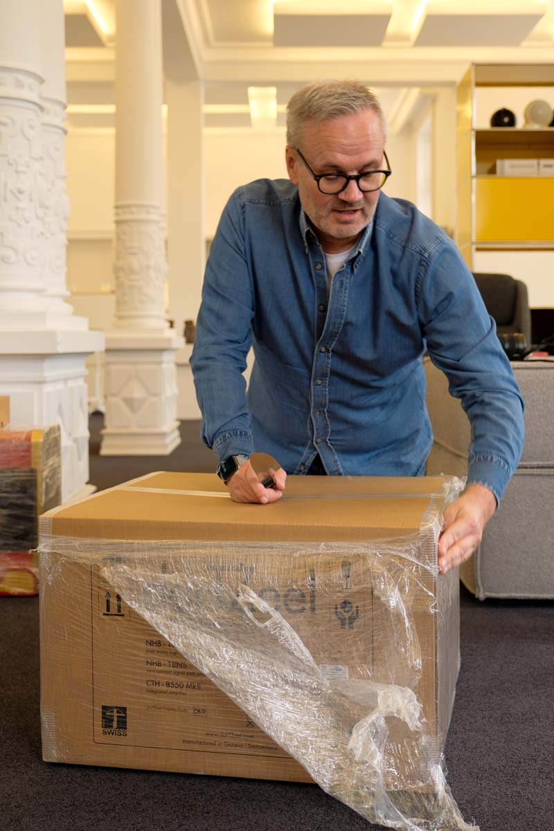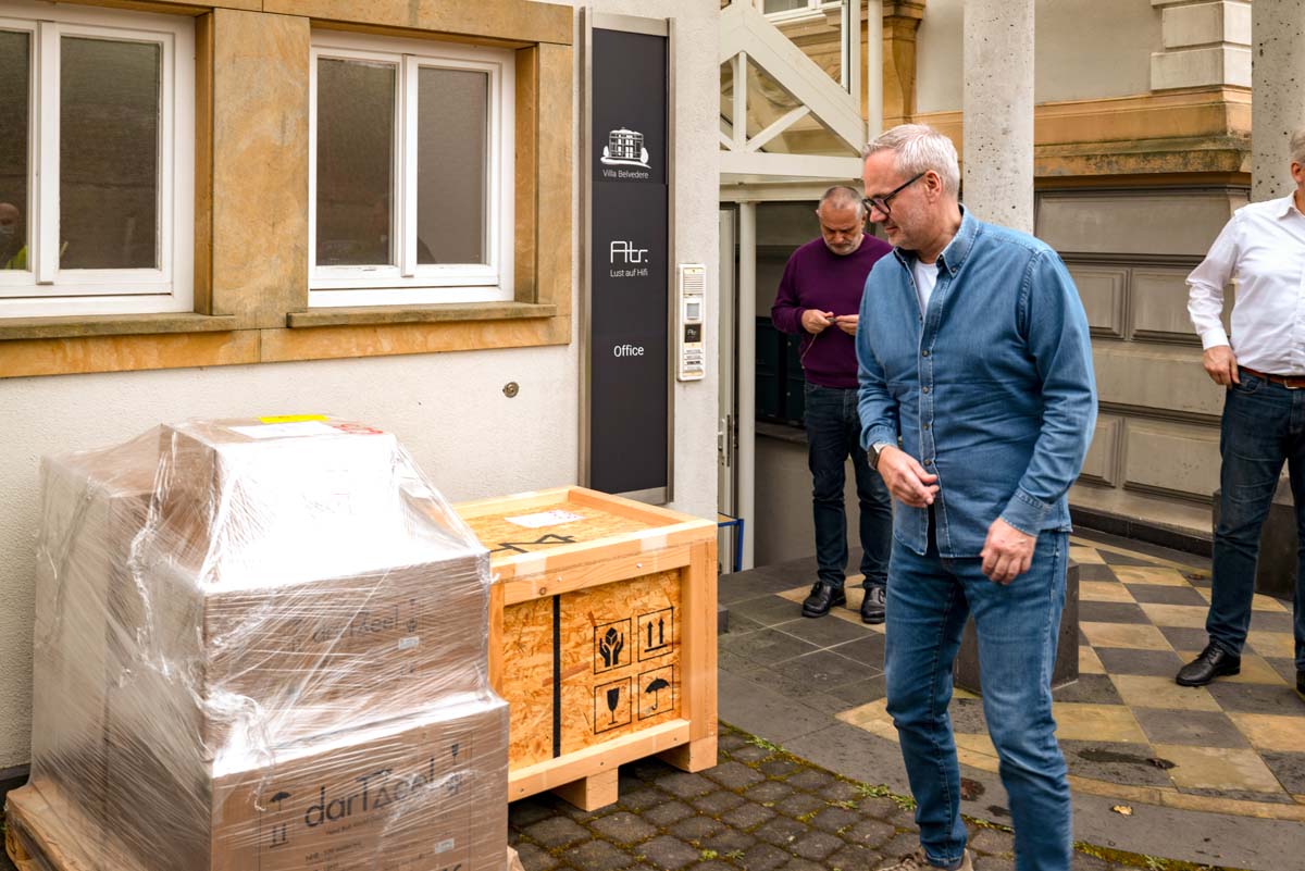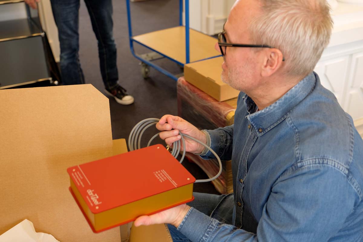 Bis Manuela Heimann mit den Worten „Ein Lastwagen steht auf dem Hof!“ die Treppe heraufkommt. Alle Gespräche werden augenblicklich unterbrochen, die ganze Aufmerksamkeit gilt der Lieferung. Augenblicke darauf steht fest, dass es sich in der Tat um die heiß ersehnten Komponenten handelt, Erleichterung breitet sich unter den Anwesenden aus, allen voran atmet natürlich Hervé Delétraz auf. Frisch gestärkt mit belegten Semmeln besitzen wir die nötige Kraft, die fünf Komponenten, darunter zwei 70-Kilogramm-Endstufen, in den Hörsaal zu schaffen und aus den Kartonagen zu hieven. Die eingangs beschriebene Szene, die unmittelbar darauf folgt, kann man auch abgebrühten Profis nicht übel nehmen.