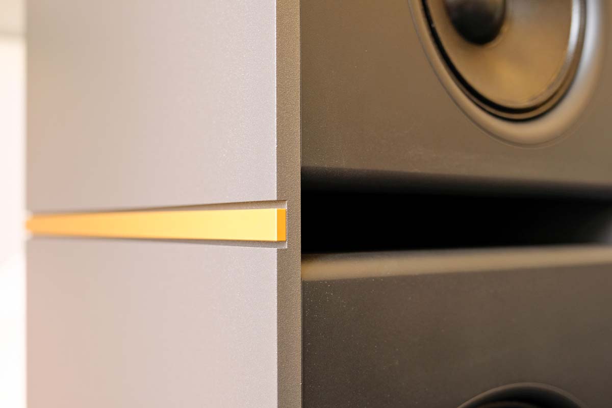 Besonderheiten: Aluminiumgehäuse mit 12-mm-Wandstärke, doppelt gefaltete Textilsicken an den Mittel- und Tieftönern, vier separate Gehäusekammern (Hochton, Mittelton, je eine Kammer pro Tieftöner)