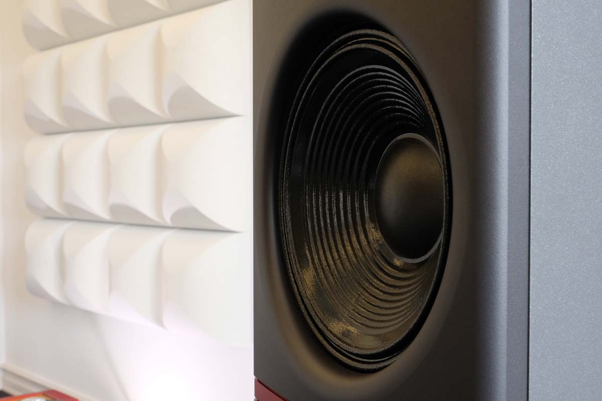 Die Entwickler wussten auch genau, wieso sie den ganzen Aufwand treiben, schließlich geht es bei Stenheim nicht nur um die akkurate Reproduktion des Signals – das bekommen viele Lautsprecher ziemlich gut hin, doch nur wenige sind in der Lage, die Dynamik eines – gerne auch unverstärkten – Konzertes glaubhaft ins Wohnzimmer zu transportieren. Stenheim stemmt sich gegen diesen Stand der Dinge und legt demnach besonders großen Wert auf Dynamikreserven im Überfluss. Bei der Ultime Two manifestiert sich das in Gestalt von zwei 30-Zentimeter-Papierbässen sowie zwei 17er-Mitteltönern gleicher Machart, die sich symmetrisch auf der Schallwand verteilen. Wie bei Stenheim üblich, kommt bei allen Konustreibern die ebenso ungewöhnliche wie markante doppelt gefaltete Textilsicke zum Einsatz, wodurch die Chassis besonders zackig ansprechen sollen. Dank des Zusammenspiels aus Gehäusevolumen und Membranfläche kommt das Design völlig ohne Hornvorsätze aus und kann dennoch mit einer Empfindlichkeit von stattlichen 95 Dezibel aufwarten.