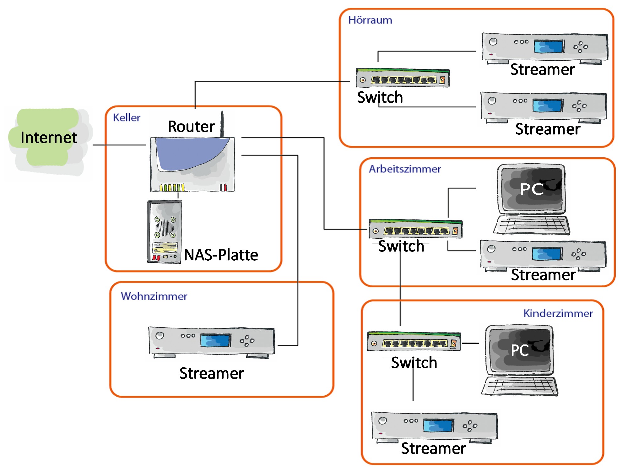 Dies ist der kleinste Aufbau eines Streaming-Netzwerks. Das Einfachste ist auch hierbei die Verkabelung: Alle Geräte werden mittels LANKabel an den Switch angeschlossen. Im zweiten Schritt werden die IPAdressen bei jedem Gerät eingetragen. Sobald das erfolgt ist, sollte der Streaming Client automatisch die DLNA-Quelle erkennen und die Musiktitel anbieten. Wenn Sie jetzt vom PC ihre Musiktitel in den Ordner „Music“ der DLNA-Platte speichern, erkennt der Streaming Client diese und bietet sie zum Abspielen an.Variante 2: Kleines Einraumnetzwerk mit Internet-Zugang
