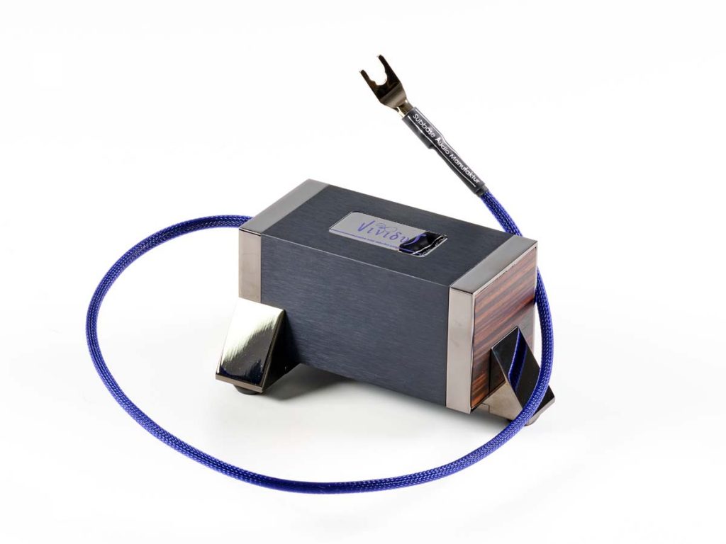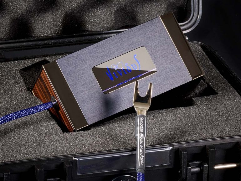 Vividus (lateinisch für „belebt“) ist anders. Im Postpaket liegt ein klitzekleiner stoßfester Tragekoffer, in dem sich ein genauso kleiner Quader – Abmessungen zehn mal zwölf mal 7,5 Zentimeter – verbirgt, aus dem ein an der Schmalseite vergleichsweise dünnes, aber steifes Kabel kommt, dessen Abschluss beim Testgerät auf Wunsch des Rezensenten ein üppig dimensionierter Kabelschuh bildet. Weiße Handschuhe liegen auch noch in dem Köfferchen; auf den edel dunkel verchromten Rahmenteilen (in denen auch die Standfüße integriert sind) und auf dem hübschen Zebrano-Holzgehäuse sollen ja keine hässlichen Fingerabdrücke hinterlassen werden.
