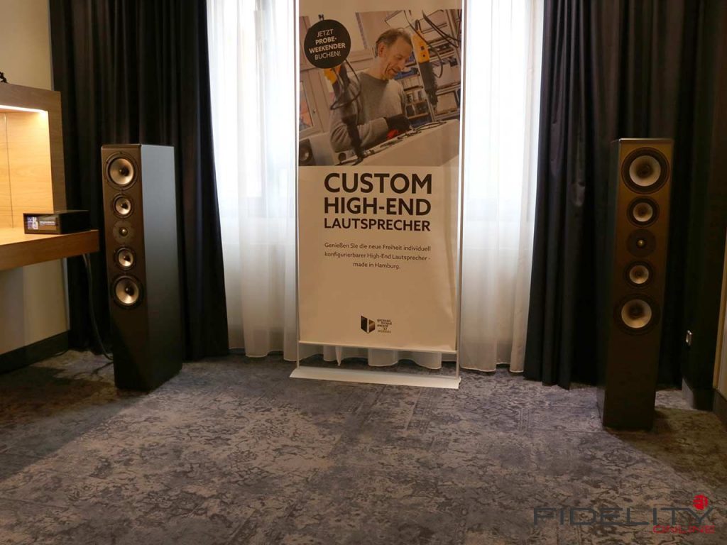 Folgte man der Galerie durch den halbrunden Anbau des Hotels, in dem die großen Showrooms untergebracht sind, gelangte man in zwei kleine Ausstellflächen, die von Kef, Hörzone und TAD (Tannoy, Gold Note etc.) belegt wurden. Dahinter gelangte man in den ersten Hotelflur. Ähnlich wie in Hamburg (um ehrlich zu sein: auf Fotos könnte man die Hotels nicht voneinander unterscheiden) reihte sich hier Aussteller an Aussteller. Alle Aufzulisten würde jeden Rahmen sprengen. Wenn Sie wissen möchten, wer vor Ort war, klicken Sie auf den Link zum Veranstalter ganz unten. Der Messe-Laufzettel kann dort immer noch als PDF heruntergeladen werden.
