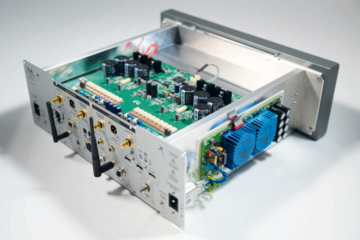 Die typische Hauptaufgabe dieser eierlegenden Wollmilchsau dürfte allerdings das Streaming sein. Das hauseigene Modul bietet hier selbstredend Kompatibilität zu allen gängigen Anbietern, ebenso empfängt der Receiver FM, FM-HD und DAB+. Mit Airable ist auch bereits ein Musikmanager eingebunden, der zahlreiche Streamingdienste wie Tidal, Qobuz, Deezer und Amazon Music verwalten kann, dessen Fokus aber insgesamt deutlich mehr in Richtung Internetradio geht. Was derzeit noch fehlt, ist die Roon-Einbindung – das liegt allerdings nur daran, dass der Zertifizierungsvorgang noch nicht abgeschlossen ist. Sobald der über die Bühne ist, wird ein Firmware-Update auch diese Funktion bereitstellen. In einer Welt, in der praktisch jeder ernstzunehmende D/A-Wandler über einen regelbaren Ausgang verfügt und die besseren Vertreter dieser Gattung auch klanglich voll überzeugen, könnte man natürlich annehmen, der PSD 3100 HV sei ein ebensolcher regelbarer Streaming-DAC – doch weit gefehlt: Tatsächlich arbeitet T+A hier mit einer diskret aufgebauten Class-A-Vorverstärkerschaltung mit relaisgesteuerter Pegelsteuerung. Statt etwaige Bitratenprobleme clever zu umschiffen, sorgen die Herforder schlicht dafür, dass solche gar nicht erst auftreten können. Überhaupt treibt T+A – wie von der Marke nicht anders gewohnt – einen erfreulich hohen konstruktiven Aufwand. Dass die analogen und digitalen Schaltungen streng voneinander getrennt sind, ist in der Preisklasse nicht weiter verwunderlich; dass die Trennung so konsequent durchgezogen ist, dass jede Sektion über ein eigenes Netzkabel gespeist wird, sieht man dagegen nicht alle Tage. Auch auf der digitalen Seite nimmt T+A keine Gefangenen: Die Wandlersektion ist als vierfache Doppel-Differenzialschaltung aufgebaut und vertraut entsprechend auf ganze acht 32-Bit-DAC-Chips des in Kennerkreisen hochgeschätzten relativen Underdogs Burr-Brown, mit deren Hilfe er PCM-Signale mit bis zu 768 Kilobit pro Sekunde dekodieren kann. Um DSD kümmert sich unterdessen ein hauseigener True-1-Bit-DSD-Wandler – wir sprechen hier also nicht von DoP, sondern tatsächlich von nativer Wandlung von Single-Bit-Strömen ohne den üblichen Umweg über Wortpakete. Auch wenn DoP letztlich nur ein kleiner „Schmuggeltrick“ ist, der an den Daten an sich nichts ändert, ist im Zweifel der direkte Weg immer der bessere.