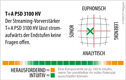 Am Ende meiner Hördurchgänge war ich glatt geneigt, den PSD 3100 HV als „T+M – Technik und Musik“ zu betiteln. Pragmatisch gesehen ist er die Antwort auf alle digitalen Musikfragen – von Internetradio über Streaming bis hin zur Einbindung des Fernsehers bewältigt er praktisch jeden denkbaren Bedarf im Alleingang. Er lässt sich ebenso gerne im Verbund mit einem Paar Aktivlautsprecher als Komplett-Setup betreiben wie zwischen externen Quellen und einem Paar dicker Monoblöcke zu einer ausgewachsenen Kette erweitern. Vor allem aber bewegt er sich nicht nur klanglich auf Referenzniveau – wer einmal den zugegebenermaßen satten Betrag investiert, wird sich für mindestens ein Jahrzehnt zurücklehnen können.