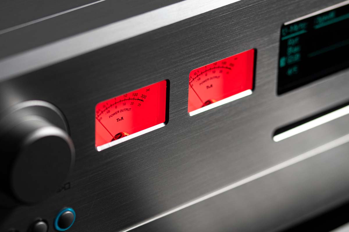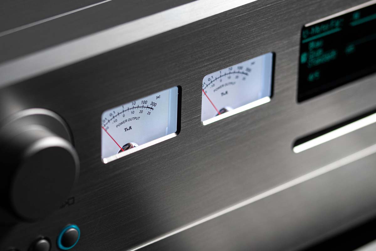 Wie bei allen Geräten von T+A unterstreicht auch beim R 2500 R ein perfekt verarbeitetes Gehäuse aus gebürstetem Aluminium, das wahlweise in Silber oder Schwarz erhältlich ist, den musikalischen Genuss. Zeichneten sich frühere Mitglieder der seit 1992 etablierten Serie vor allem auch durch ihr flaches Design aus, so ist der R 2500 R mit vierzehn Kilogramm schon ein recht eindrucksvoller Brocken. Auf der Front finden sich insgesamt elf eindeutig beschrifte Taster, die von zwei Drehreglern und zwei analogen Zeigerinstrumenten begleitet werden. Letztere geben Hinweise darauf, wie groß in etwa die abgegebene Leistung gerade ist. Die beiden großen Drehregler sind aus Metall und machen einen gediegenen Eindruck. Der rechte verändert die Lautstärke, was im Inneren des Geräts mit einem leisen Klacken honoriert wird. Der R 2500 R besitzt statt eines klassischen Potentiometers nämlich ein Widerstandsnetzwerk aus unzähligen Relais und Einzelwiderständen, das die Lautstärke praktisch verschleißfrei über viele Jahre hinweg in sehr feinen Abstufungen präzise regelt. Höchstwahrscheinlich wird der Besitzer den T+A aber eher selten über die Frontplatte bedienen und stattdessen zu der übersichtlich gestalteten und hochwertigen Fernbedienung greifen oder mit der gut strukturierten App via Smartphone steuern.