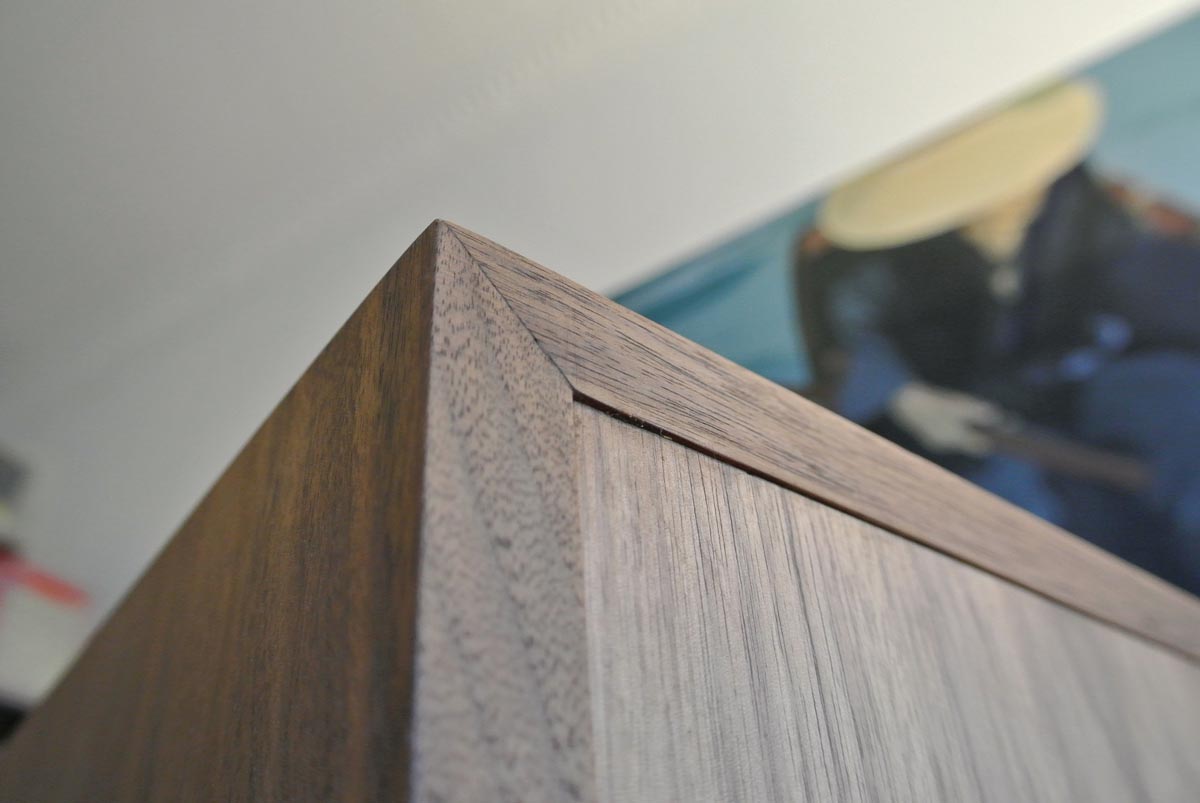 Und dann heißt es erst einmal durch die Zähne atmen. Ja, das Design polarisiert. Wir sprechen bei der Turnberry und generell bei allen Prestige-Lautsprechern von einem ausgewachsenen Trumm aus massivem Walnussholz, etwa doppelt so breit, wie man es von klassischen Säulenboxen kennt. Man muss das mögen, und zwar im Wortsinne, denn es gibt in Sachen Finish keinerlei Alternativen. Walnuss und Ende!