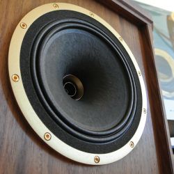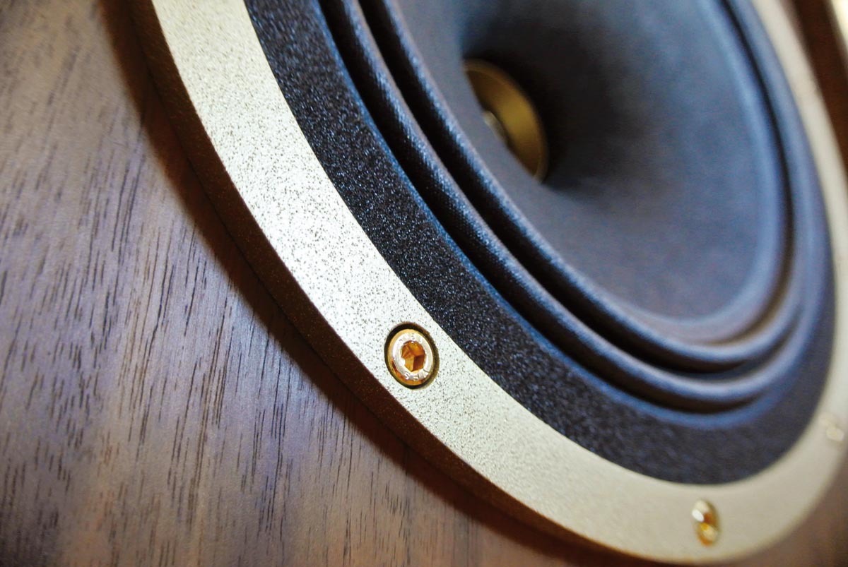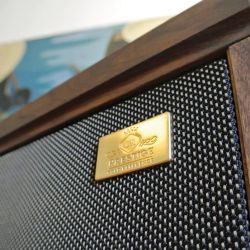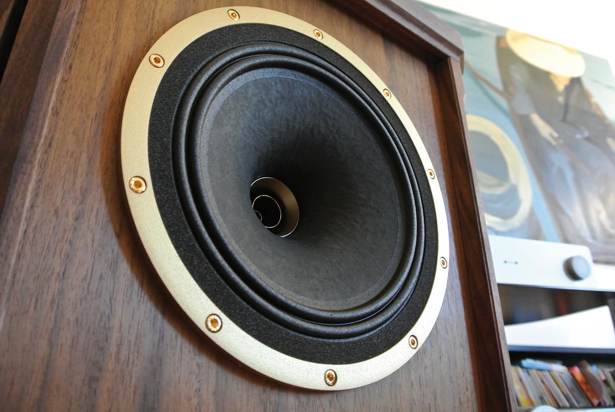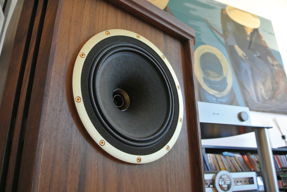 Wenn noch dazu die handwerklich sehr aufwendig gefertigte Bespannung angeschraubt ist, könnte man die Turnberry sofort für ein altertümliches Möbelstück halten. Mit abgenommener Bespannung hingegen macht sie eher einem Probenraum- oder PA-Lautsprecher alle Ehre. Wir sehen nämlich außer einer Menge Holz lediglich einen obszön großen Dual-Concentric-Treiber mit 25 Zentimeter Durchmesser sowie am unteren Rand der Box eine geheimnisvoll wirkende Metallapplikation mit fünf Bohrungen. Im Auslieferungszustand steckt eine entsprechende Schraube in der mittleren Bohrung. Doch dazu später. Während die „Drehbeeren“ eingespielt werden, gönnen wir uns vielleicht einen kurzen Exkurs zur Modellgeschichte.