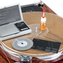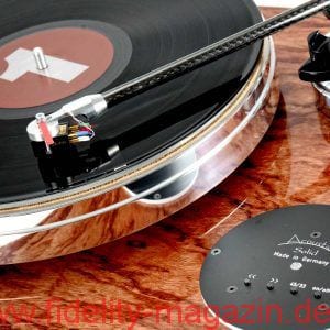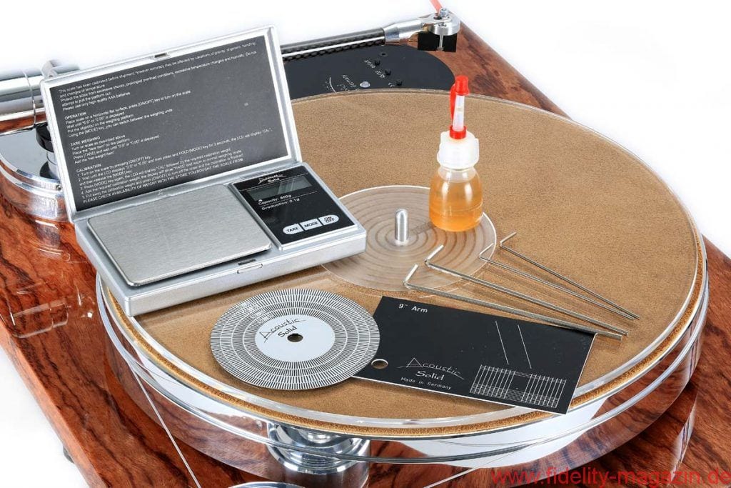 In der Testkonfiguration ist der Acoustic Solid mit einem Neun-Zoll-WTB-213-Tonarm mit geradem Carbonrohr sowie dem MC-Abtaster Denon DL-103R ausgestattet. Der ausgesprochen großzügige Lieferumfang umfasst nicht nur Abstands- und Überhanglehren und die erforderlichen Inbusschlüssel, sondern neben Lageröl auch eine Tonarmwaage, sodass sich das Gegengewicht exakt an die erforderliche Position drehen lässt.