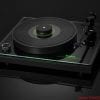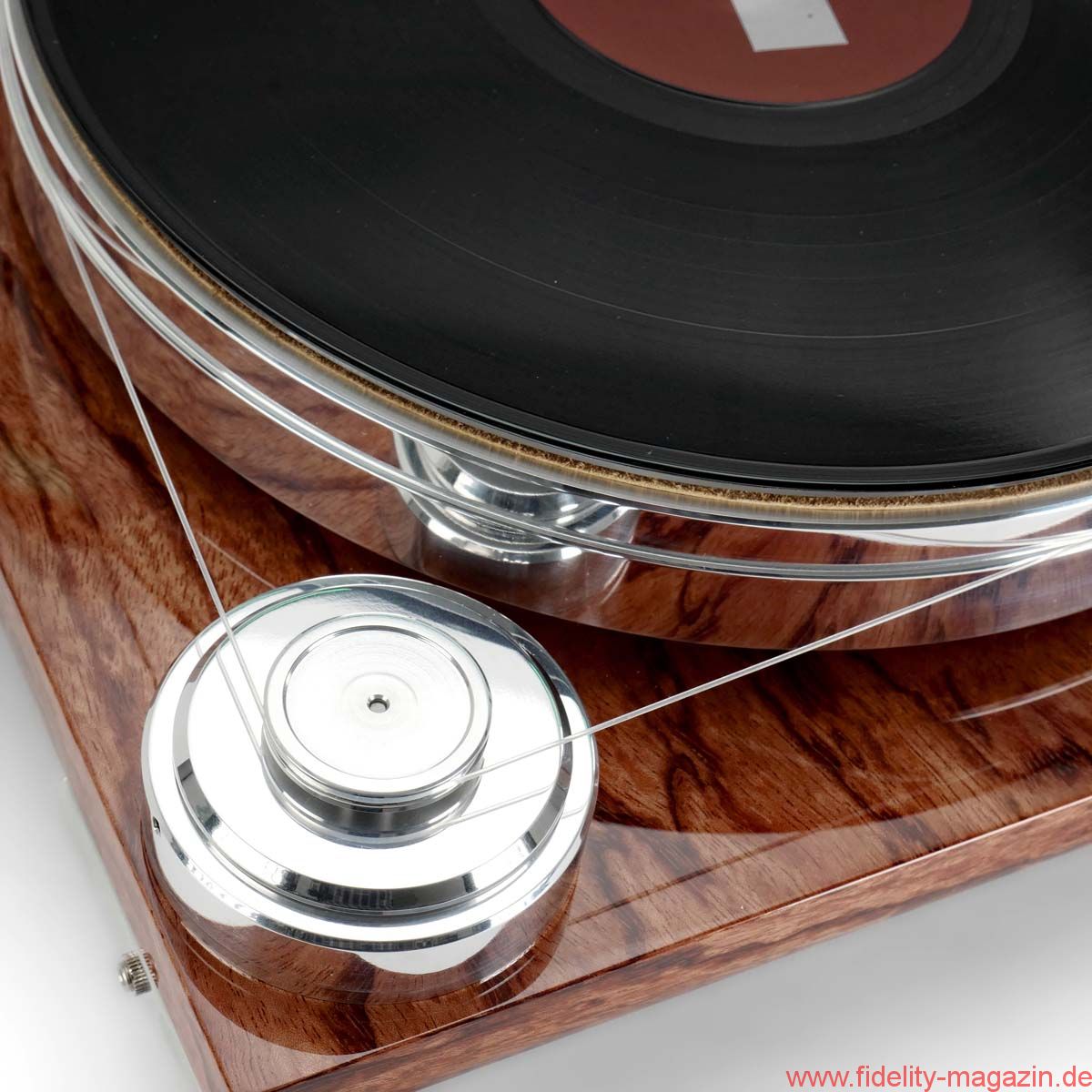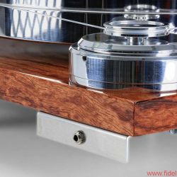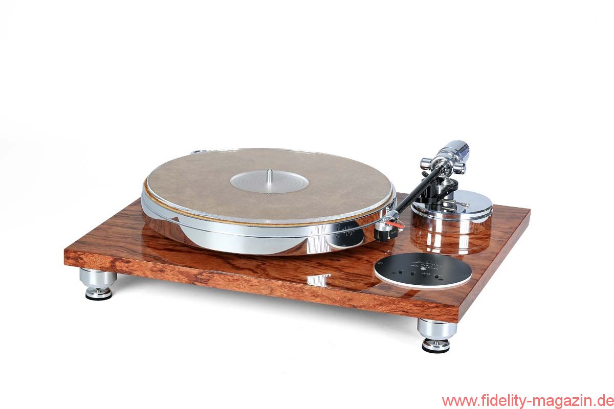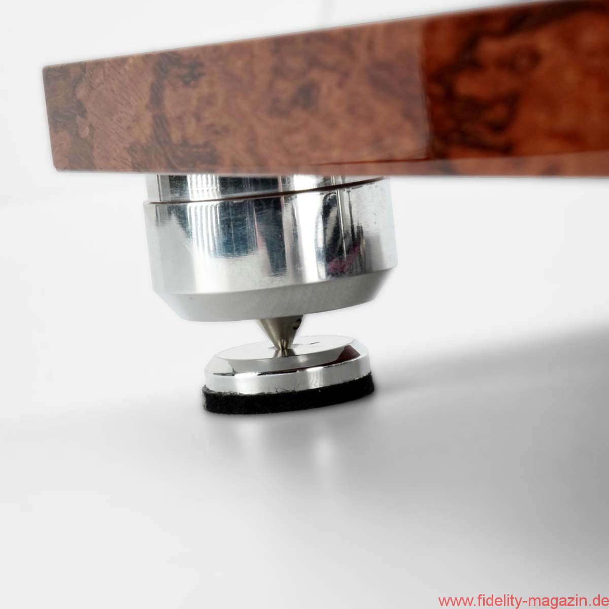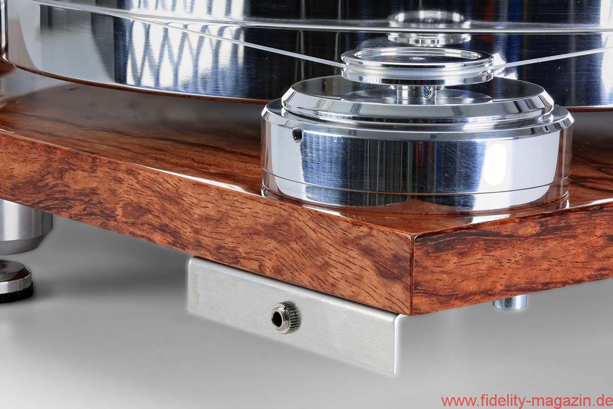 Das Chassis thront auf drei Spikes, die ihrerseits auf möbelfreundlichen und der weiteren Entkoppelung dienenden Unterlegern stehen. In die Waage gebracht wird es durch Verstellen der Spikes, die mit einem beiliegenden Inbus zu lösen und zu bewegen sind. Der Synchronmotor ist fest im Chassis montiert, was weiteres Hantieren mit Abstandslehren erspart. Er wird mit einem externen mikrocontrollergesteuerten Netzteil betrieben und über ein auf der rechten Frontseite angebrachtes Steuerungsfeld bedient. Kleine Taster erlauben das An- und Ausschalten sowie die Vorwahl der Geschwindigkeiten 33 und 45 U/min, die sich bei Bedarf feinjustieren lassen. Für den Anlauf des 35 Millimeter hohen Aluminium-Plattentellers mittels Silikonriemens auf LP-Geschwindigkeit braucht es um die 13, 14 Sekunden; eine durchgängig grün (bei 45 U/min rot) leuchtende LED oberhalb der Taster informiert über die erreichte Reisegeschwindigkeit.