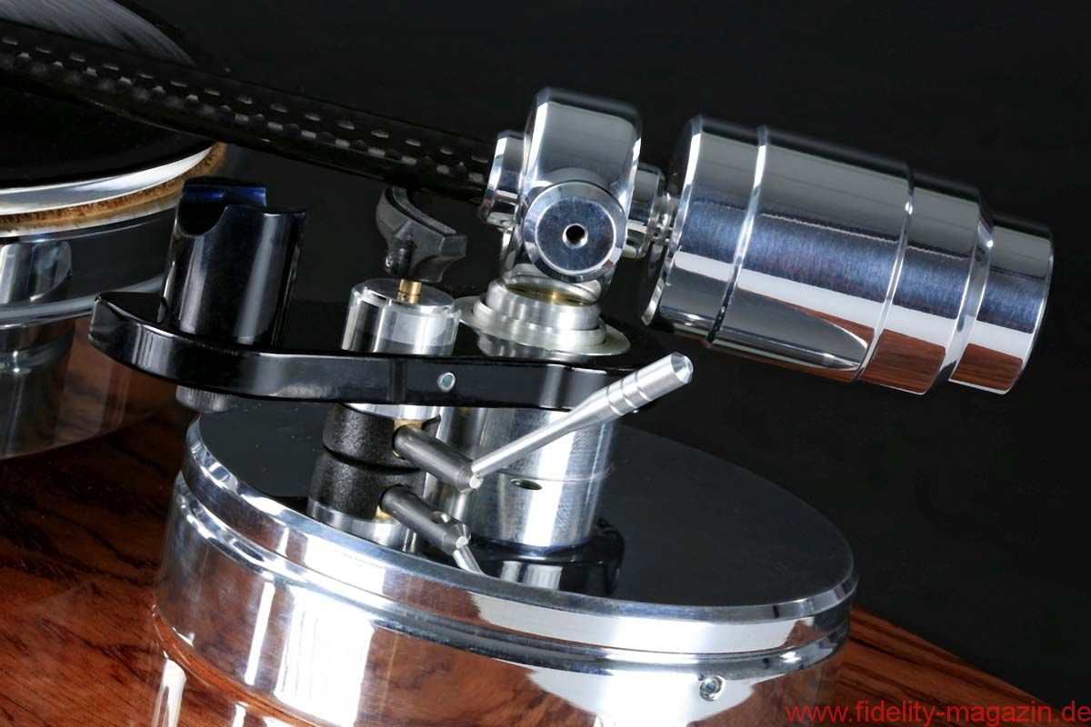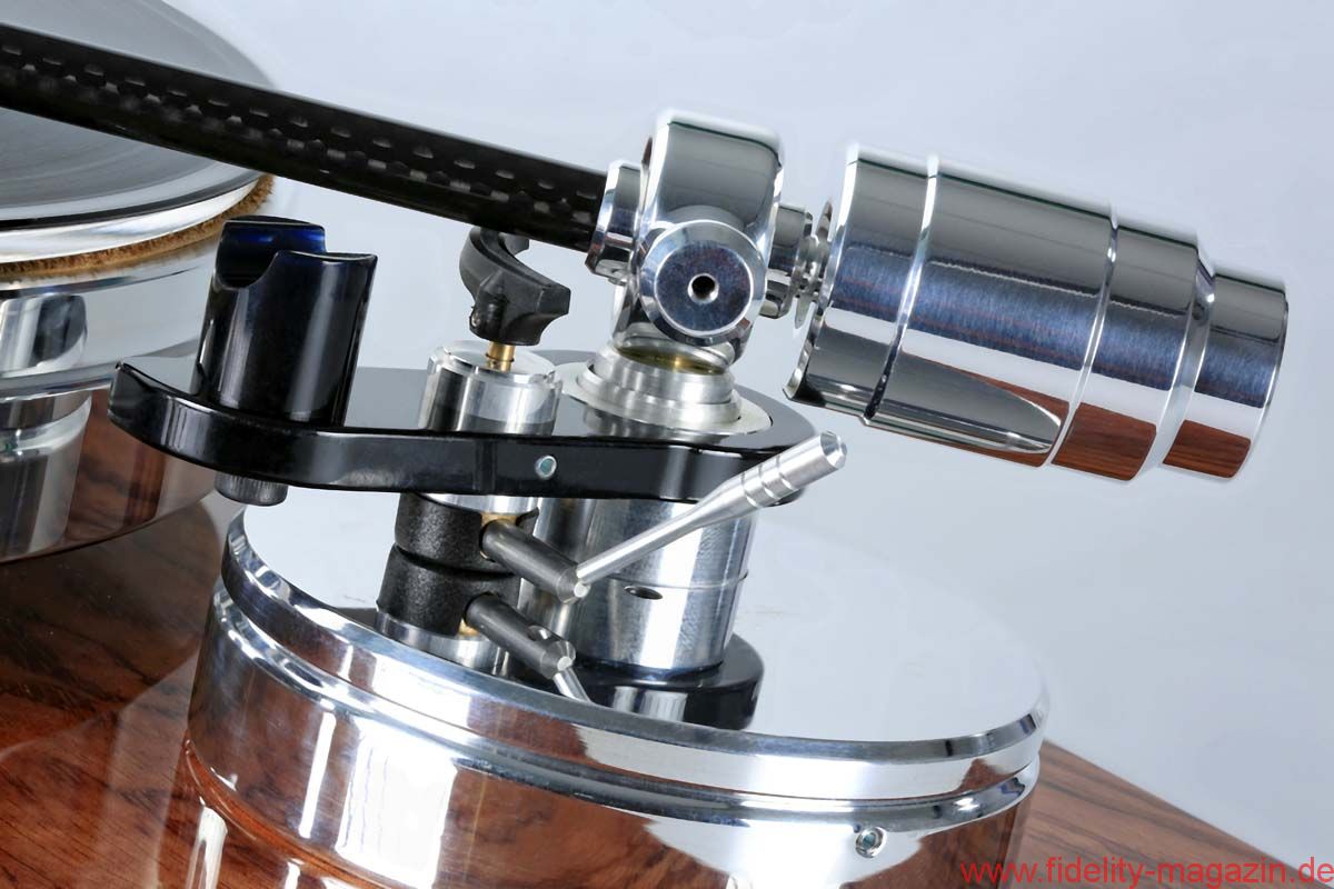 Nicht im Bild: die Justage einer Antiskating-Vorrichtung. Denn die gibt es nicht. Zu Sinn und Zweck einer solchen mögen unterschiedliche Ansichten existieren. Zum Lieferumfang jedenfalls gehört ein sechsseitiges Rechtfertigungsschreiben auf DIN A4, in dem die Sicht des Herstellers akribisch erläutert wird. In Kurzfassung: Die Skatingkraft, welche die Nadel auf die Rilleninnenseite drückt und im Extremfall darüberspringen lässt, werde überbewertet und sei in der Praxis unerheblich. Antiskating-Vorrichtungen seien daher nicht nur nicht erforderlich, sondern könnten bewirken, dass die Nadel zu stark an die Außenrille geführt werde, zumal sich die in Frage kommenden Kräfte auf dem Weg in Richtung Mittelpunkt der Spirale fortwährend ändern. Zum Ende einer Platte könne es so zu Verzerrungen kommen.