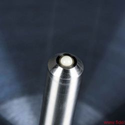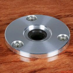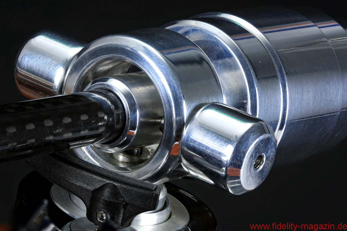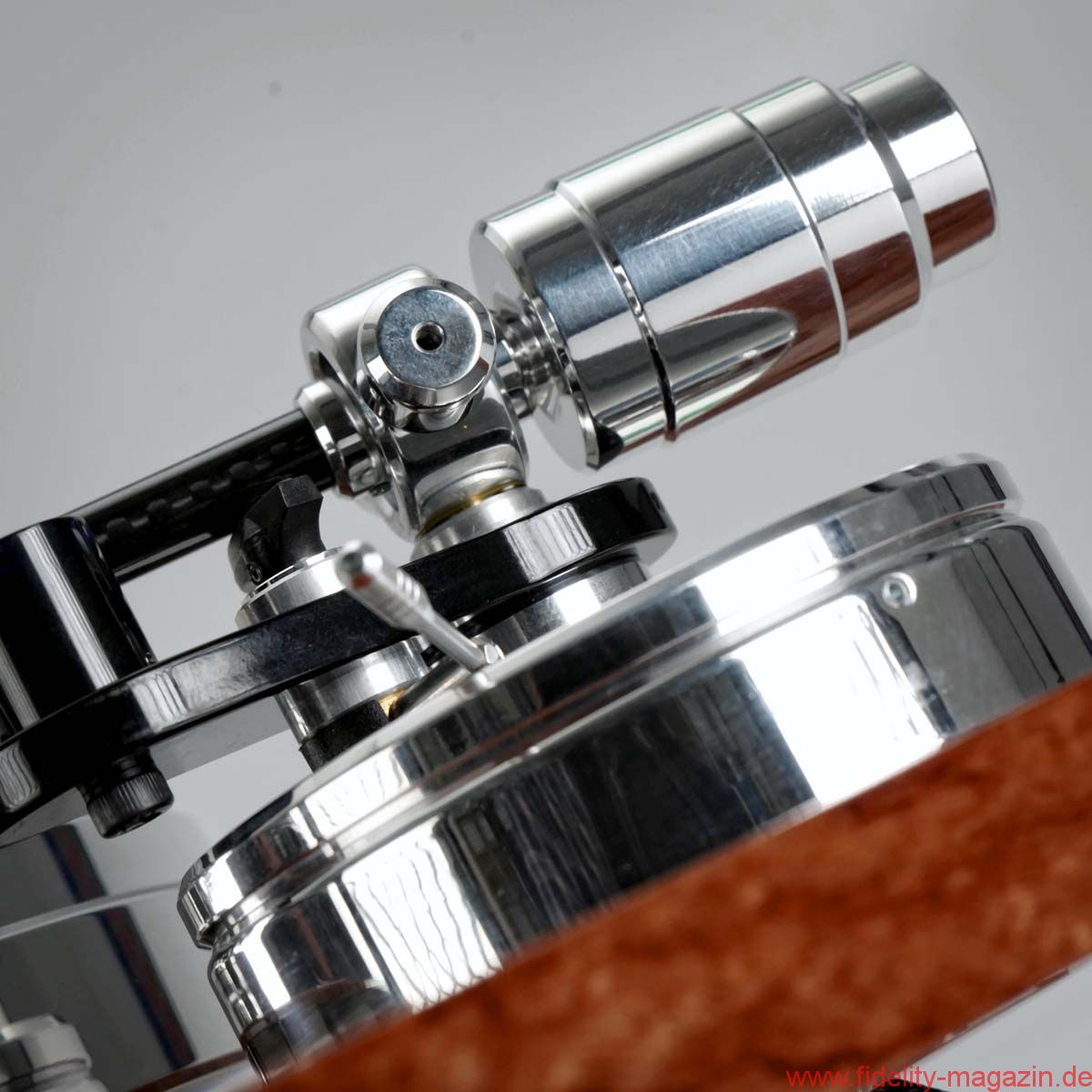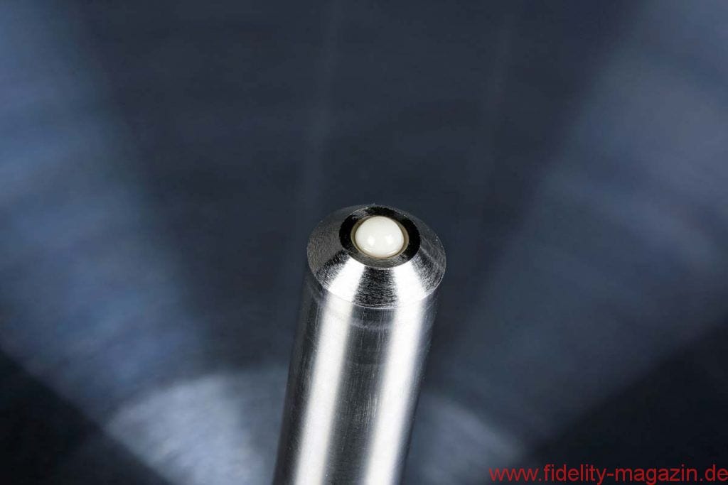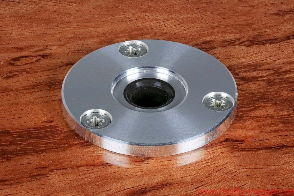No nonsense also, ganz wie man es von Acoustic Solid kennt. Der 113er verleugnet seine Herkunft nicht, das lässt die Konstruktion der Lagerbuchse erkennen, die aus einer Kunststoffmasse von besonderer Gleitfähigkeit sein soll. Wie nicht anders zu erwarten, passen Buchse und Zwölf-Millimeter-Achse perfekt ineinander. Die Lagerkugel aus Keramik ist in die Achse eingelassen und läuft auf einem Teflonspiegel. Ungewöhnlich, fast schon prätentiös scheint dagegen die Tellermatte aus farblich passendem, sehr schönem Leder, zu der sich eine Acrylauflage gesellt.