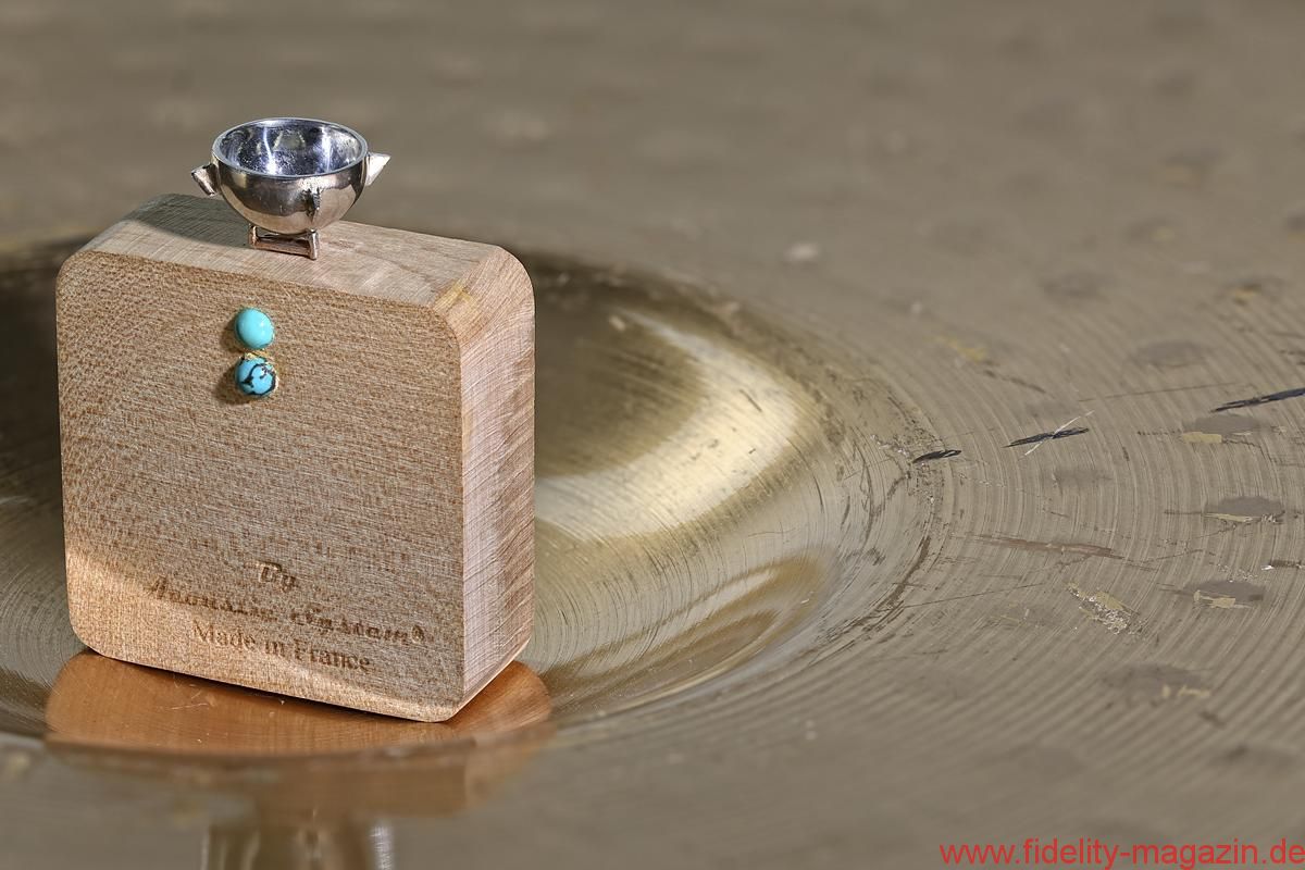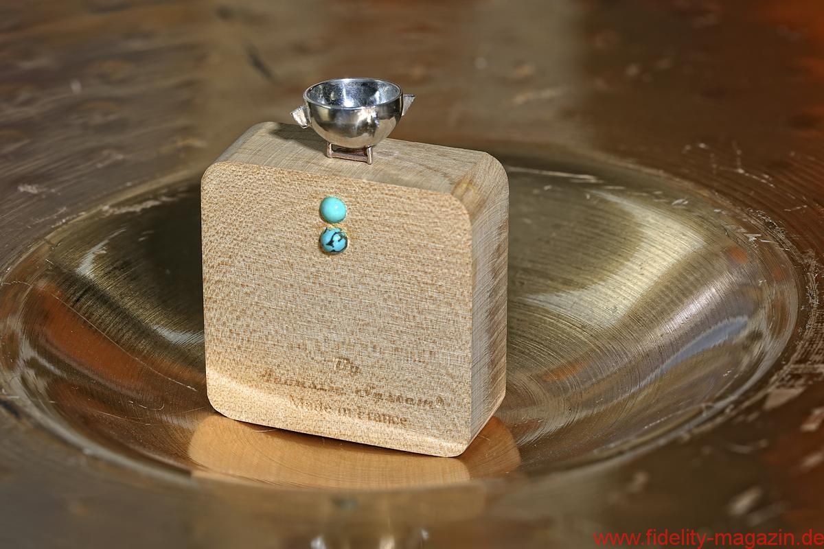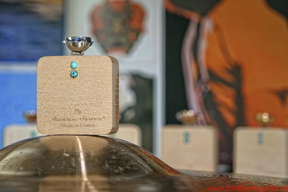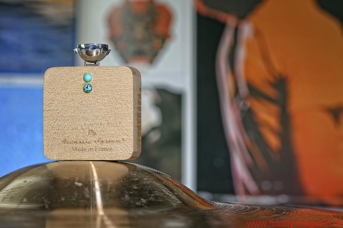 Die Ahornständer gibt es in einer dicken Ausführung für die Edelmetalle und einer etwas weicheren, dünnen Version. Mit ein wenig BluTack oder etwas Ähnlichem pinnt man sie so an die Wand, dass sie sie nicht direkt berühren, denn sie sollen ja frei schwingen und diese Schwingungen über einen metallenen Dreizack auf die darauf postierten Resonatoren übertragen können. Wenn ich Franck Tchang böswillig interpretiere, sind sie nichts als eine große Luftnummer. Sie interagieren mit Luftmolekülen und formieren sie neu: Aus langen Wellen werden kurze, aus Überdruck Strahlkraft. Als passive Resonatoren benötigen sie, anders als beispielsweise ein Schumann-Generator, Fremderregung, um aktiv zu werden. Dann agieren sie allerdings als Sekundärschallquellen, die vornehmlich Obertöne hinzufügen. Für mein Empfinden wirken sie sich aber durchaus schon im hörbaren Bereich aus, in dem das Ausschwingen von Saiten oder das Verklingen von Stimmen kurz vor dem Fade-out noch einen Extra-Kick bekommt. Als Hörer fühlt man sich dabei wie ein akustischer Restlichtverstärker. Wenngleich das nach einem Argument der Gegner klingt, sollte man es undogmatisch betrachten. Richtig dosiert vermittelt dieser Effekt eine phantastische Natürlichkeit und Harmonie. Ich stehe vor dem Paradoxon, deutlich das Artefakt zu hören, es aber als grundsätzlich richtiger zu empfinden. („Ja, ich weiß Bescheid. Zur Tür raus, linke Reihe anstellen. Jeder nur ein Kreuz.“)