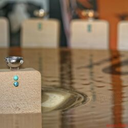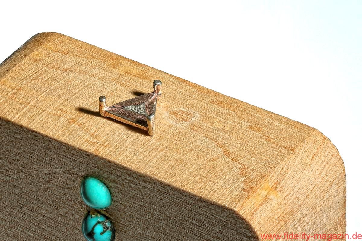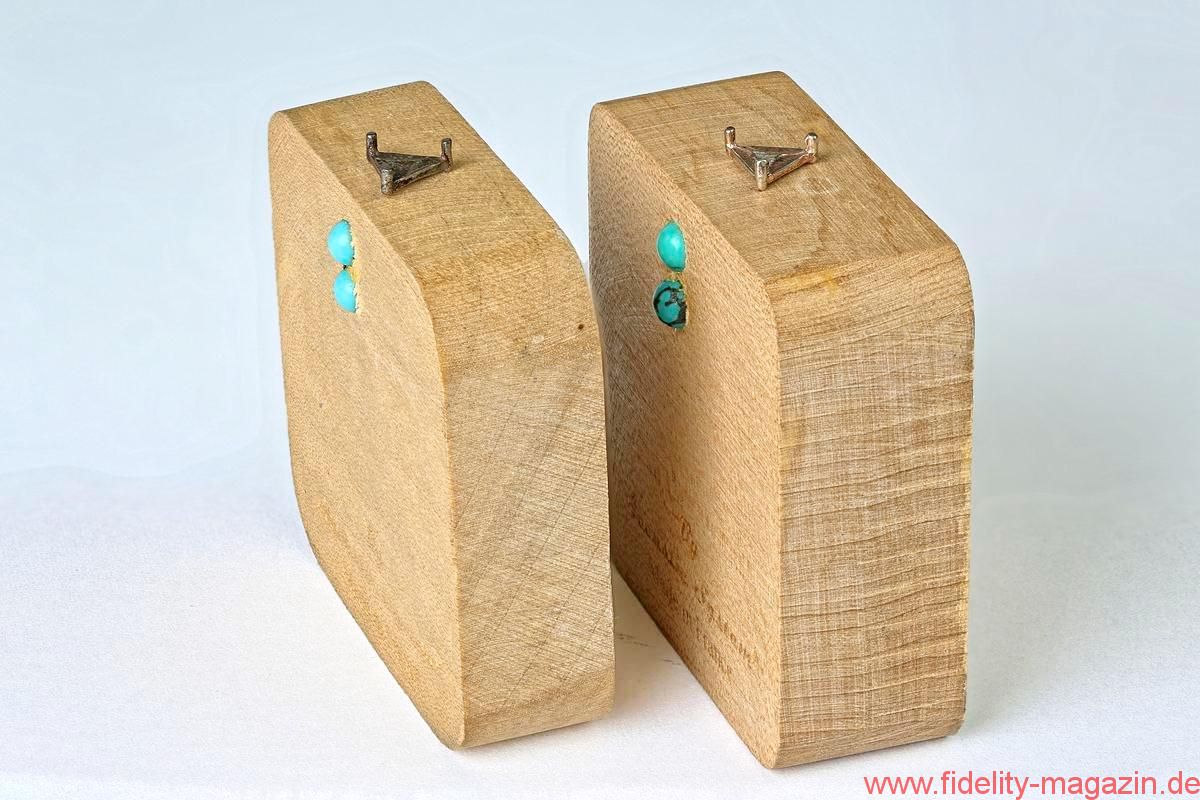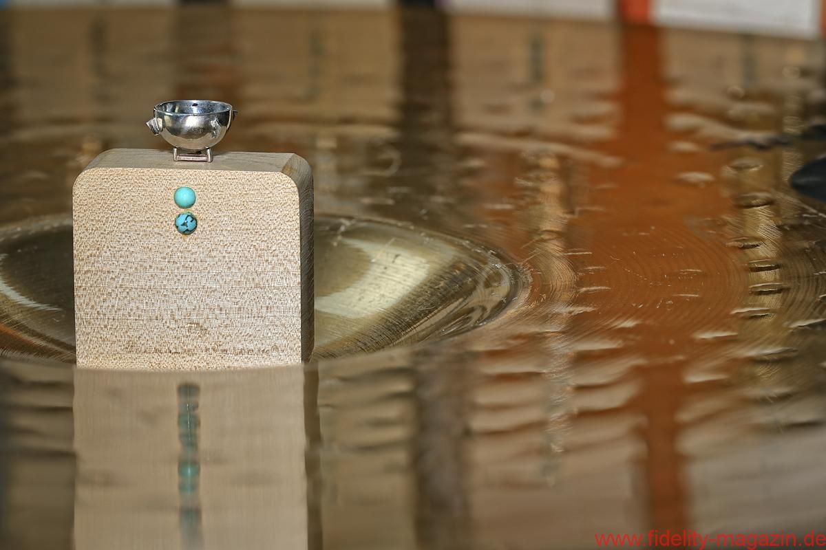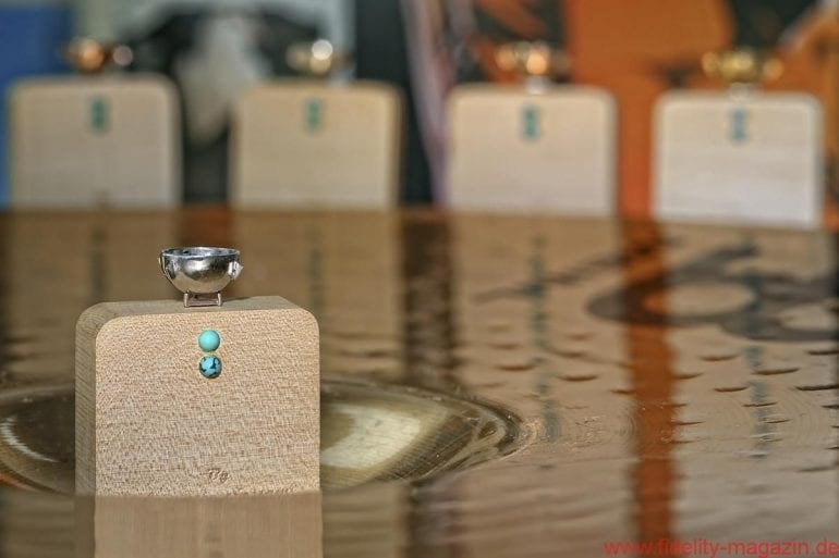 Die Ahornständer gibt es in einer dicken Ausführung für die Edelmetalle und einer etwas weicheren, dünnen Version. Mit ein wenig BluTack oder etwas Ähnlichem pinnt man sie so an die Wand, dass sie sie nicht direkt berühren, denn sie sollen ja frei schwingen und diese Schwingungen über einen metallenen Dreizack auf die darauf postierten Resonatoren übertragen können. Wenn ich Franck Tchang böswillig interpretiere, sind sie nichts als eine große Luftnummer. Sie interagieren mit Luftmolekülen und formieren sie neu: Aus langen Wellen werden kurze, aus Überdruck Strahlkraft. Als passive Resonatoren benötigen sie, anders als beispielsweise ein Schumann-Generator, Fremderregung, um aktiv zu werden. Dann agieren sie allerdings als Sekundärschallquellen, die vornehmlich Obertöne hinzufügen. Für mein Empfinden wirken sie sich aber durchaus schon im hörbaren Bereich aus, in dem das Ausschwingen von Saiten oder das Verklingen von Stimmen kurz vor dem Fade-out noch einen Extra-Kick bekommt. Als Hörer fühlt man sich dabei wie ein akustischer Restlichtverstärker. Wenngleich das nach einem Argument der Gegner klingt, sollte man es undogmatisch betrachten. Richtig dosiert vermittelt dieser Effekt eine phantastische Natürlichkeit und Harmonie. Ich stehe vor dem Paradoxon, deutlich das Artefakt zu hören, es aber als grundsätzlich richtiger zu empfinden. („Ja, ich weiß Bescheid. Zur Tür raus, linke Reihe anstellen. Jeder nur ein Kreuz.“)